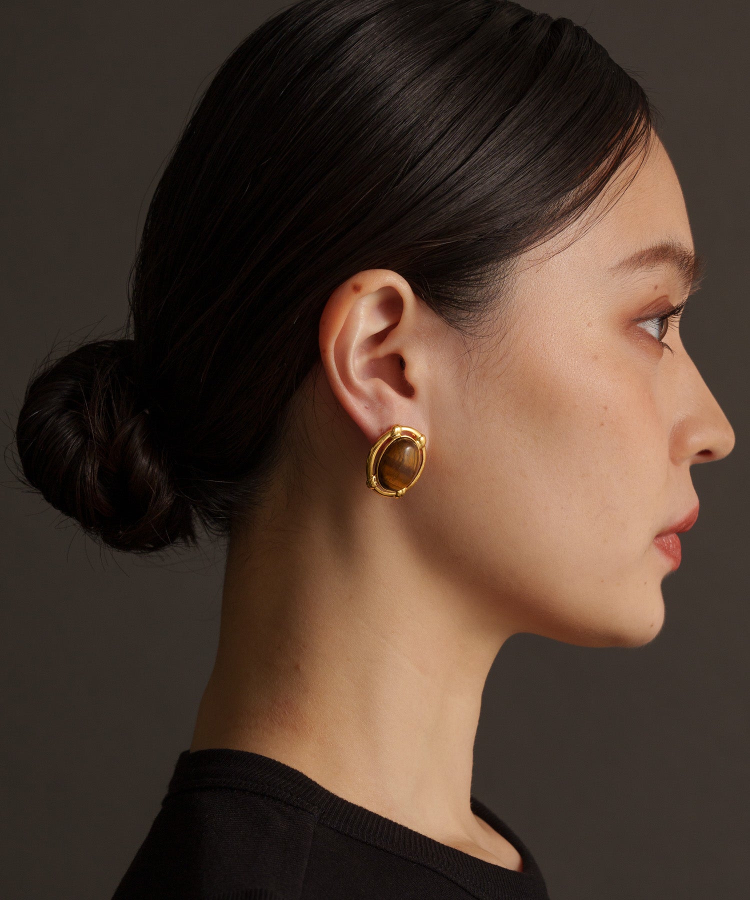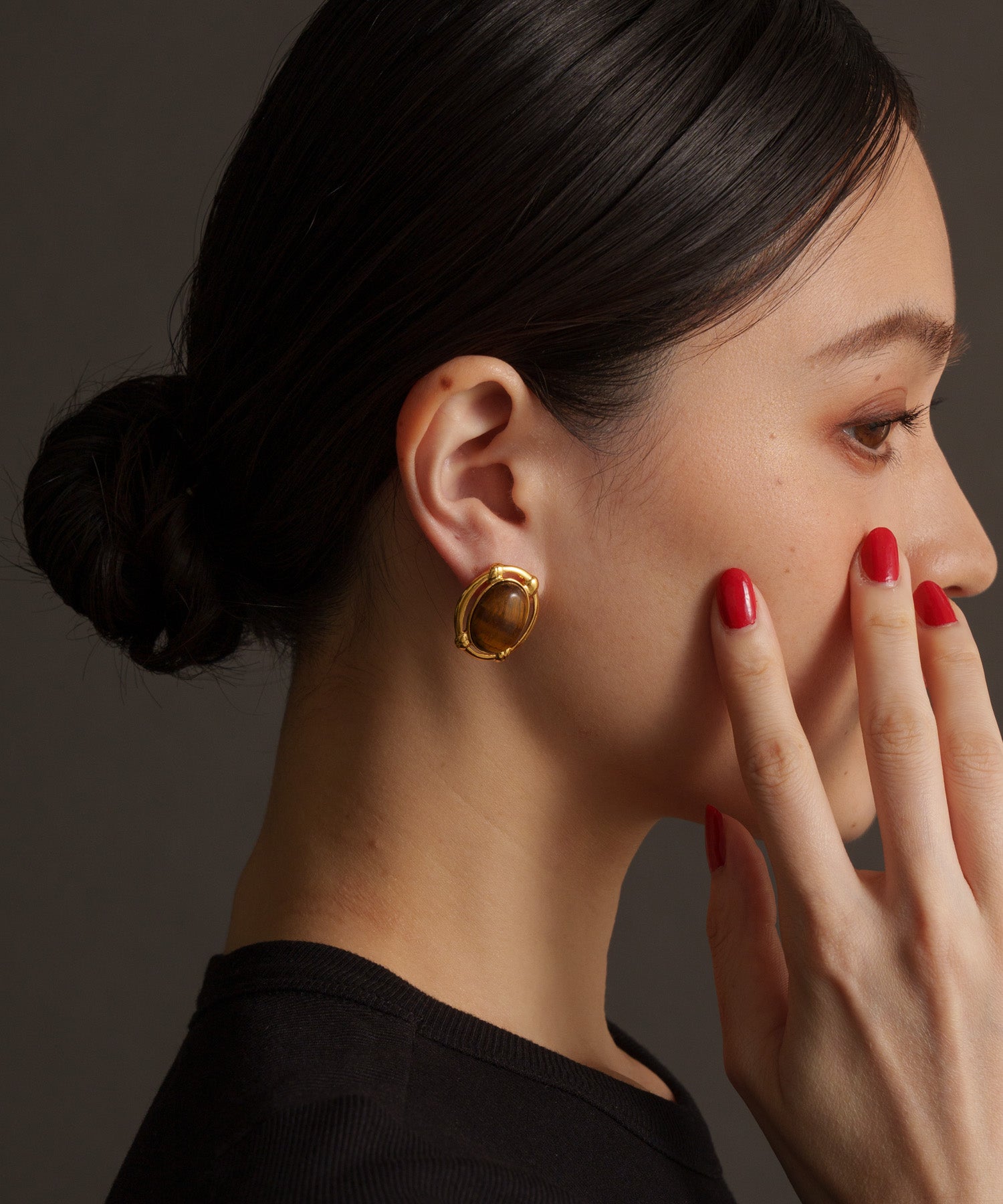 コーデの差し色にしやすいブラック、グリーン、ブラウンの3色ストーンをご用意しました。開けていなかった宝石箱から取り出したかのようなレトロなピアスです。