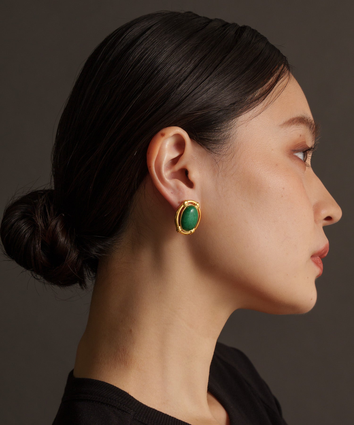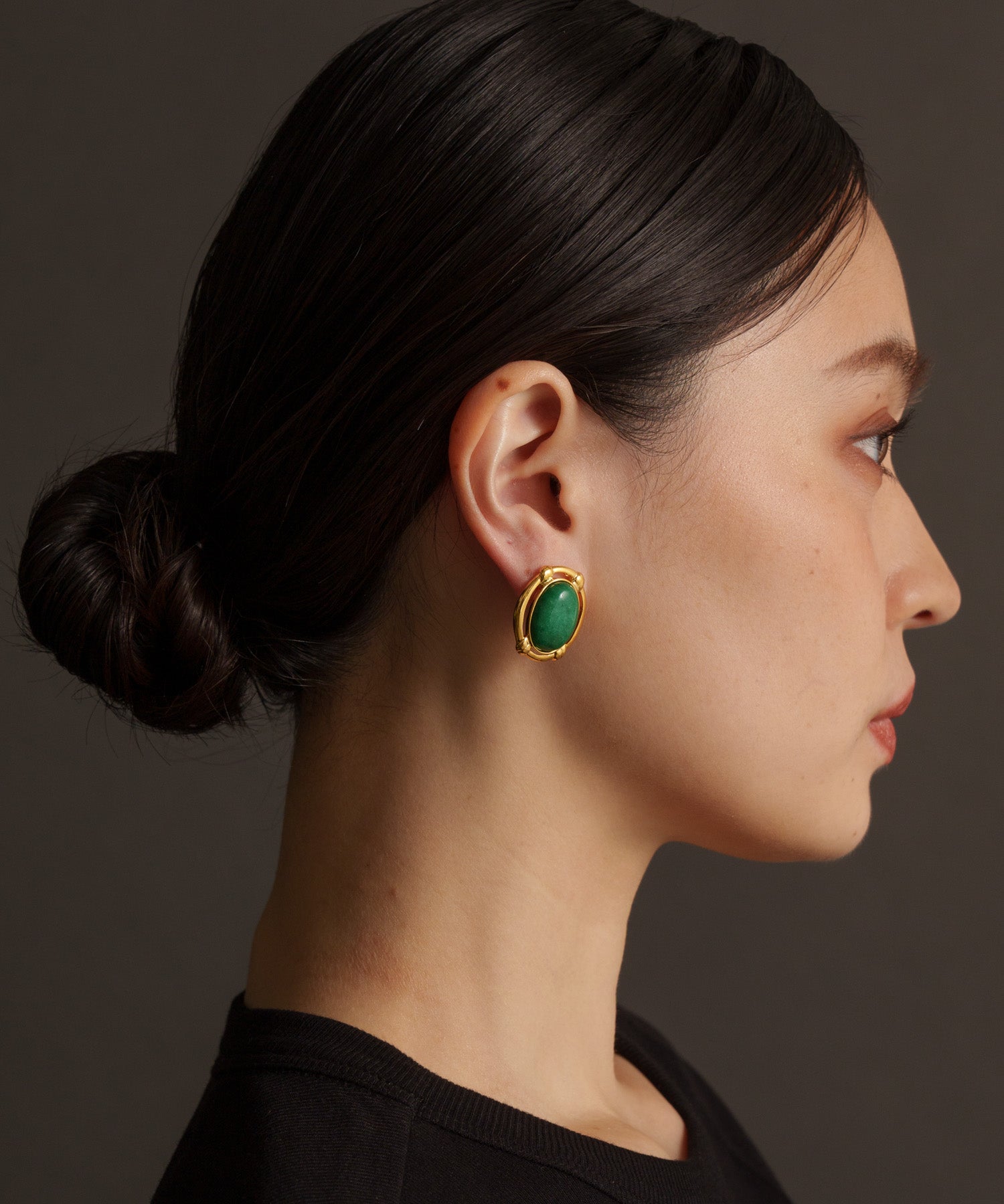 コーデの差し色にしやすいブラック、グリーン、ブラウンの3色ストーンをご用意しました。開けていなかった宝石箱から取り出したかのようなレトロなピアスです。