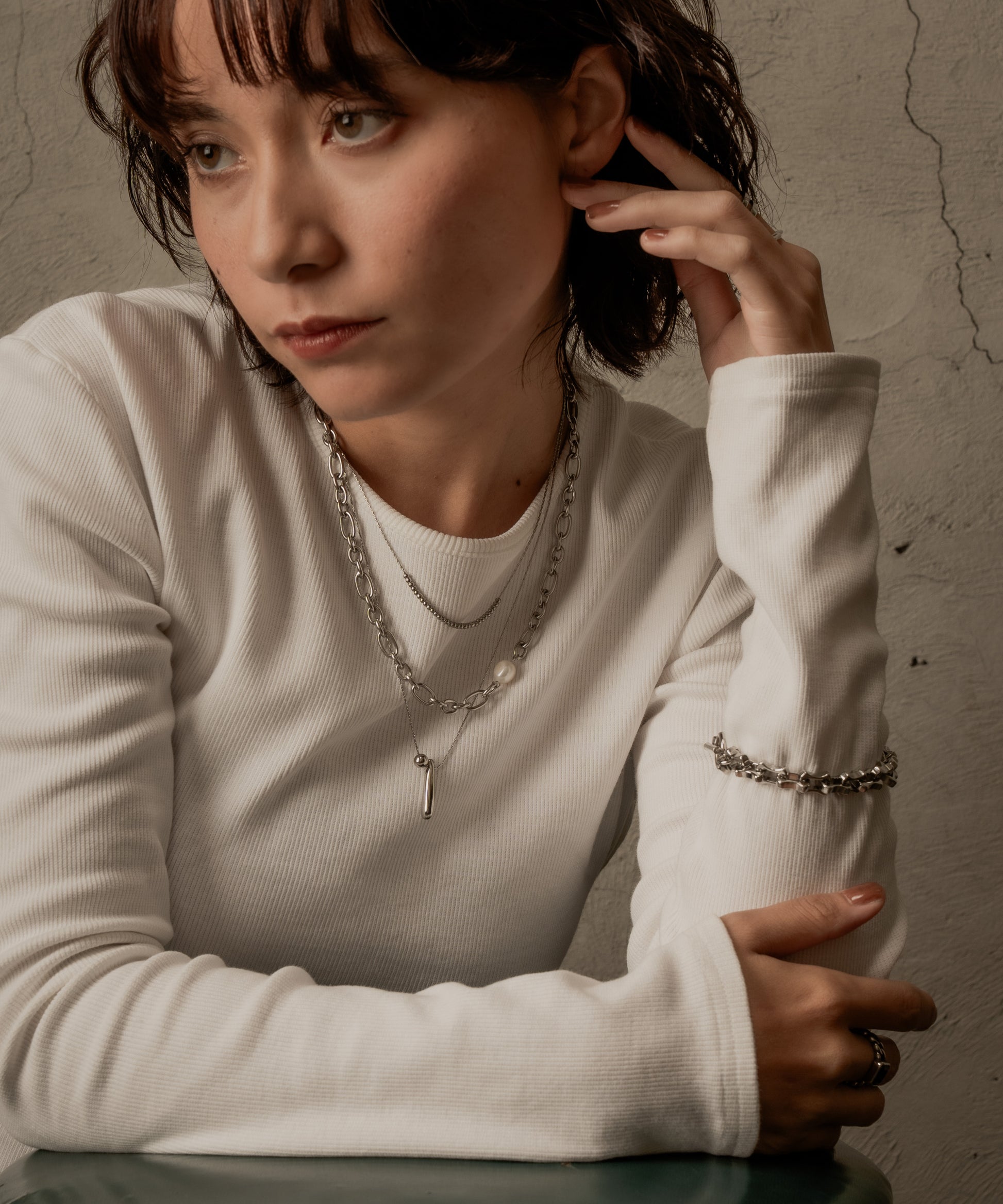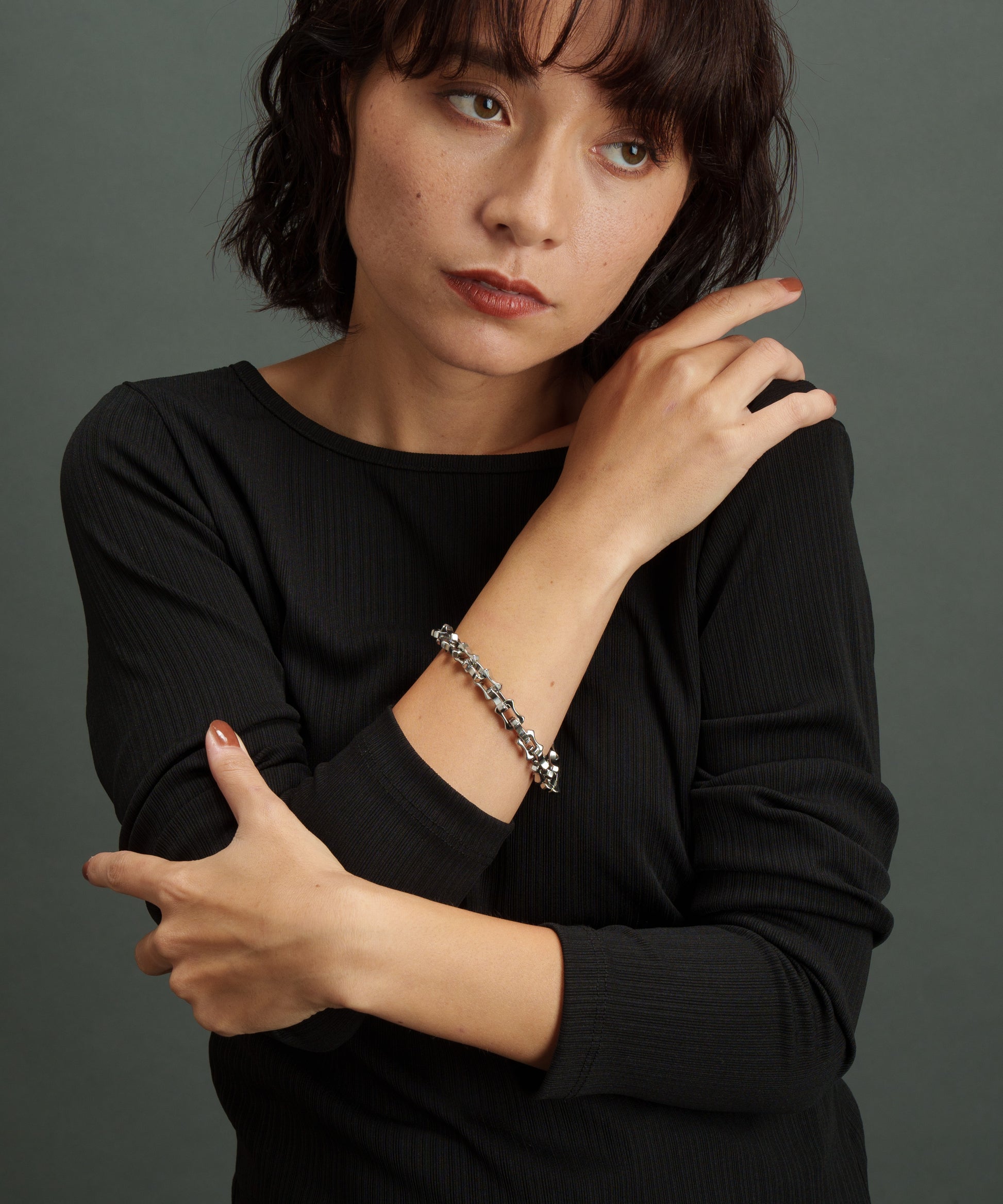 スクエアの両サイドを潰したようなパーツを連ねたブレスレット。個性的なフォルムが周りと差を付ける存在感を放ちます。