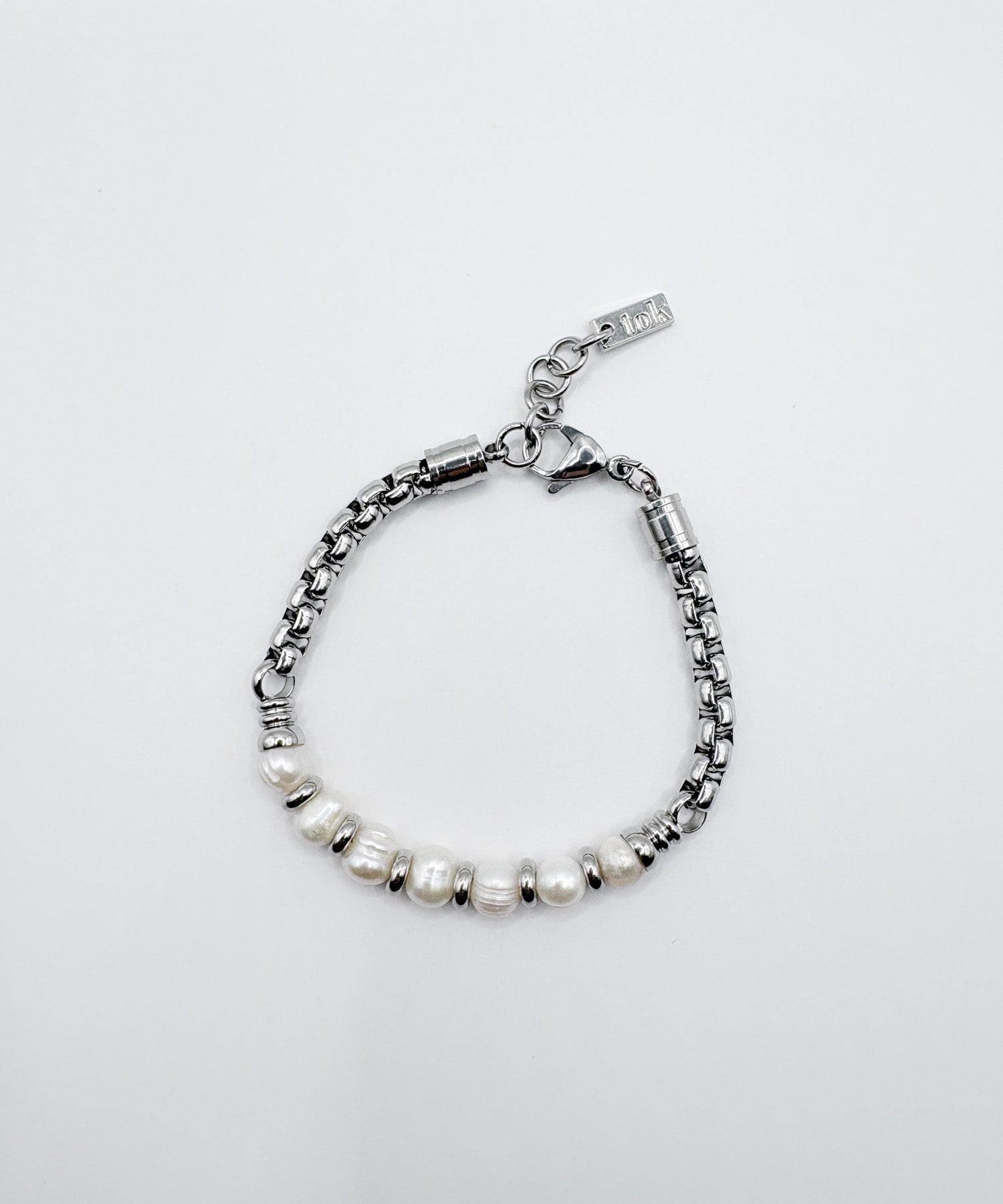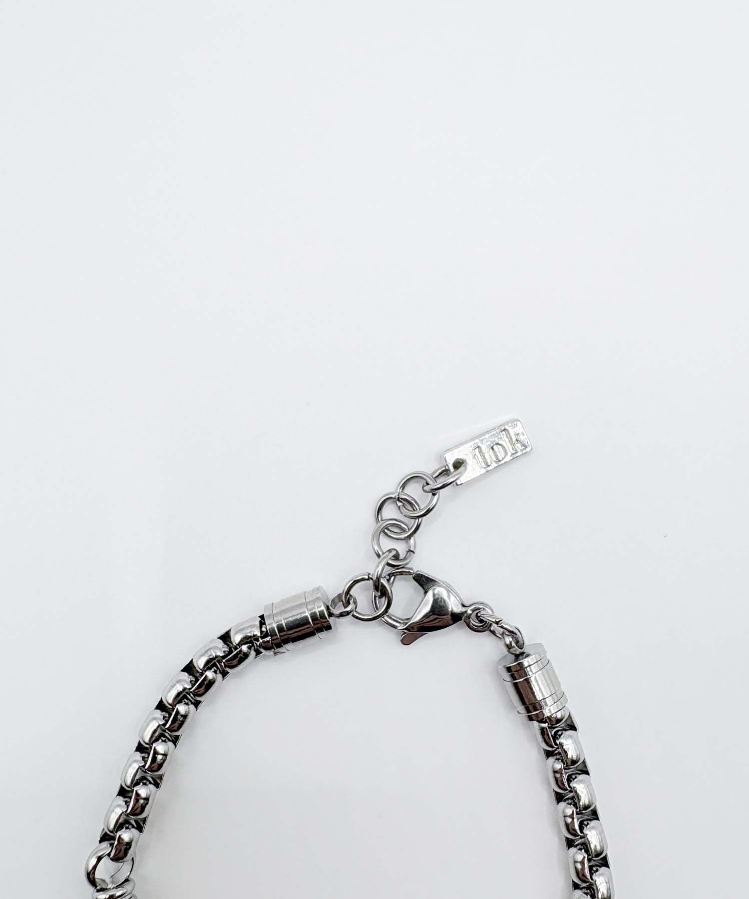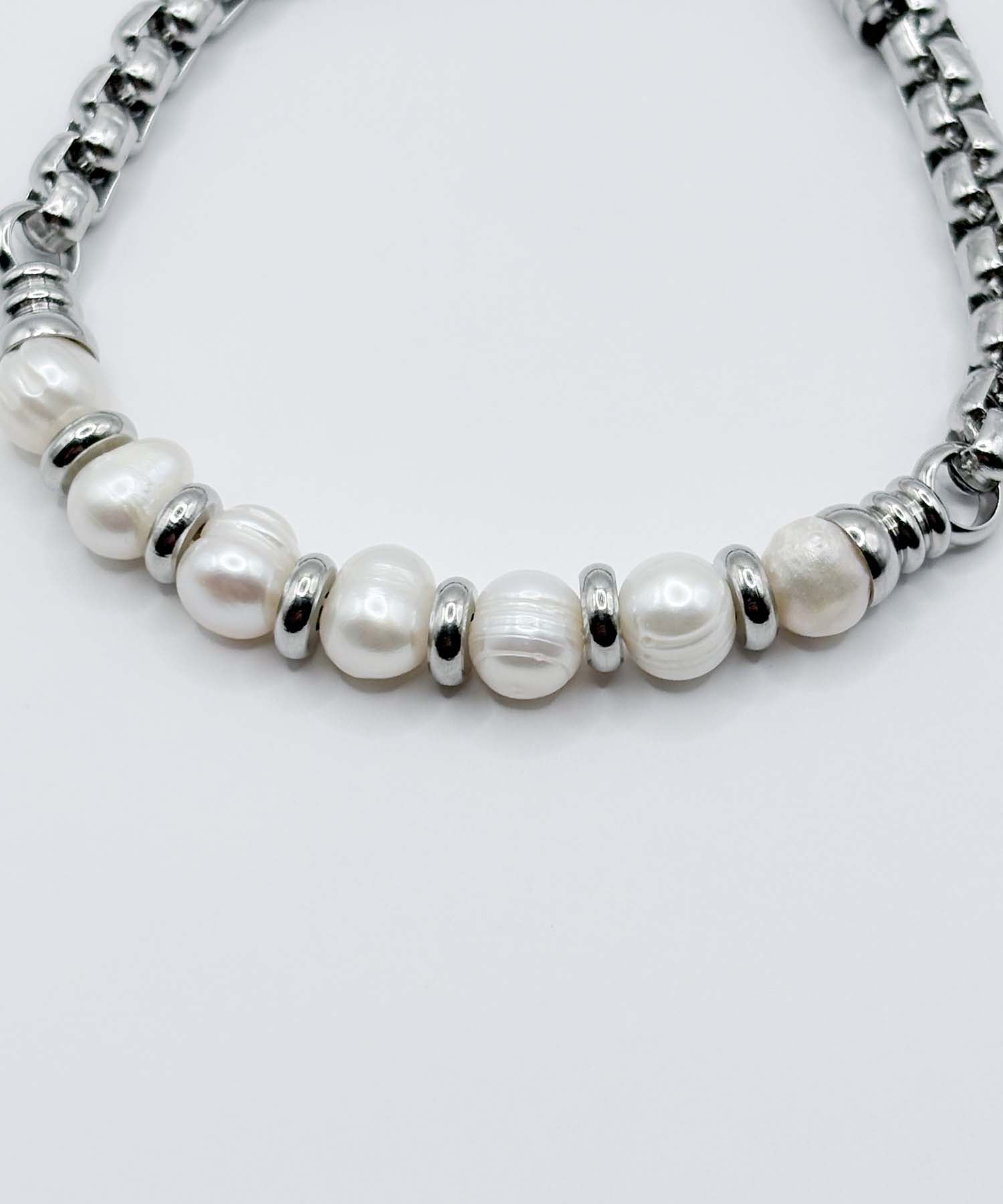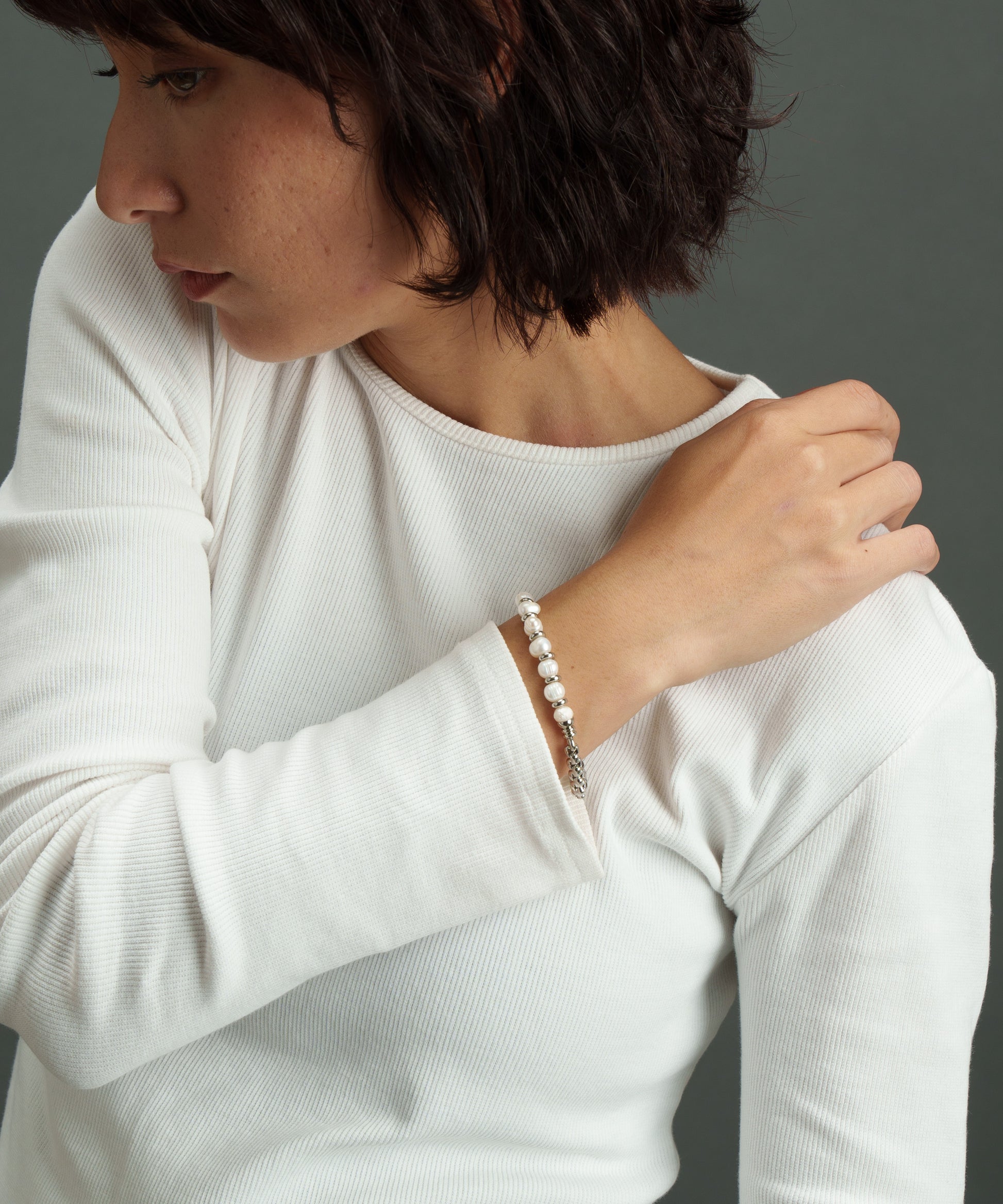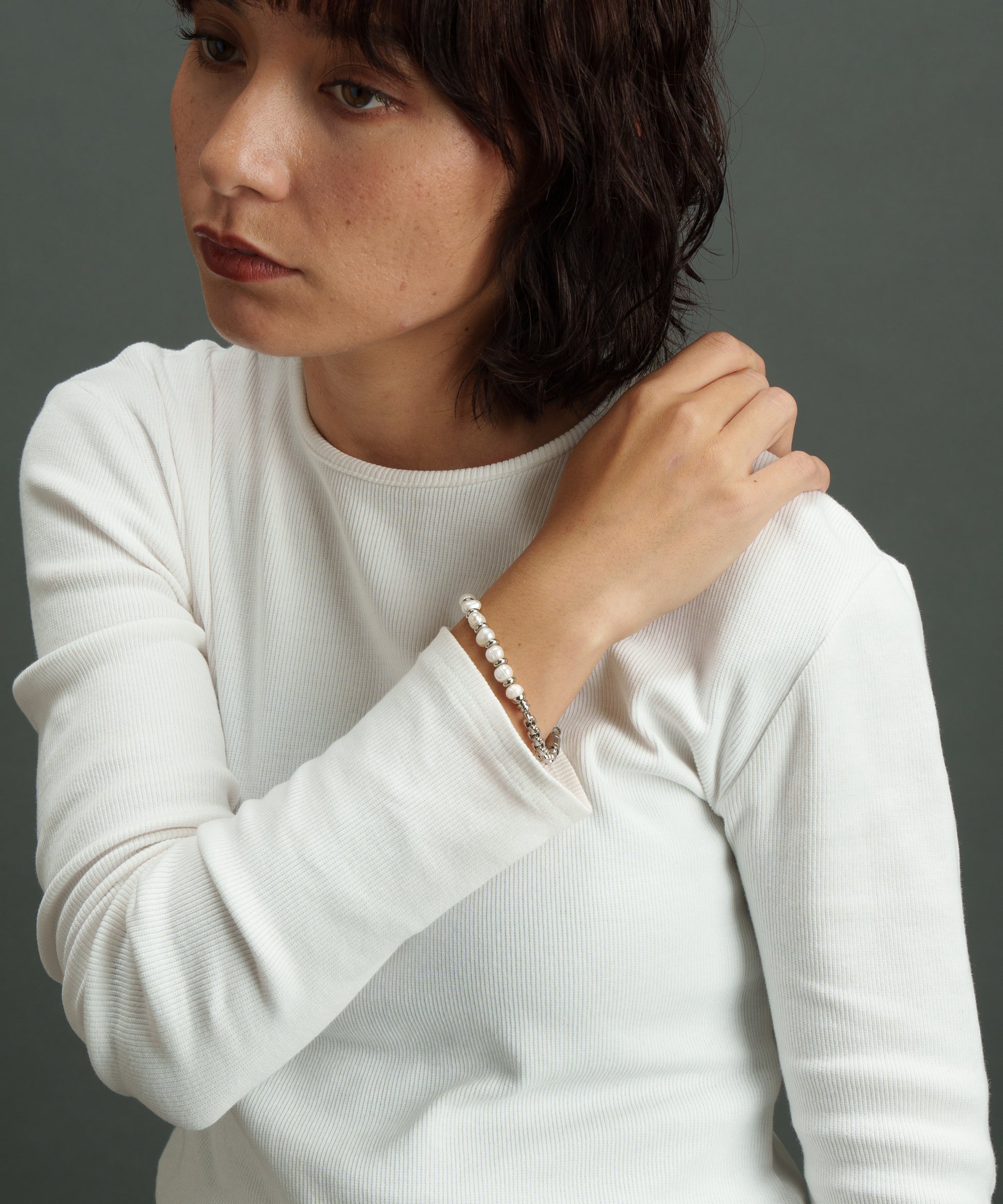 密度の高いボックスチェーンは重厚感があり無骨な印象を与えますが、上品なパールライクパーツを組み合わせることで、調和の取れたバランスに仕上げています。