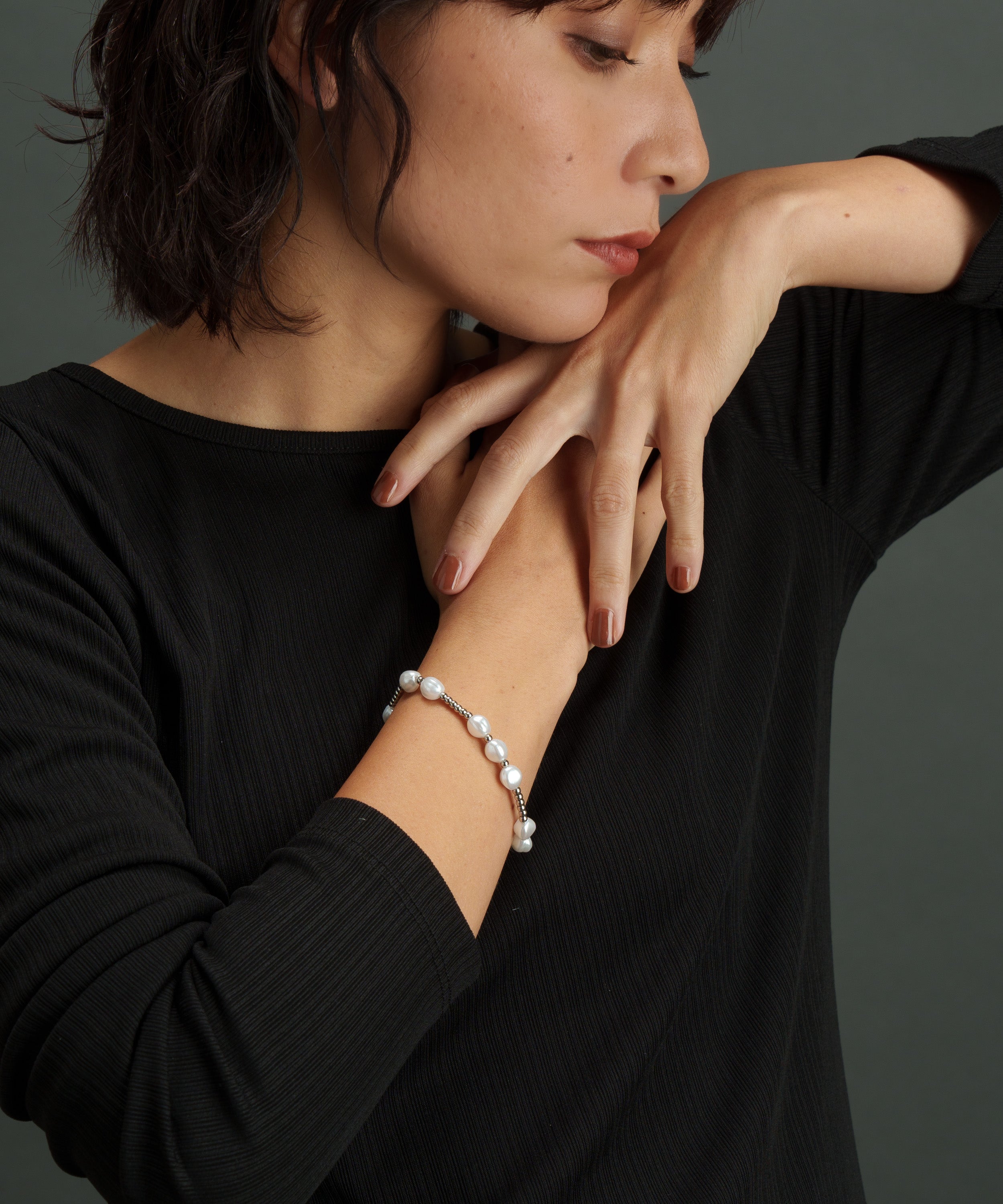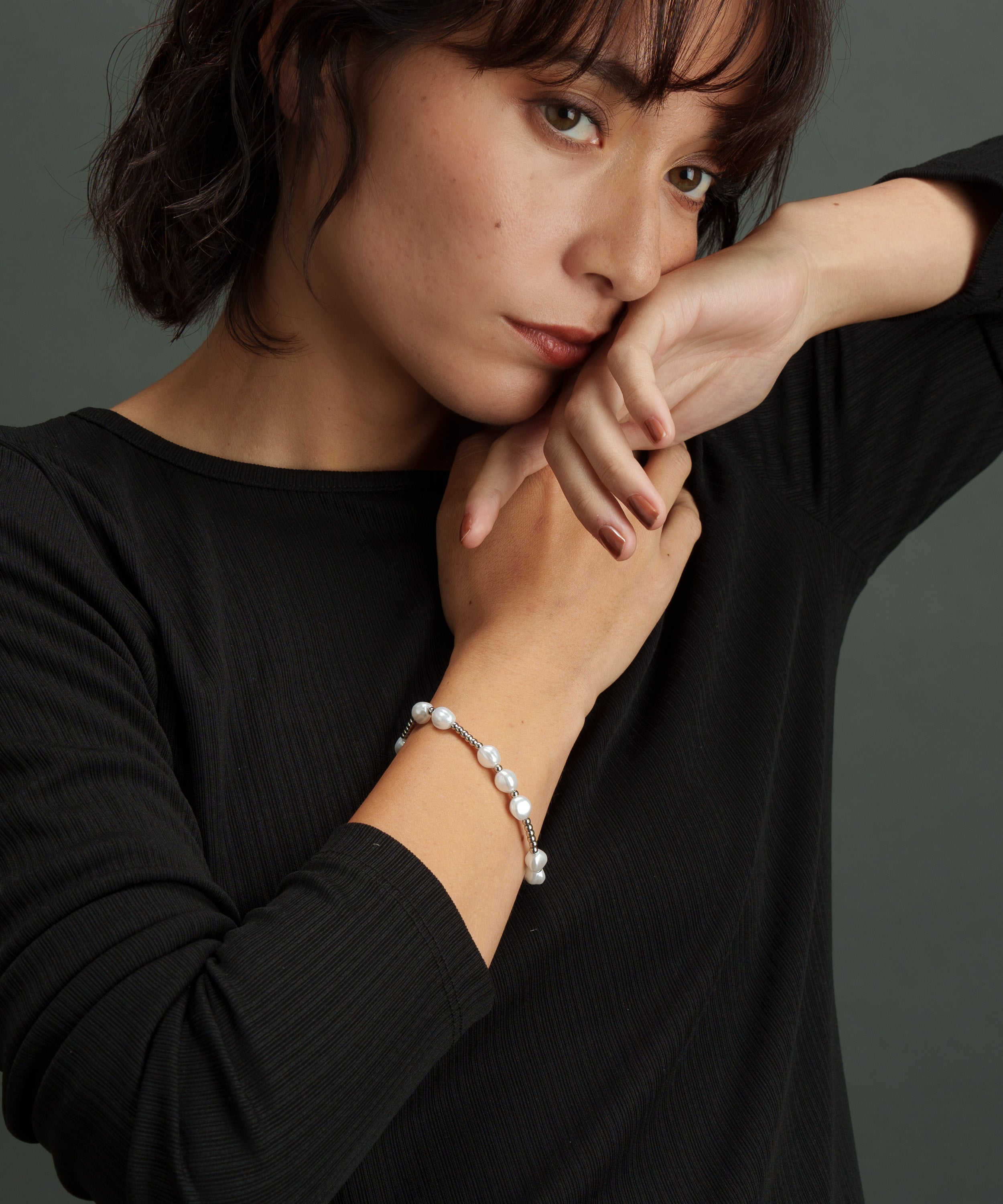 ボールチェーンにパールライクパーツをあしらったブレスレット。Tバーと丸カンで簡単に着脱できます。