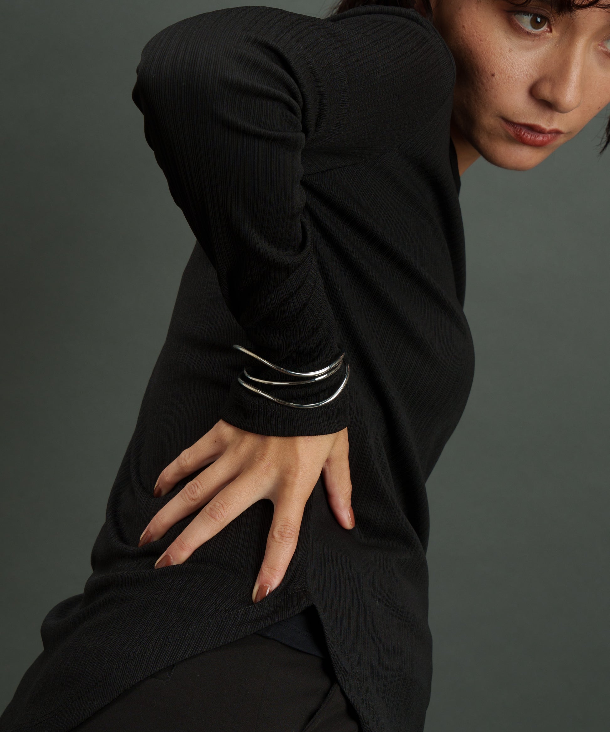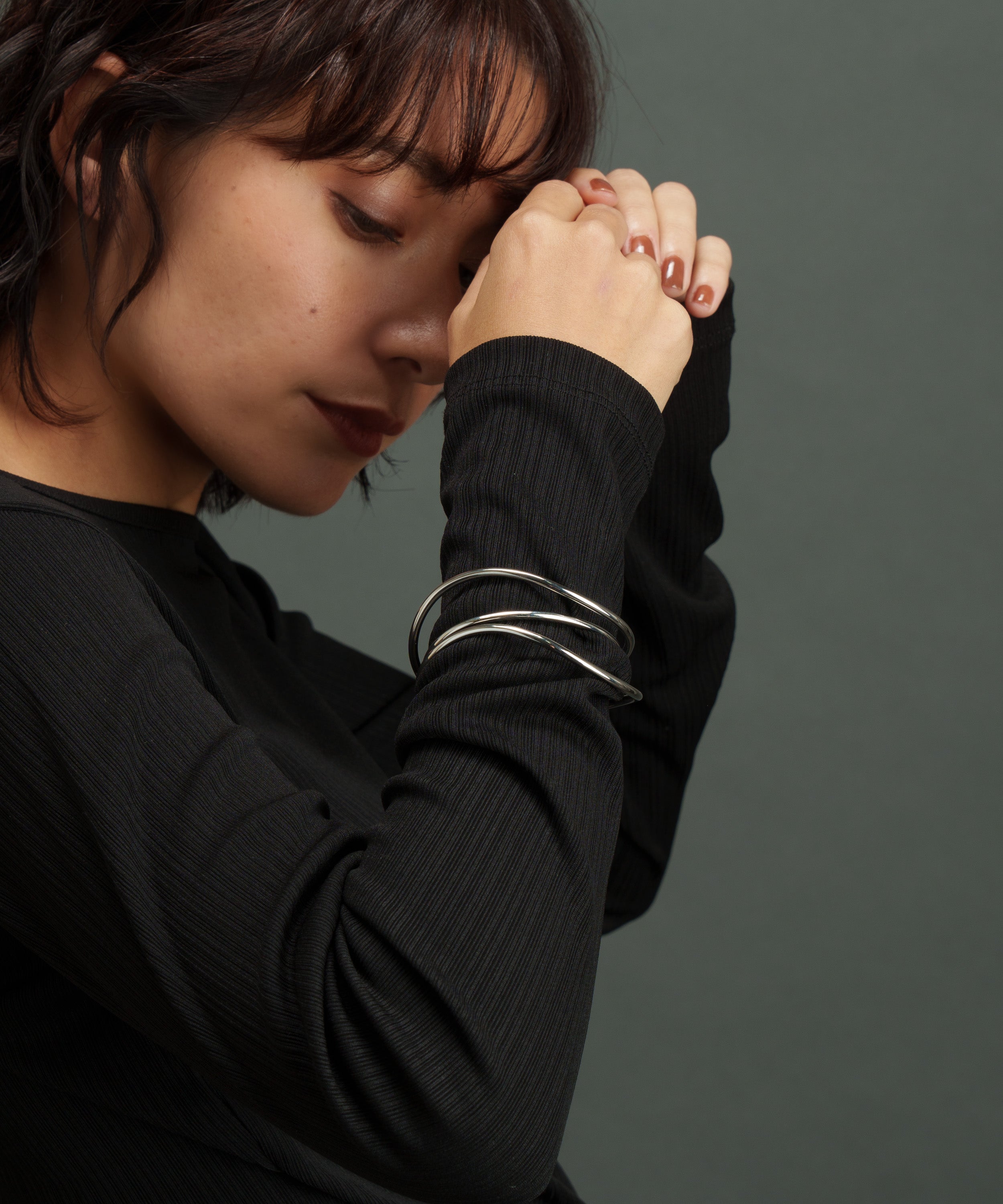 波打つようなラインで装飾を加えたバングル。秋冬には長袖の上から付けるスタイリングでこなれ感を。