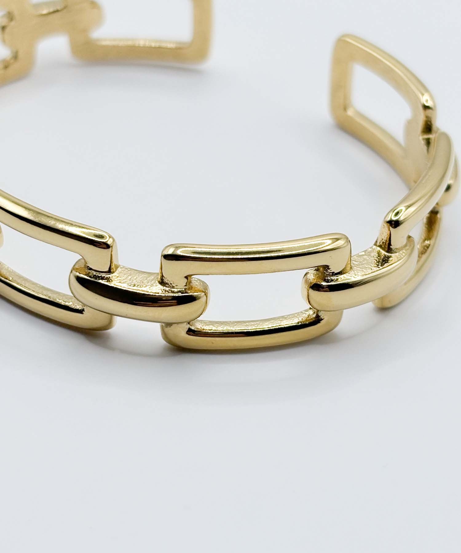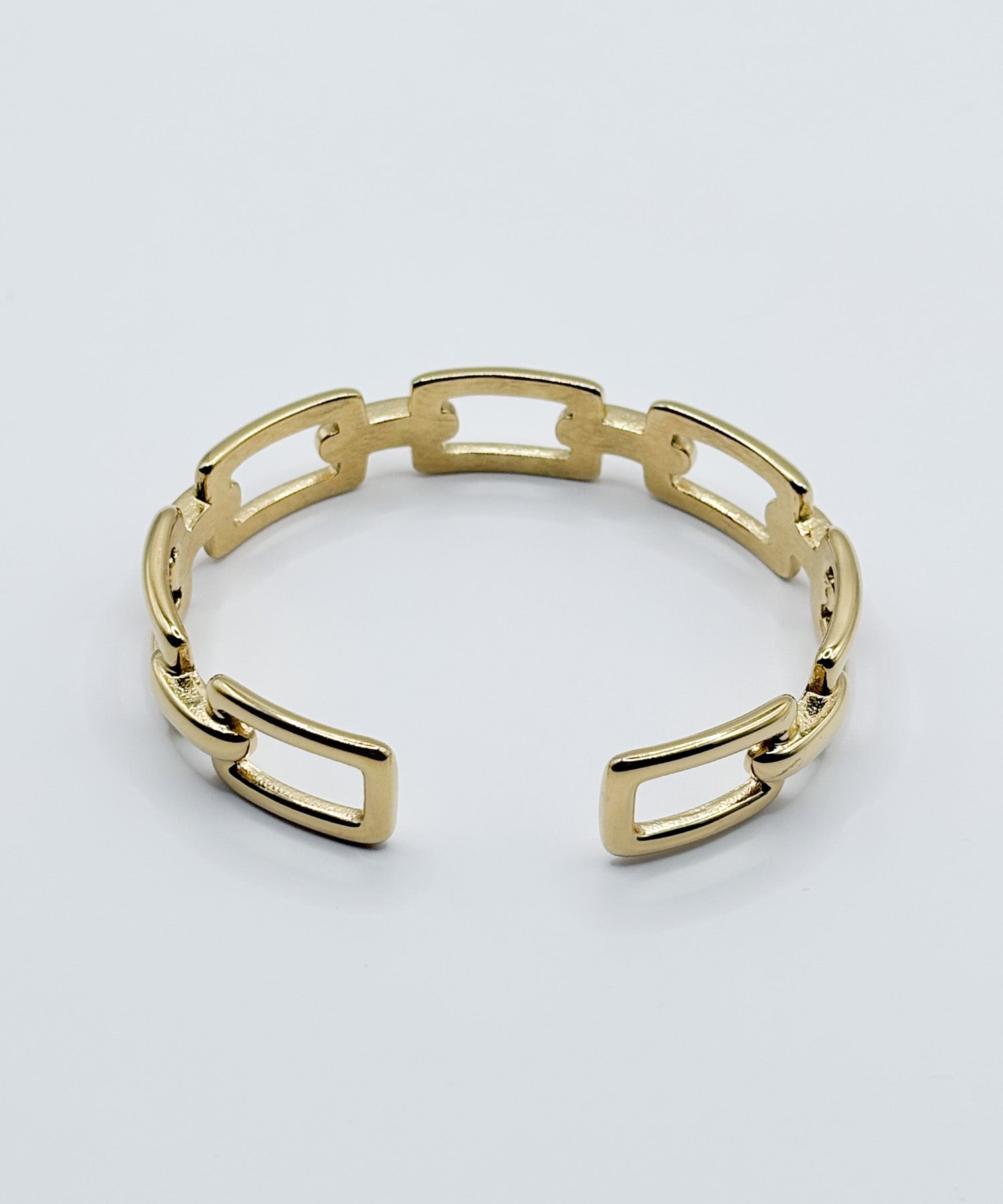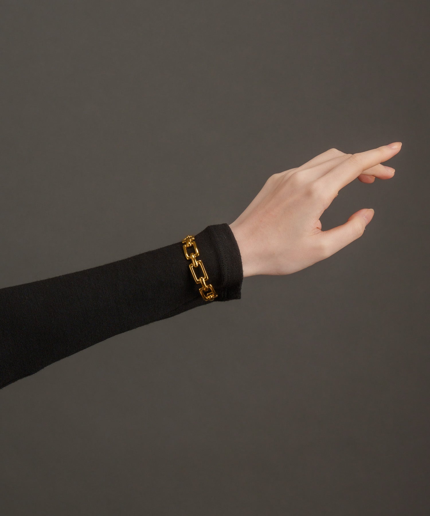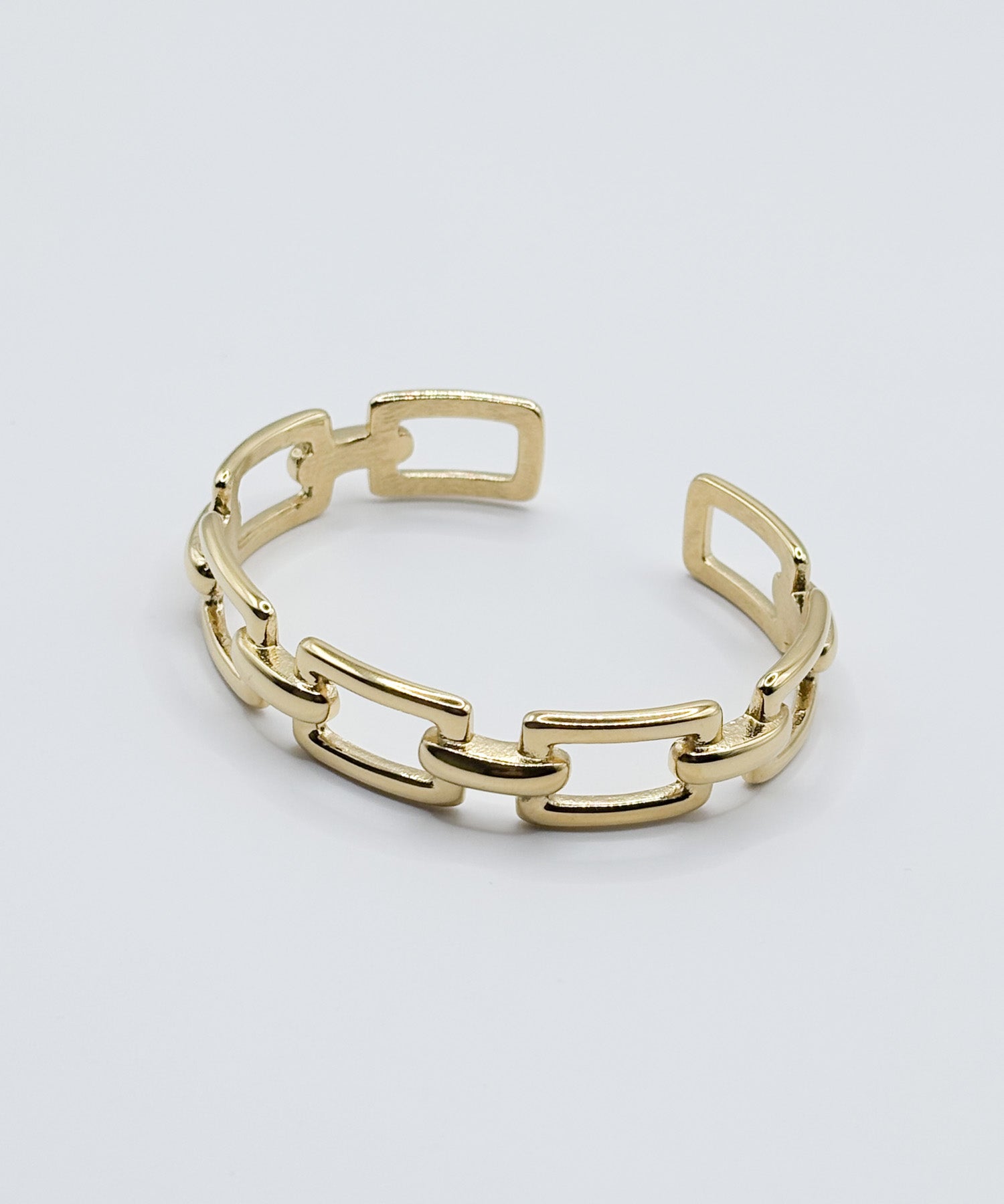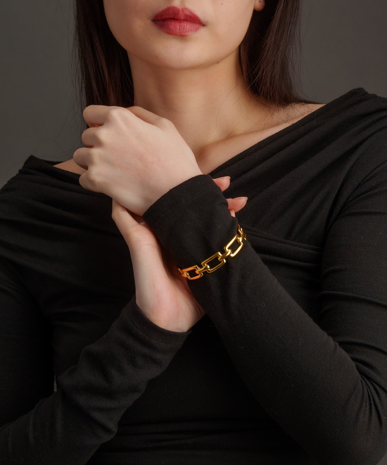 角ばったフォルムのチェーンが印象的な、スクエアチェーンバングル。シンプルながらも存在感があり、手元をすっきりと引き締めます。