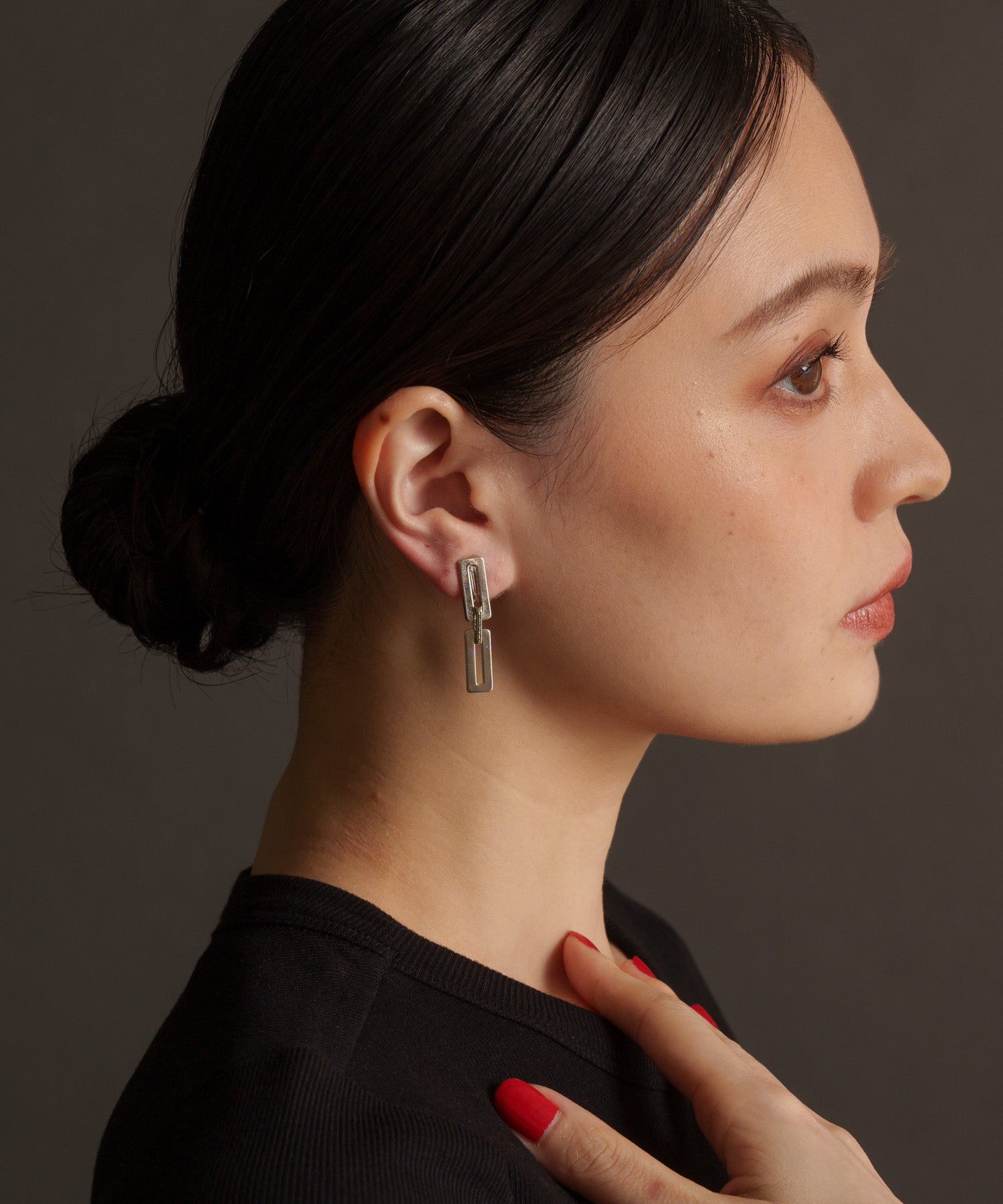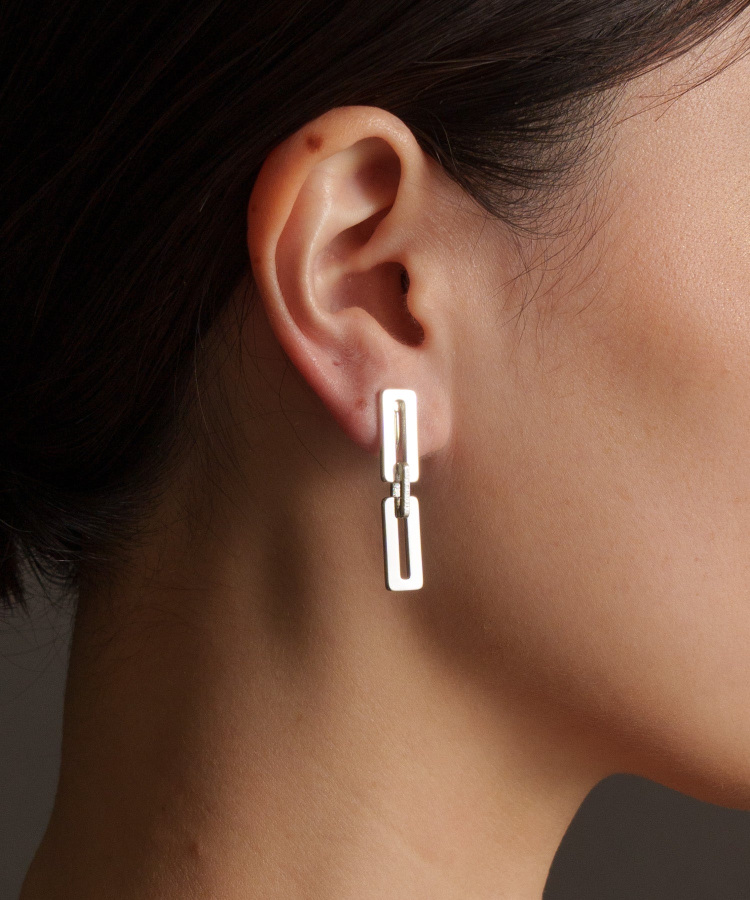 四角プレートが3つ連なったイヤリング。後ろがねじ式でしっかり固定することが出来ます。