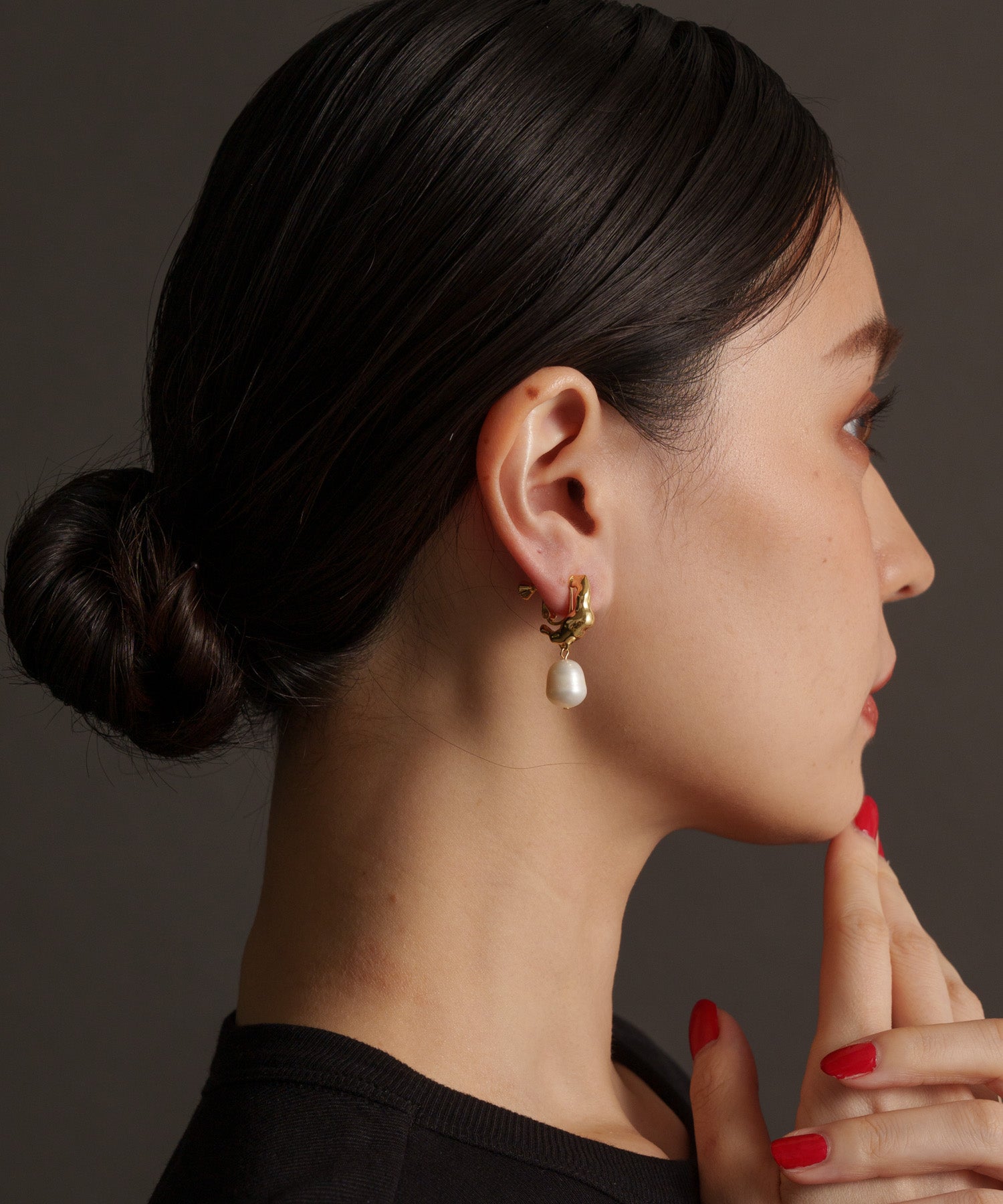 ゆらゆらと揺れ動く人工パールが目を引くデザインのイヤリング。歪なパールでラフさがありカジュアルコーデにもはまります。