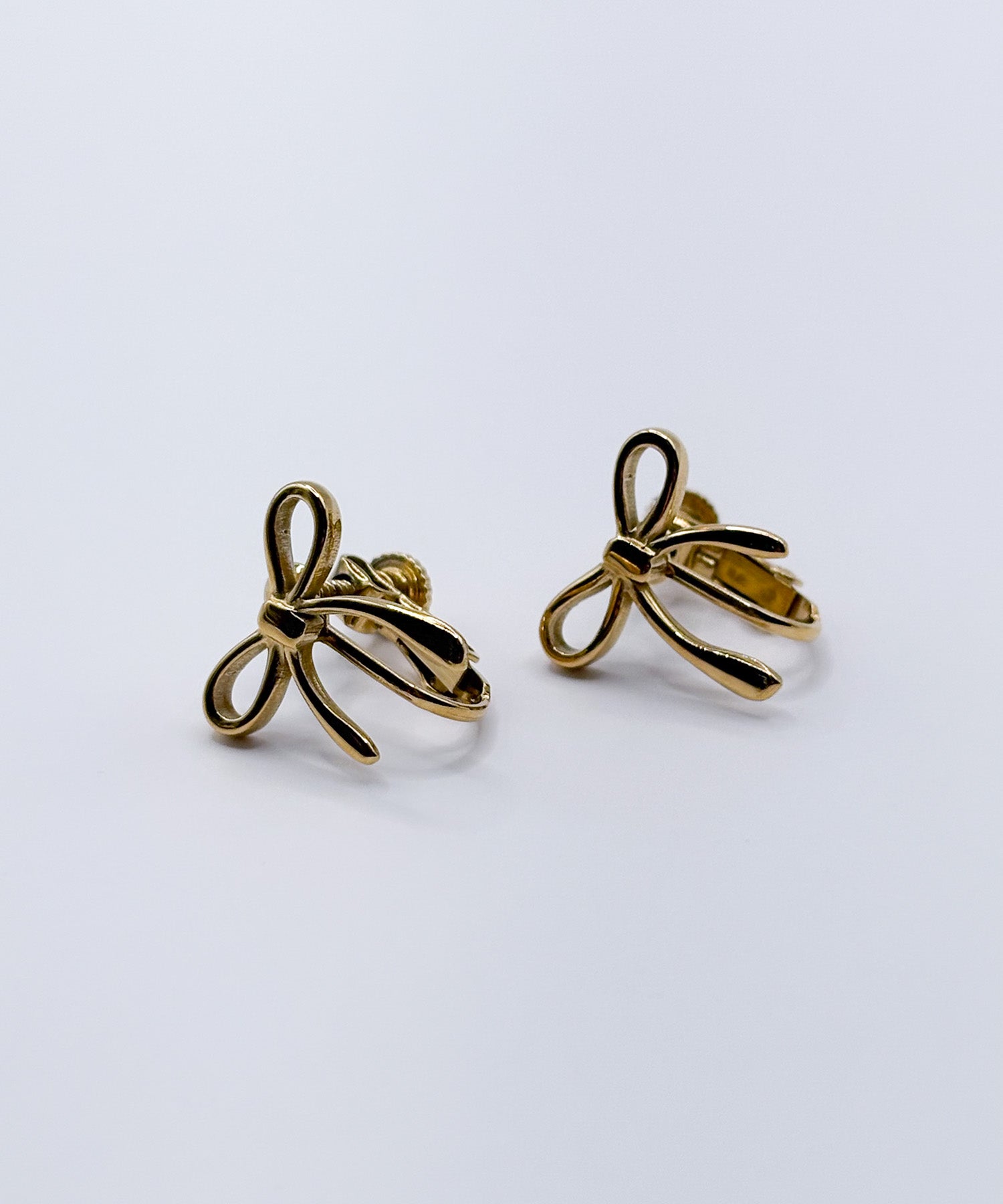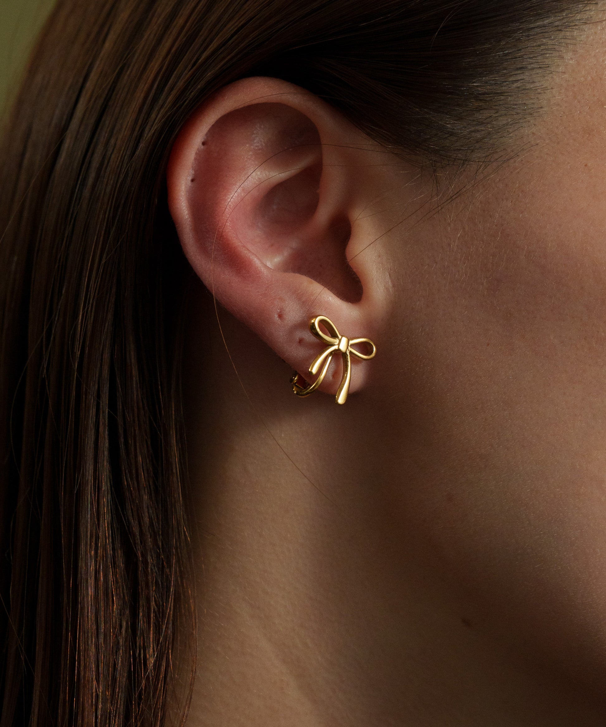 小ぶりなリボンが可愛らしいイヤリング。耳元にフィットするサイズ感でさり気ない遊びを。