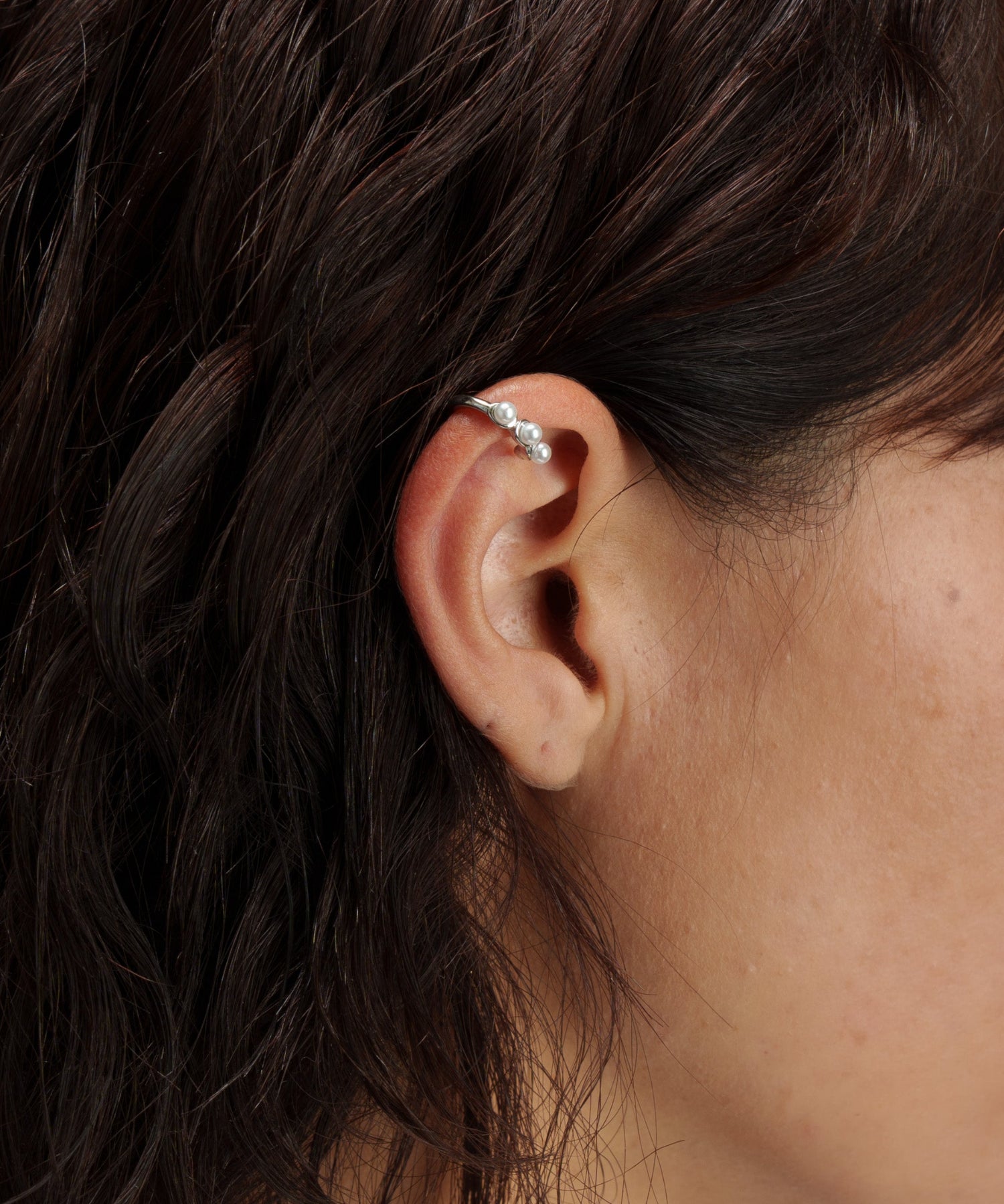 シンプルな土台に縦一列のパールをあしらい、さりげなく上品に仕上げたイヤーカフです。