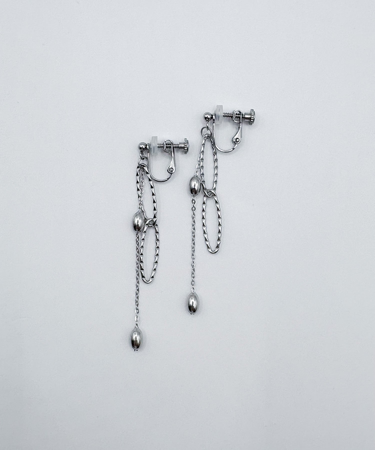 デザインの異なる2つのチャームが、歩くたび耳元で揺れ動き楽しめるイヤリング。ねじ式で微調整も可能です。