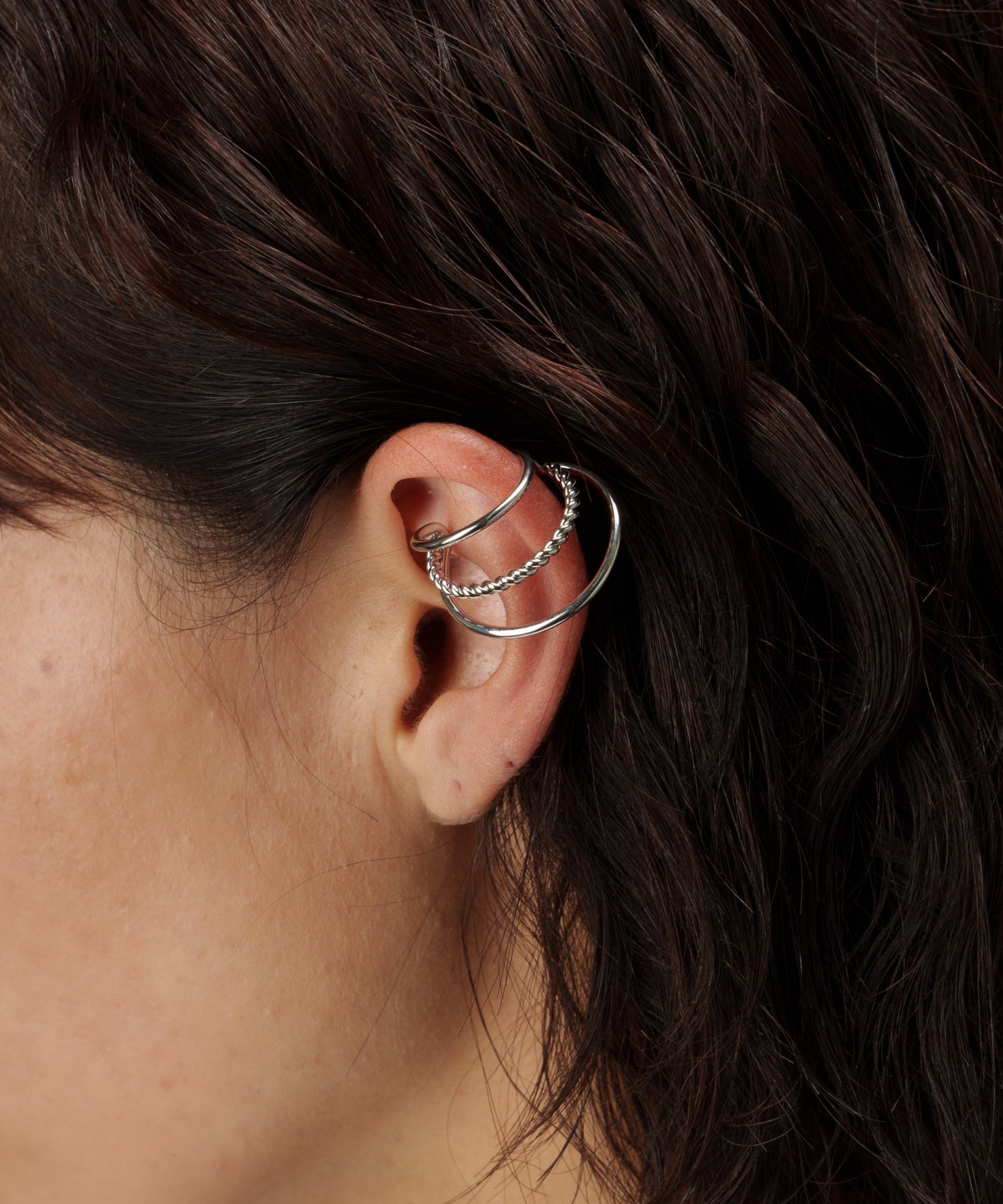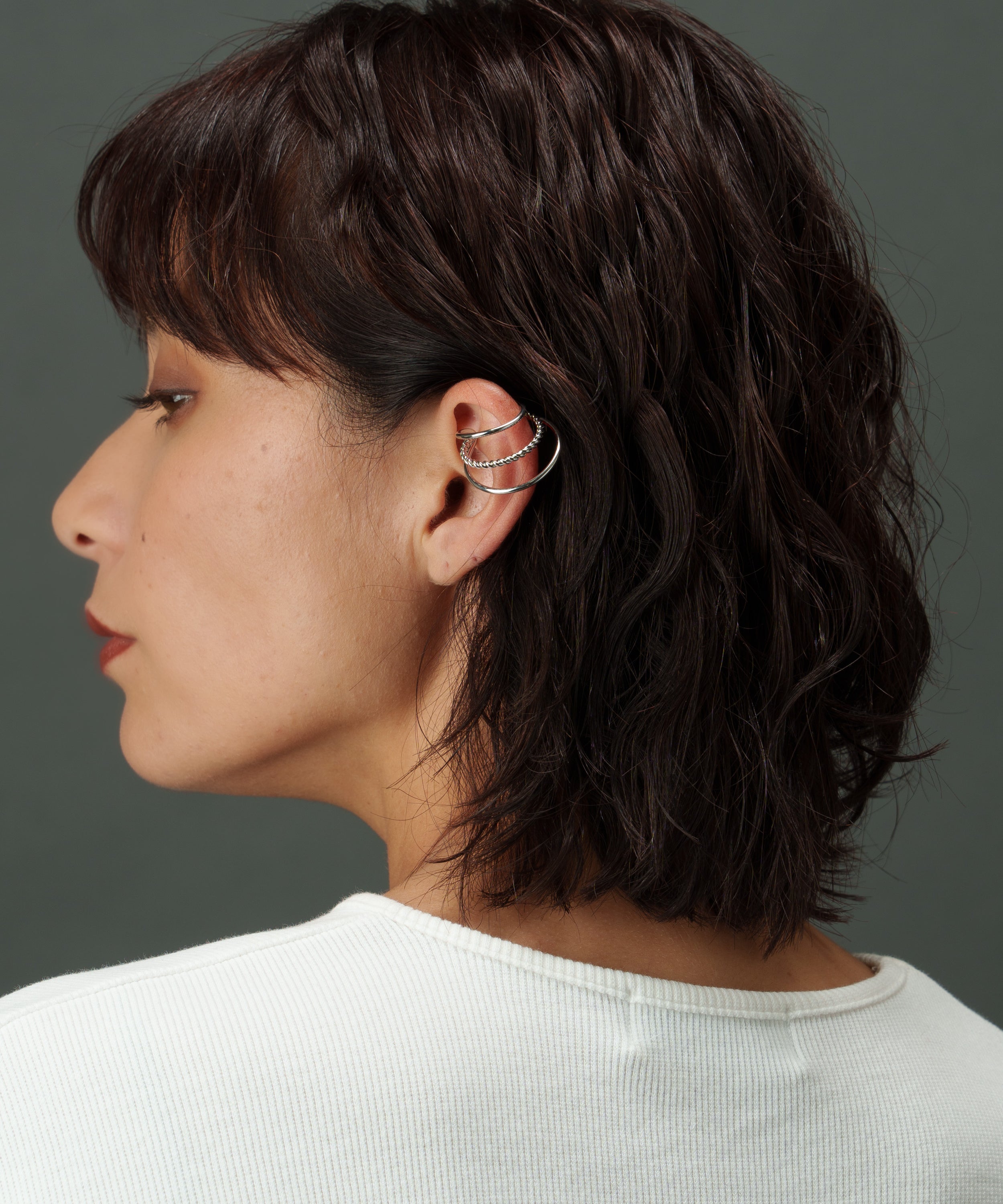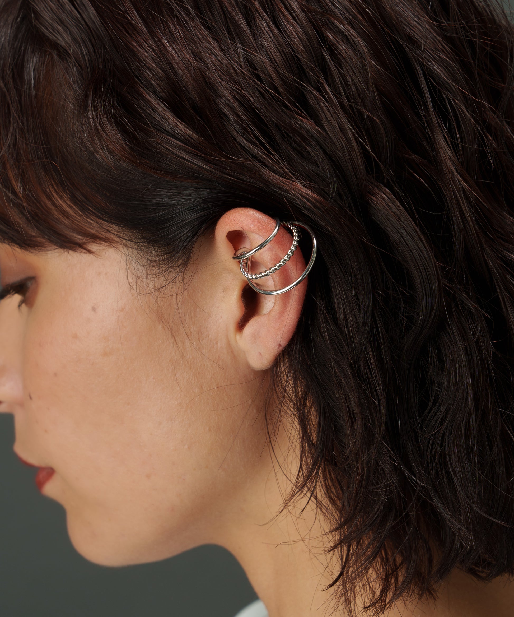 シンプルな金属パーツとツイストスティックを交互に組み合わせたイヤーカフ。耳に沿うデザインで、左耳用です。
