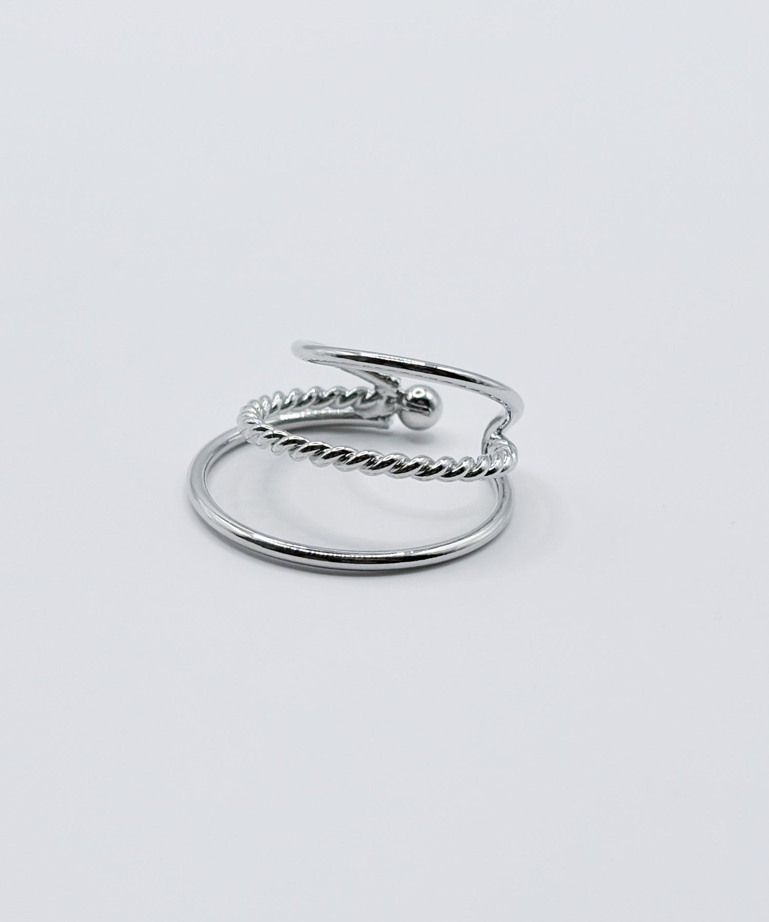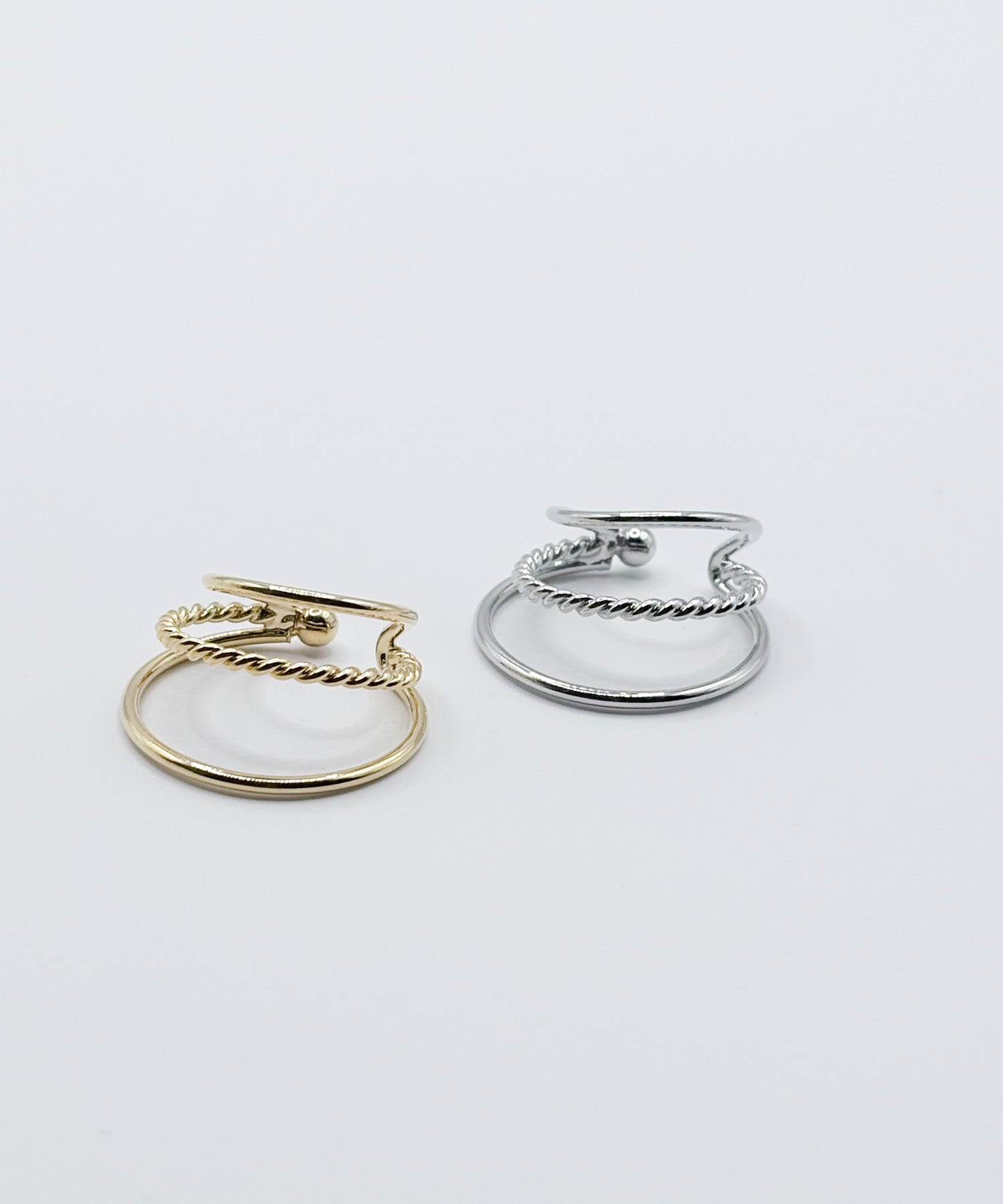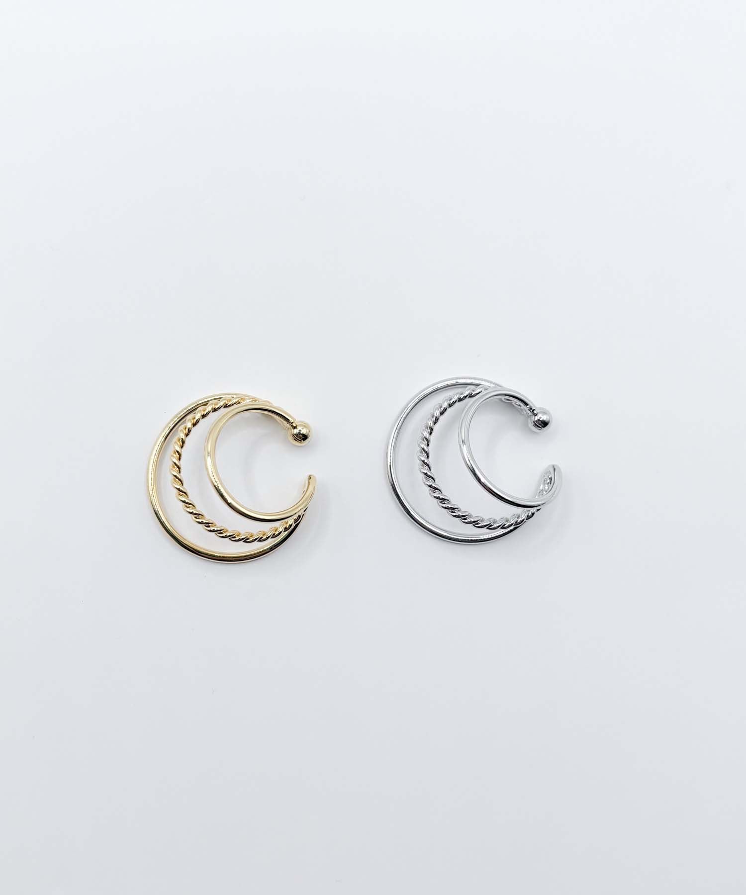 シンプルな金属パーツとツイストスティックを交互に組み合わせたイヤーカフ。耳に沿うデザインで、左耳用です。