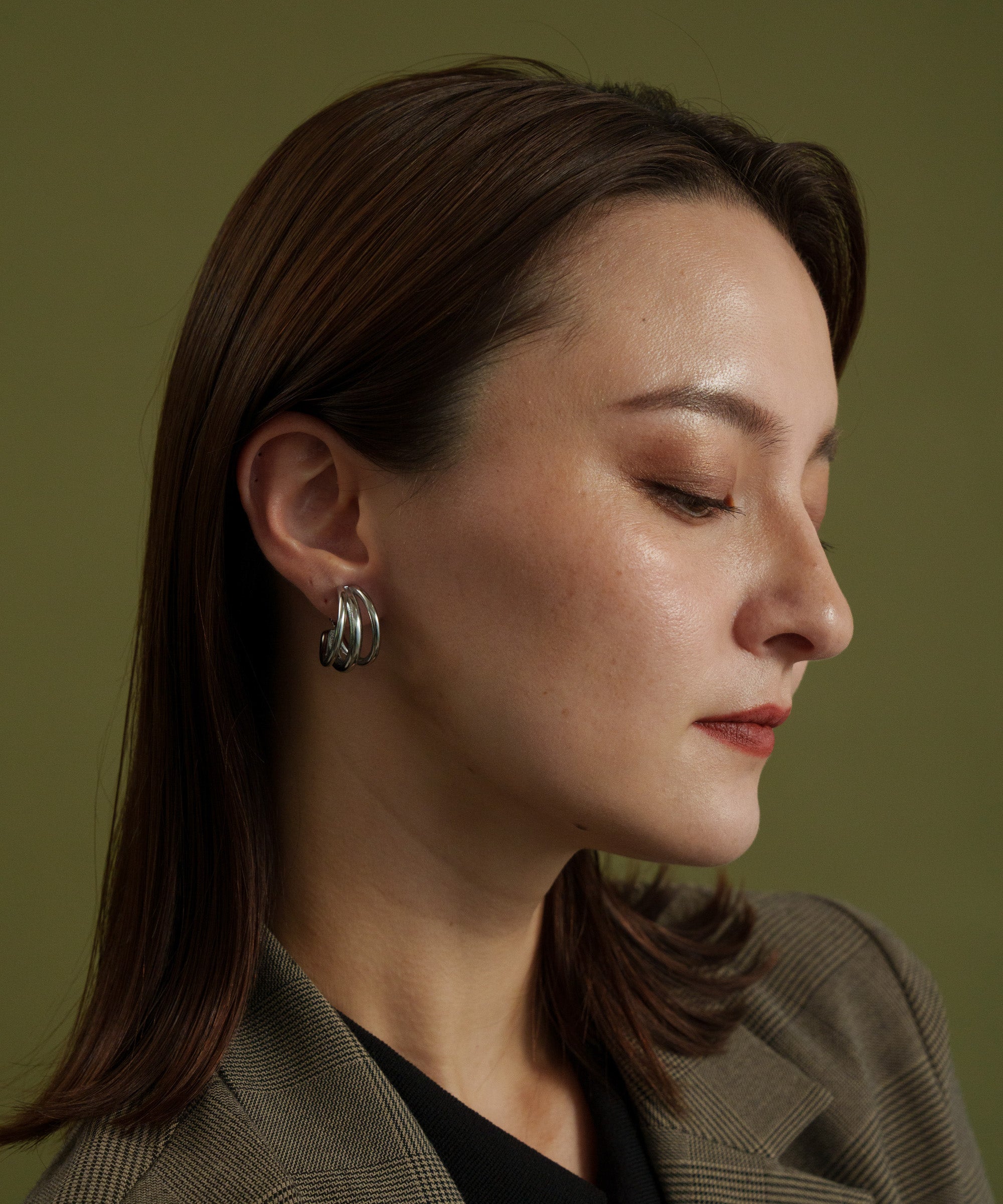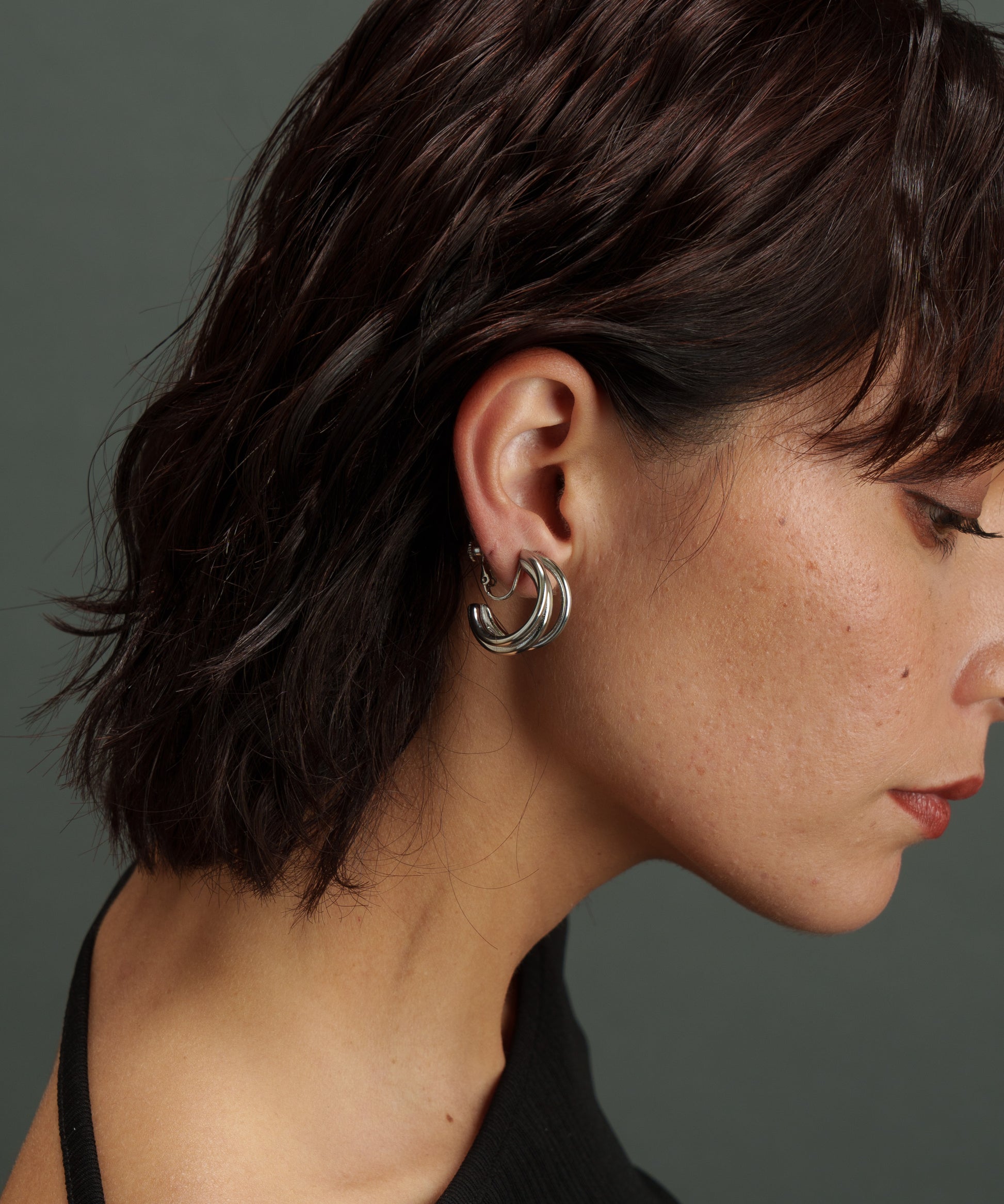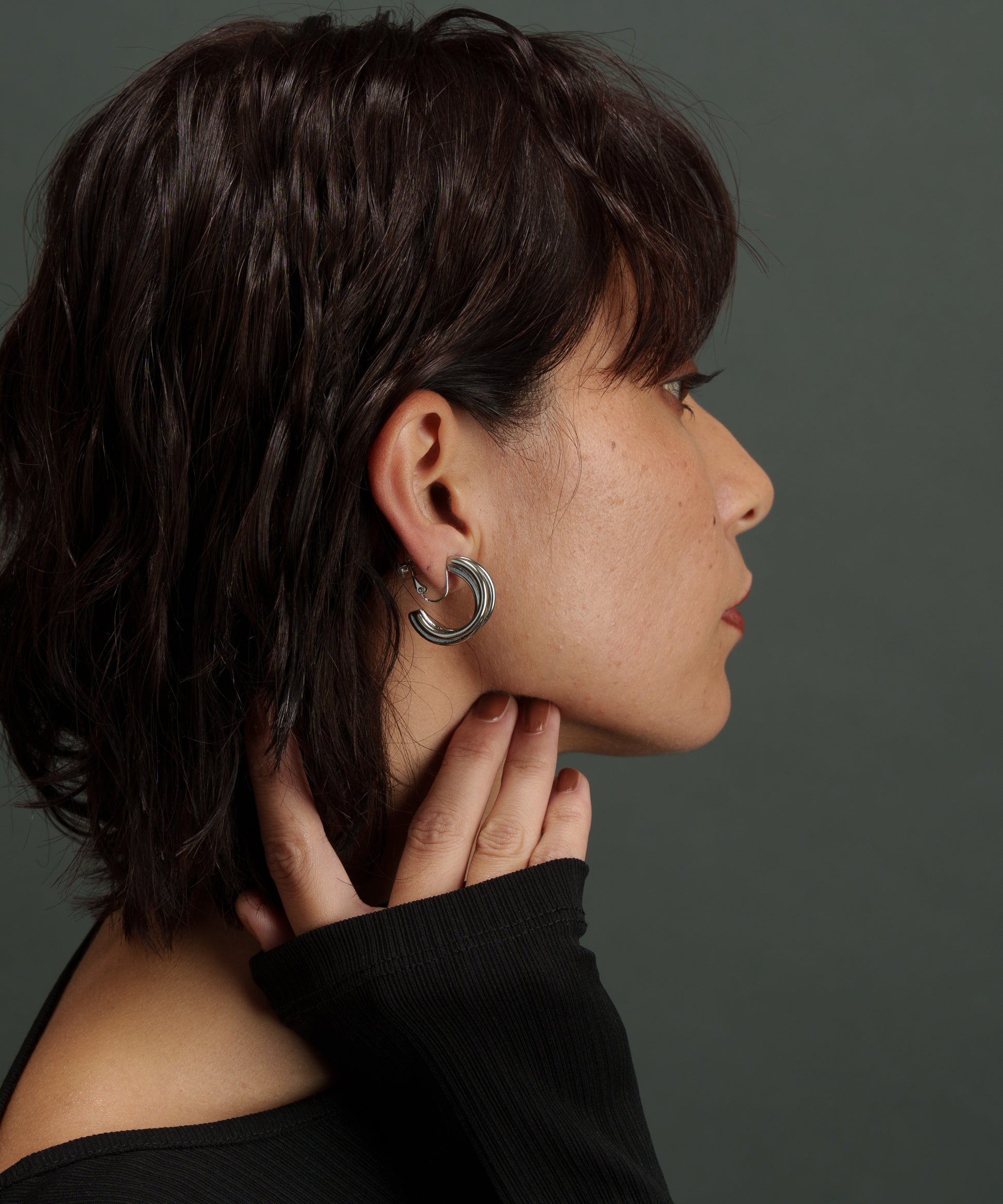 パーツ自体はシンプルなCカーブですが、重なりを加えることでデザインに動きが生まれ、表情豊かなイヤリングに仕上がっています。