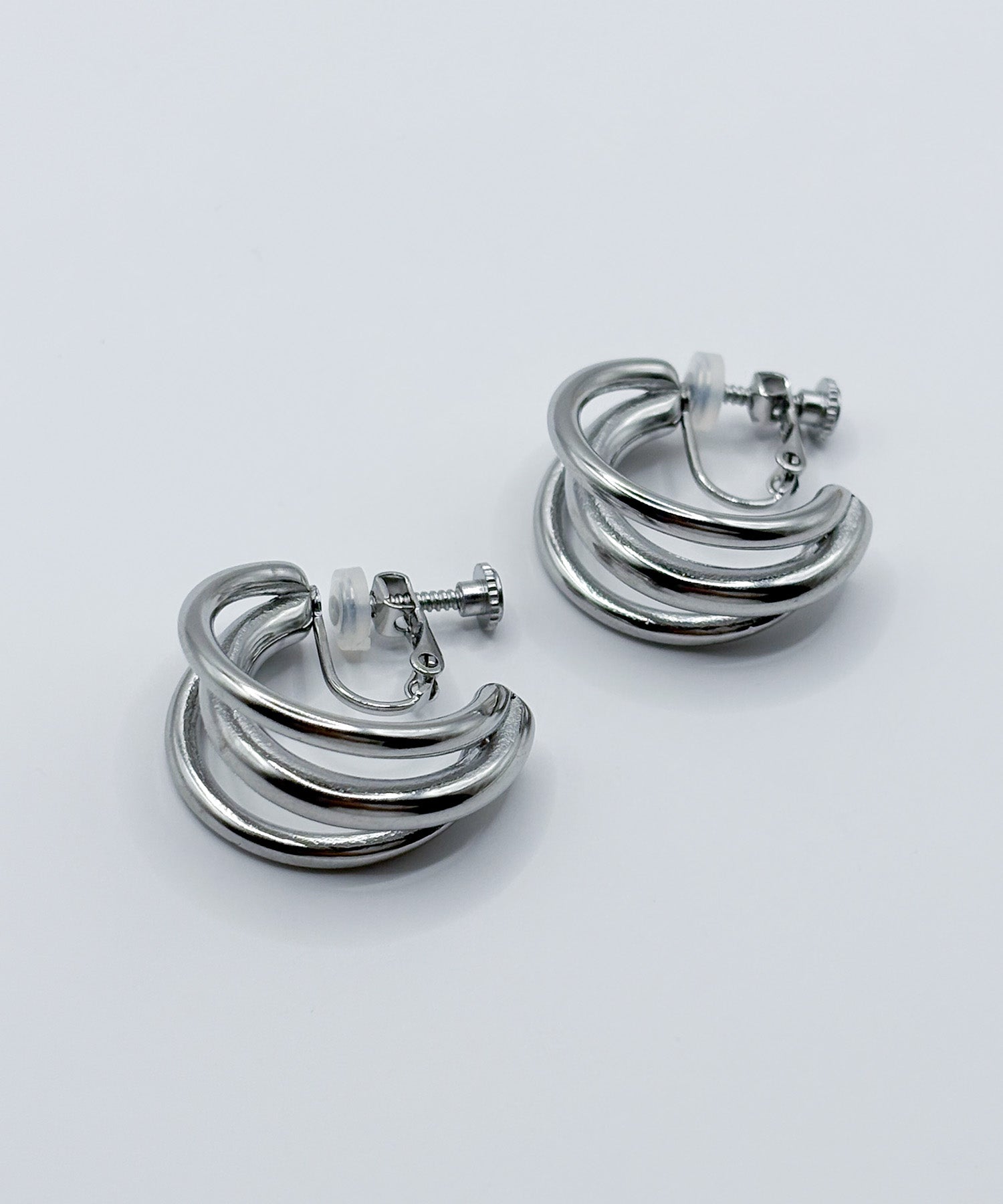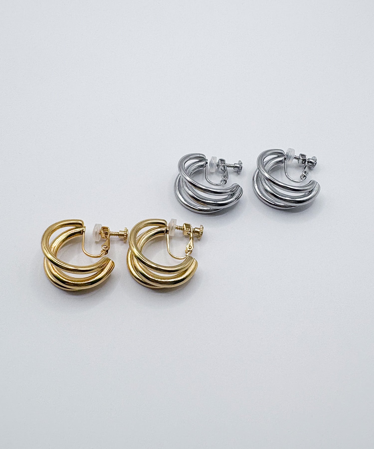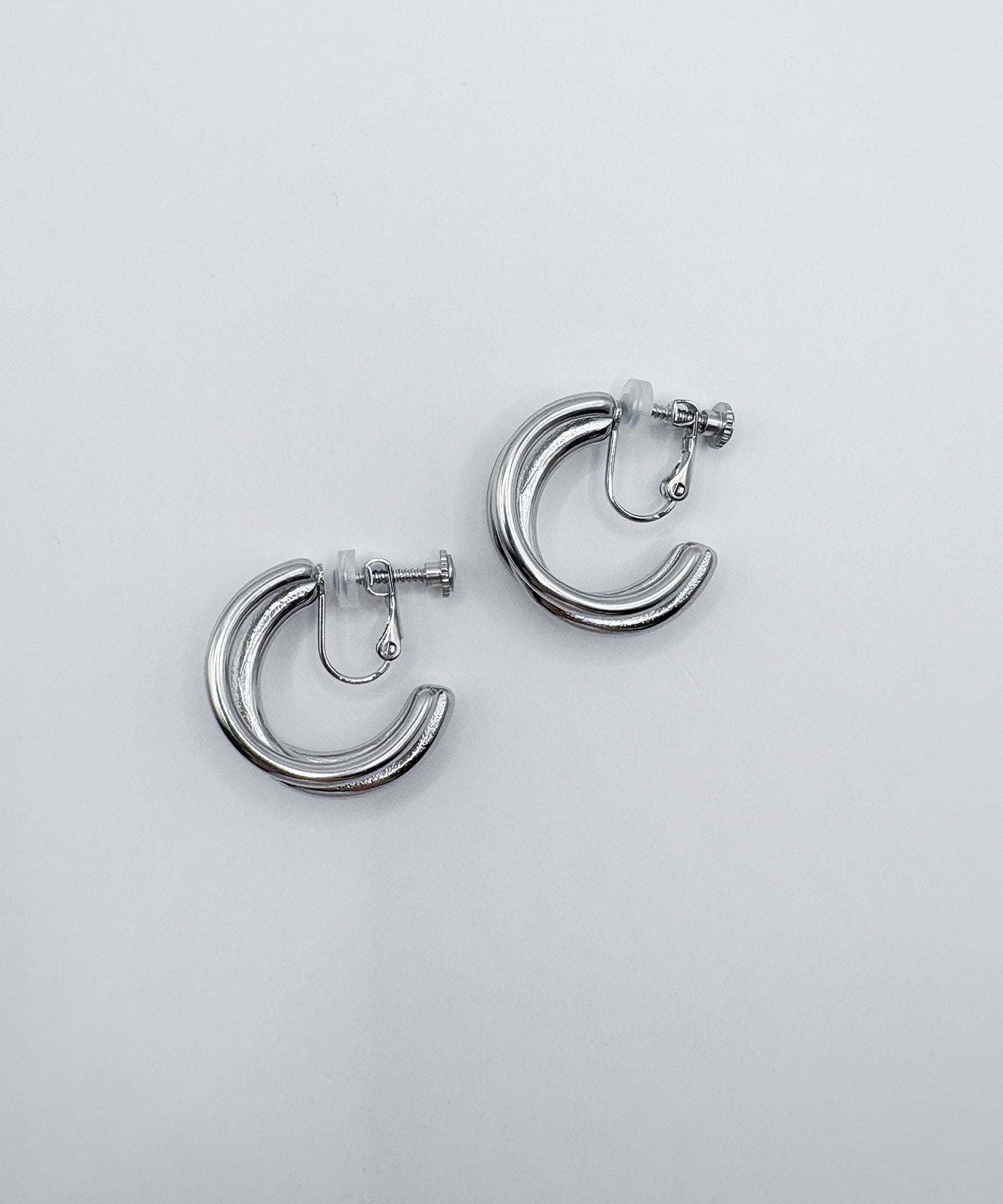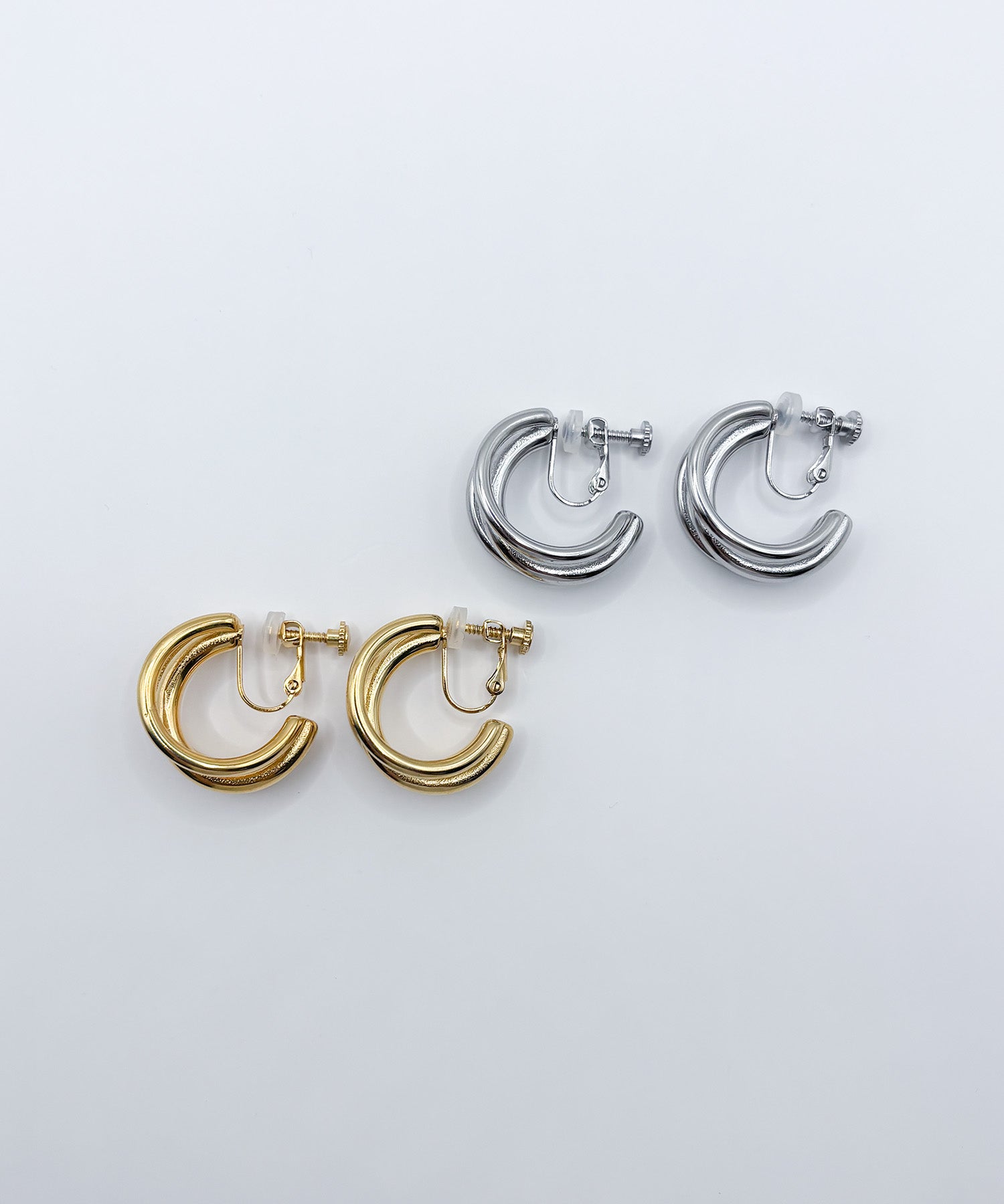 パーツ自体はシンプルなCカーブですが、重なりを加えることでデザインに動きが生まれ、表情豊かなイヤリングに仕上がっています。