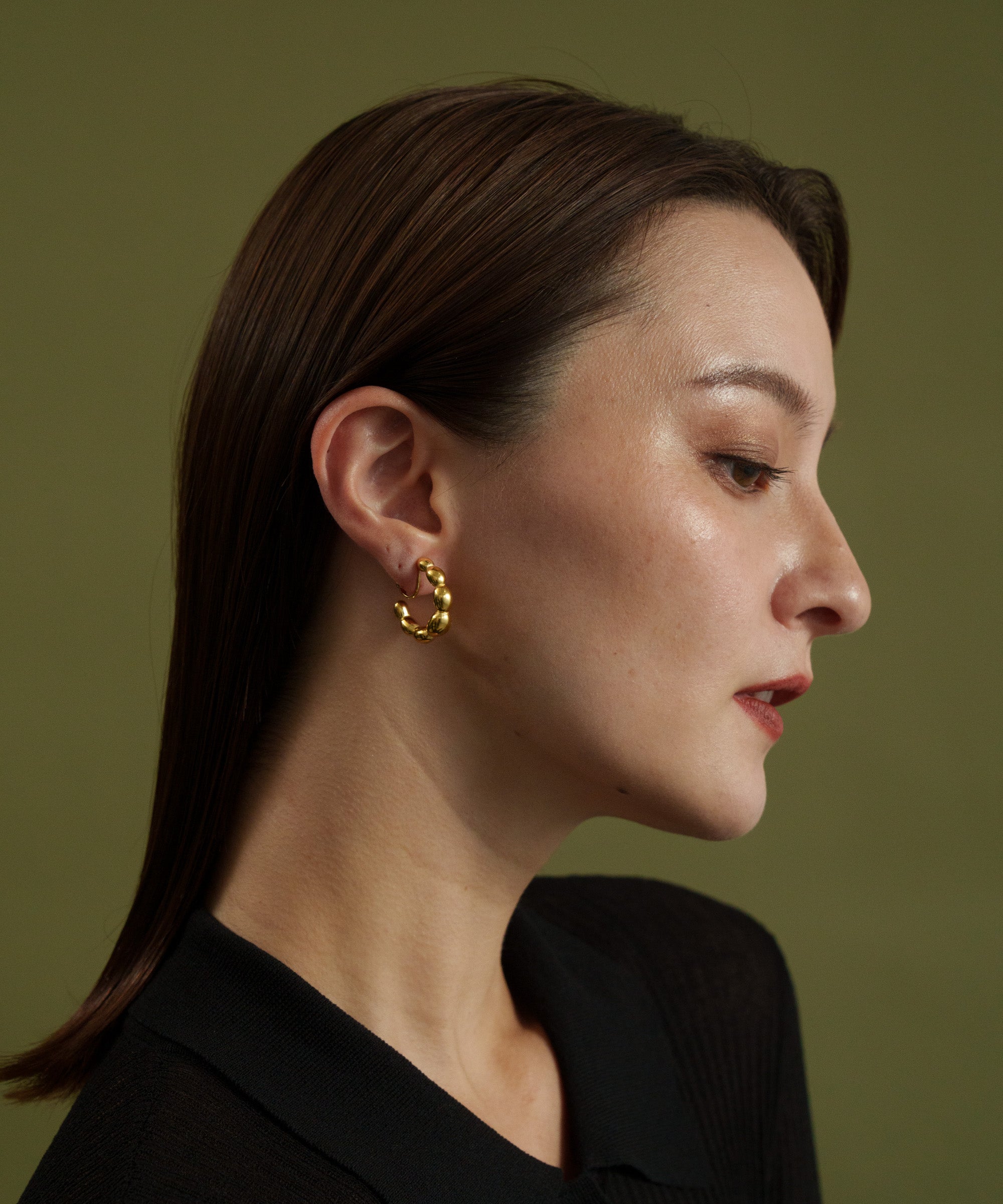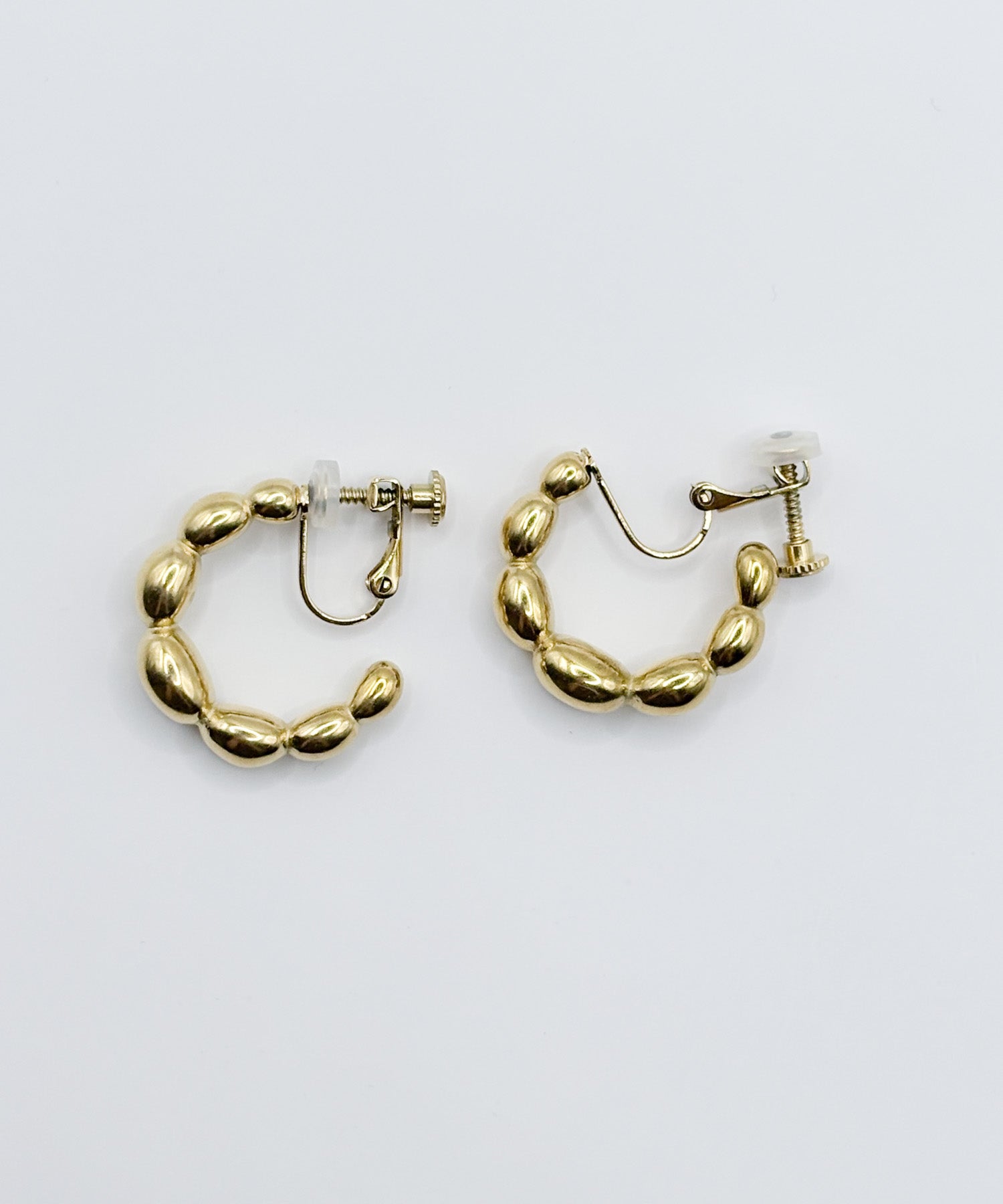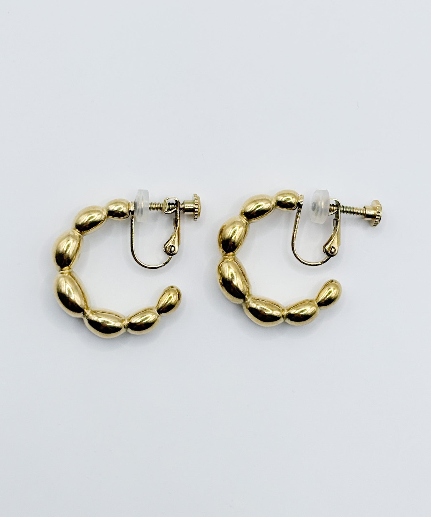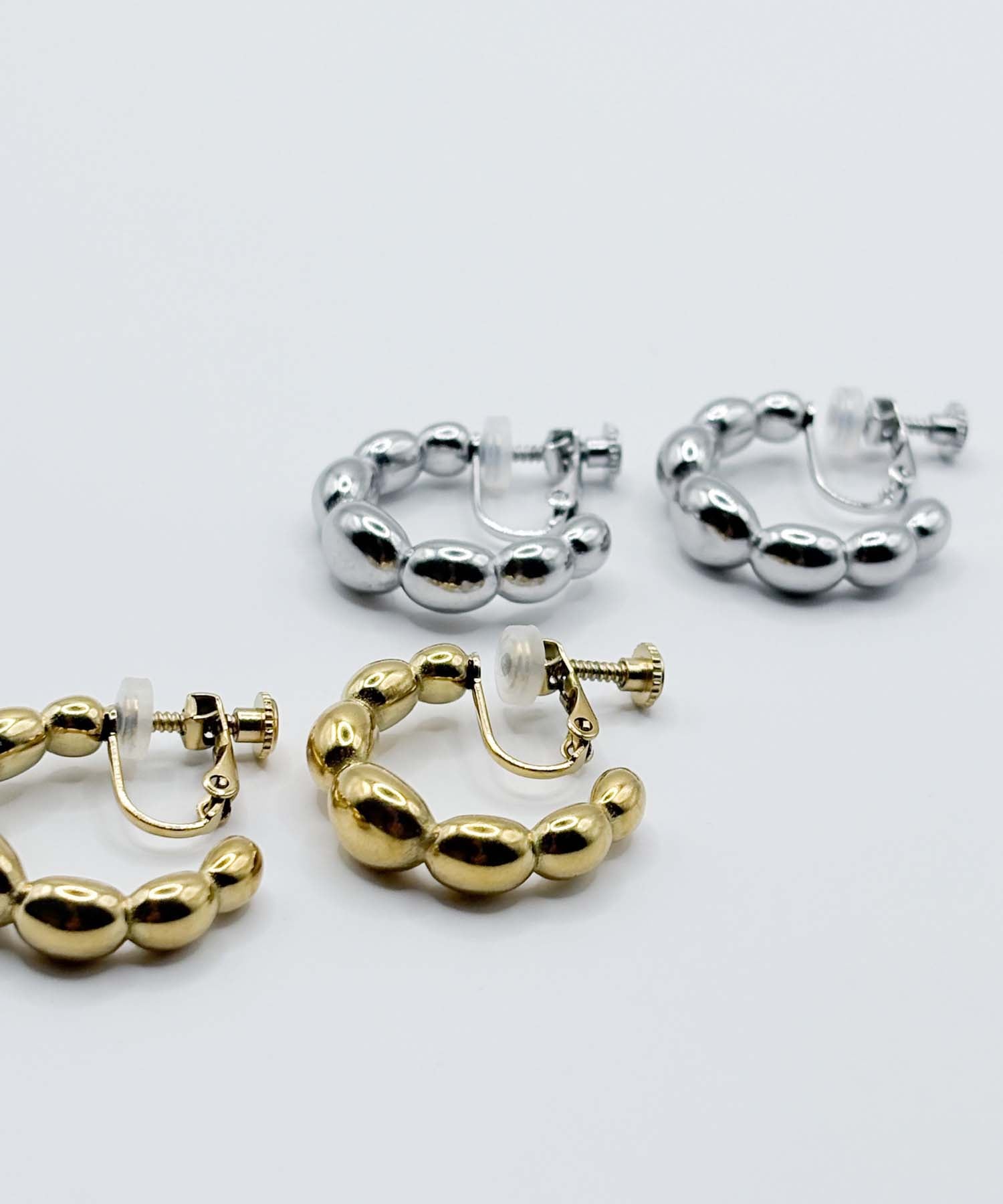 ぷくぷくと丸いパーツを繋ぎ合わせたようなデザインで、耳元に可愛らしいボリューム感を添えるイヤリングです。