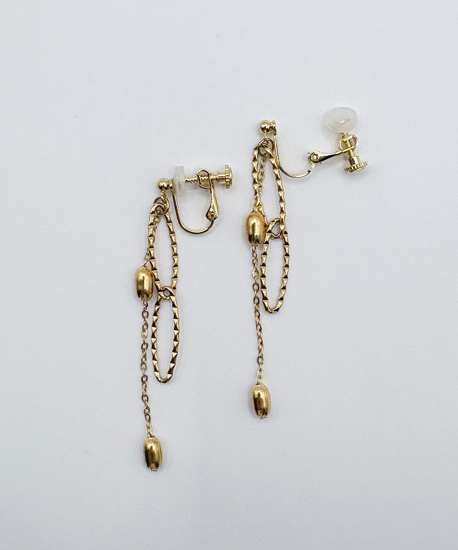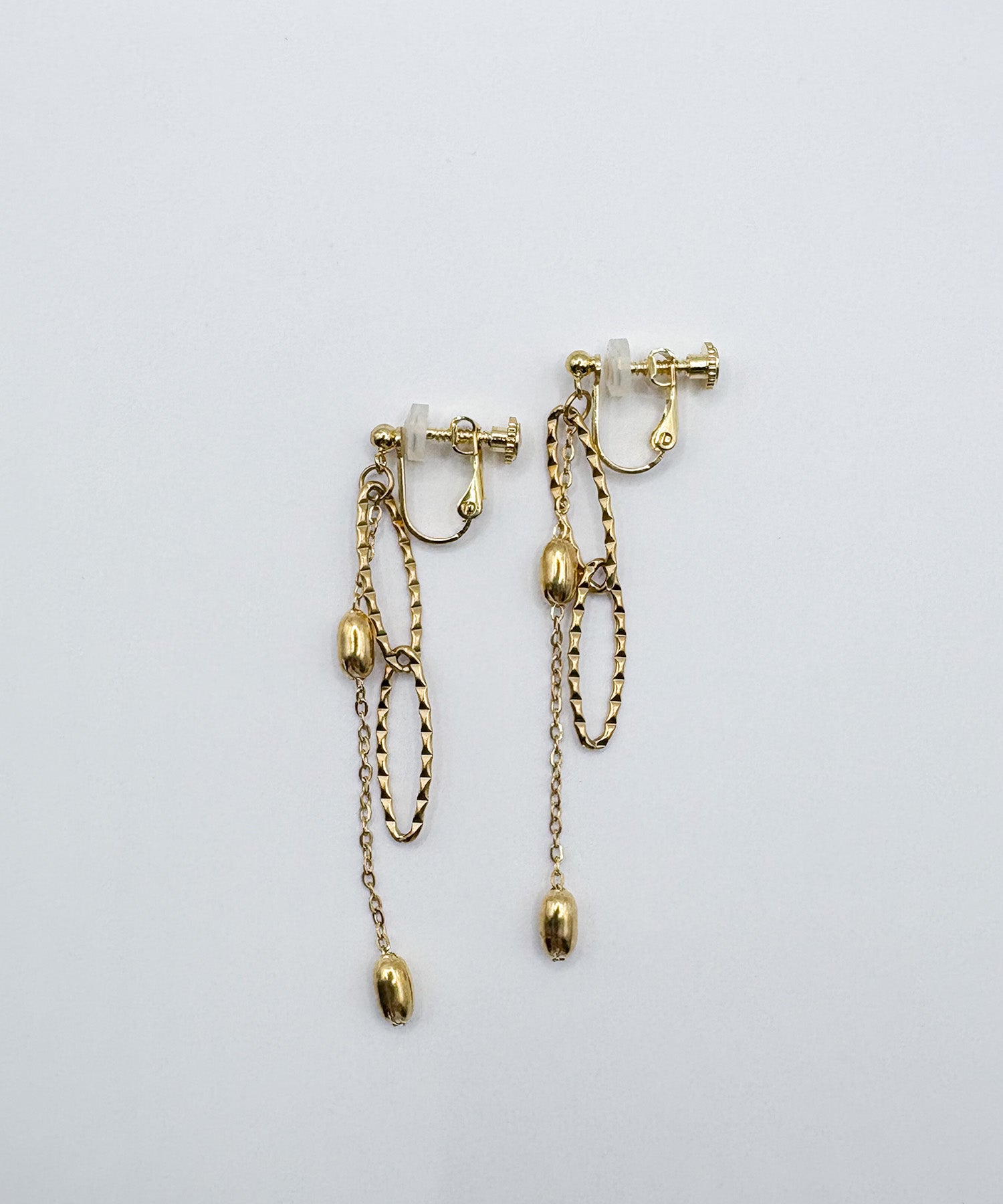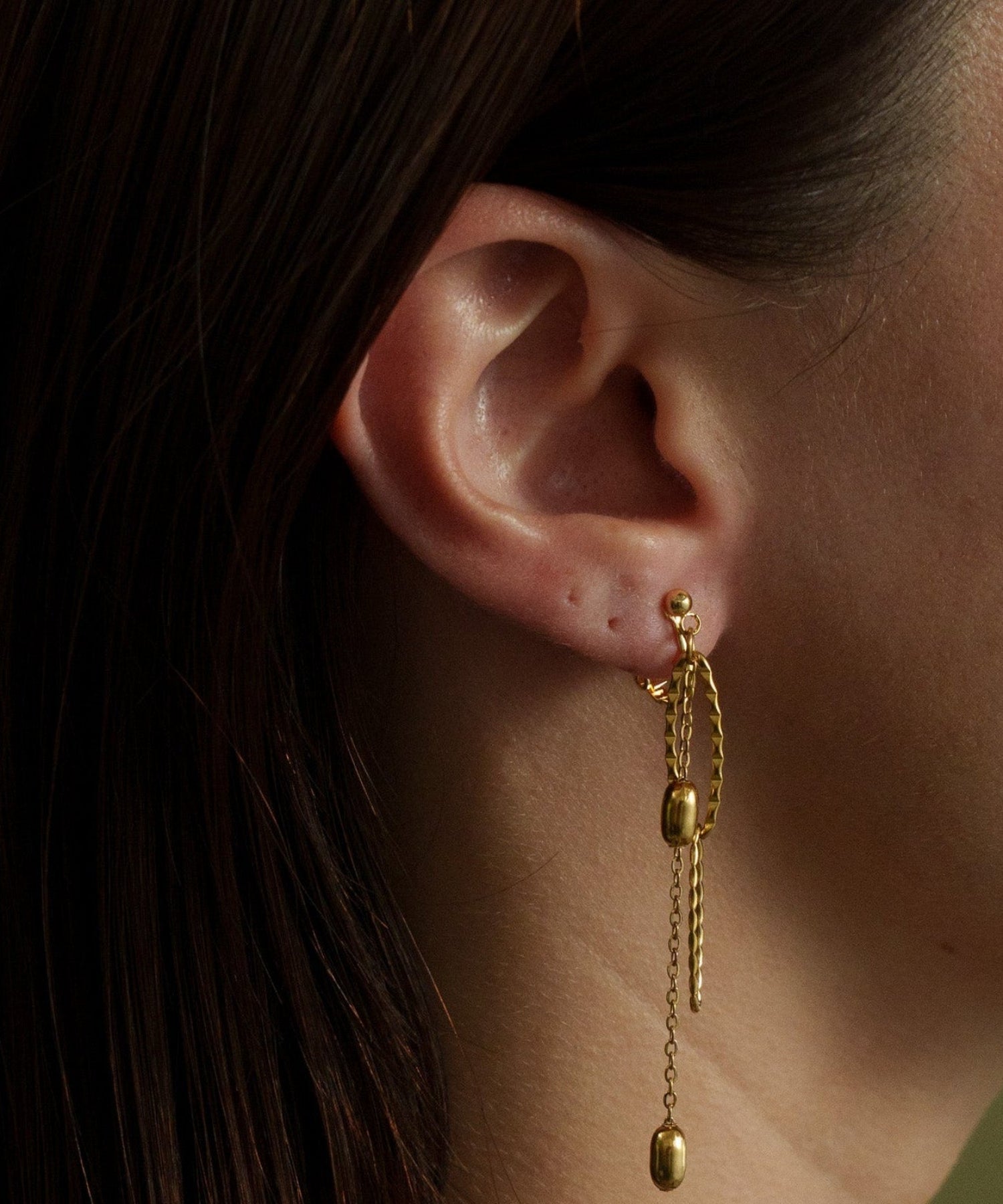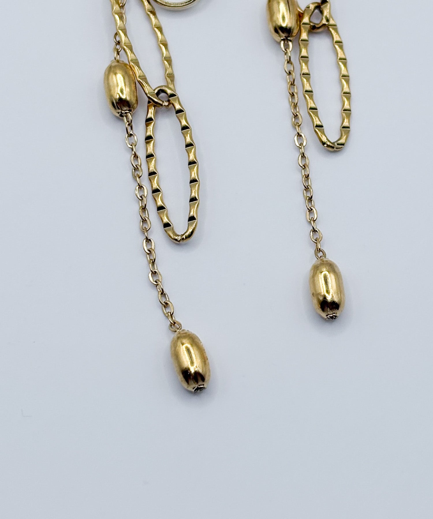 デザインの異なる2つのチャームが、歩くたび耳元で揺れ動き楽しめるイヤリング。ねじ式で微調整も可能です。