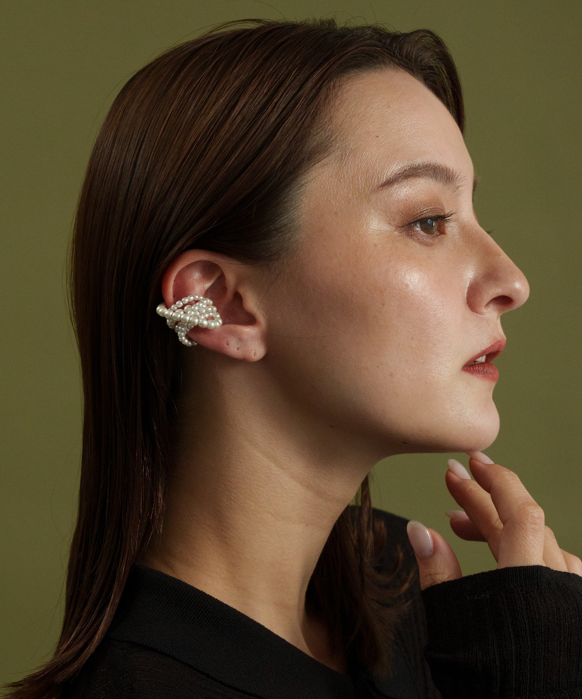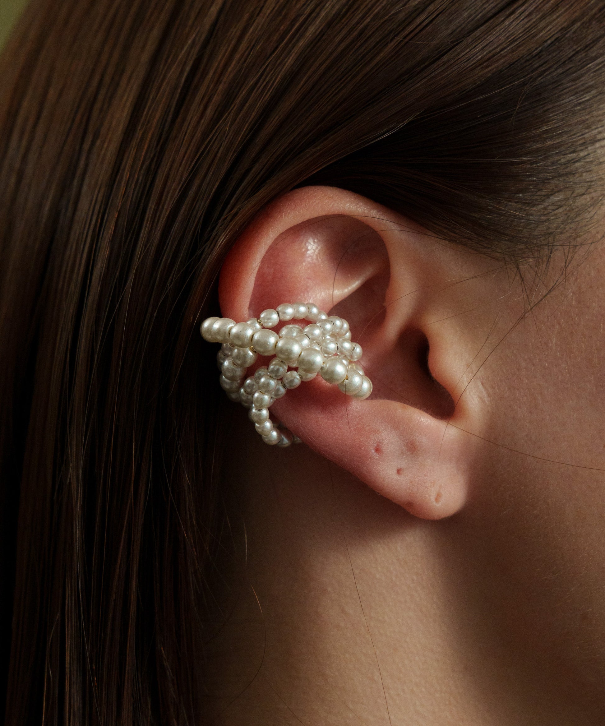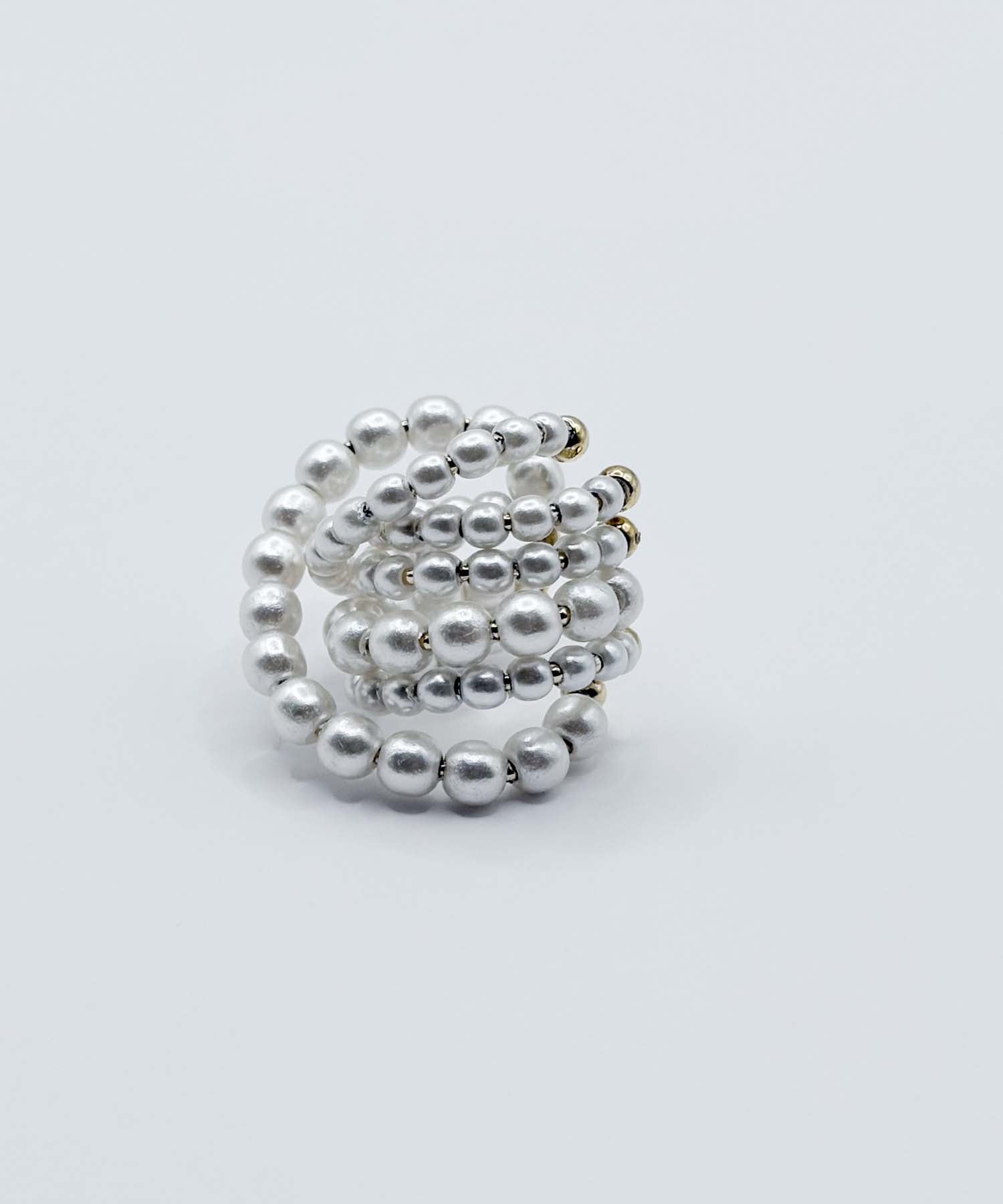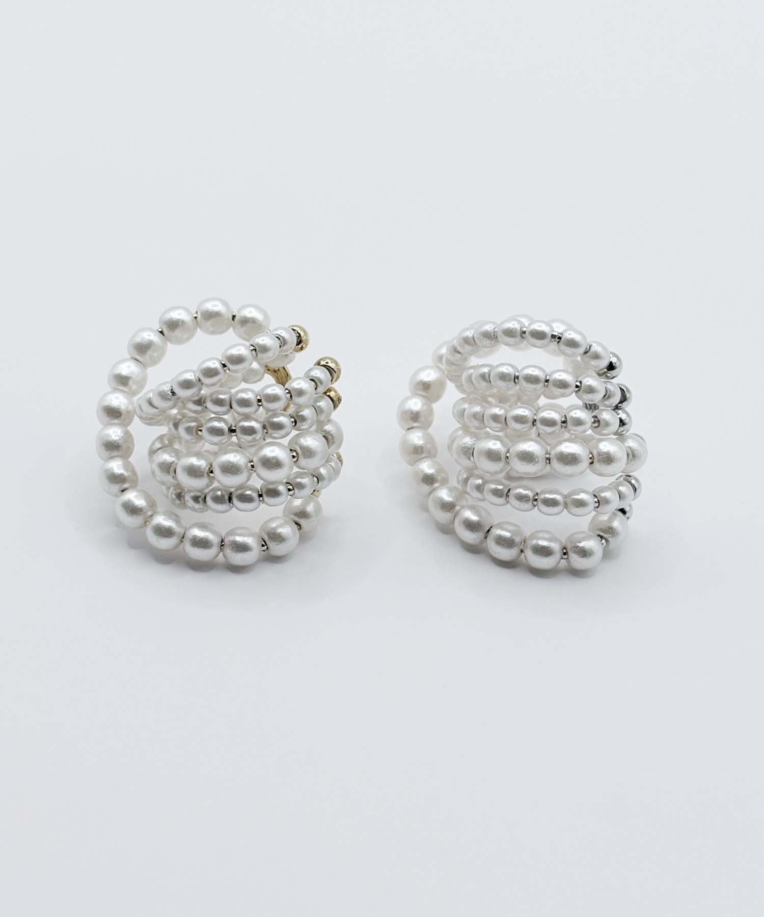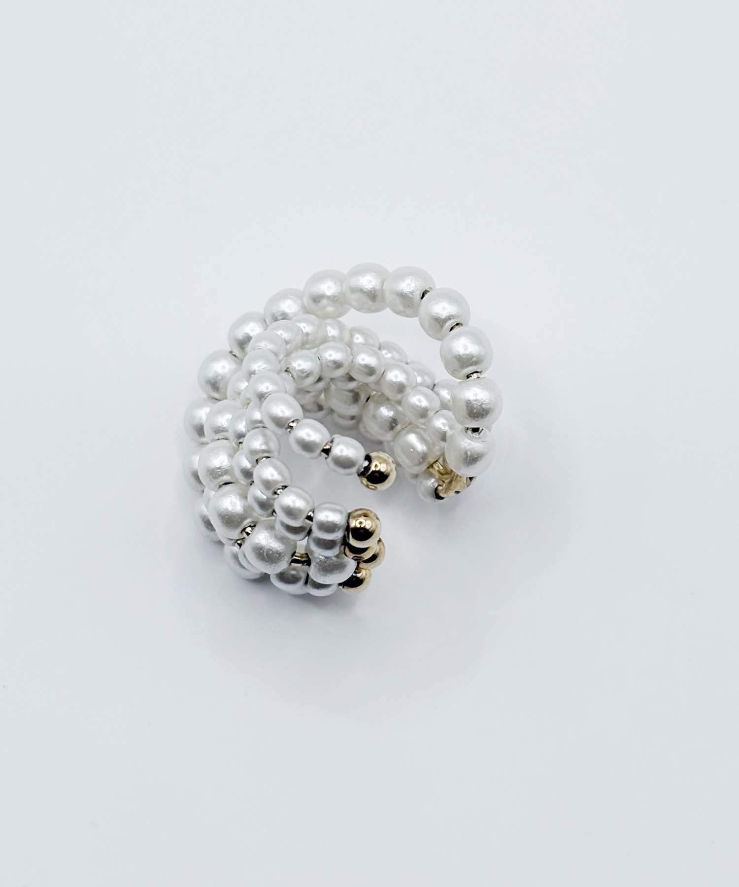 小ぶりのパールパーツを贅沢に使用したイヤーカフ。ボリューム感があり、イヤーカフとは思えない存在感を放ちます。オケージョンや特別な日におすすめです。