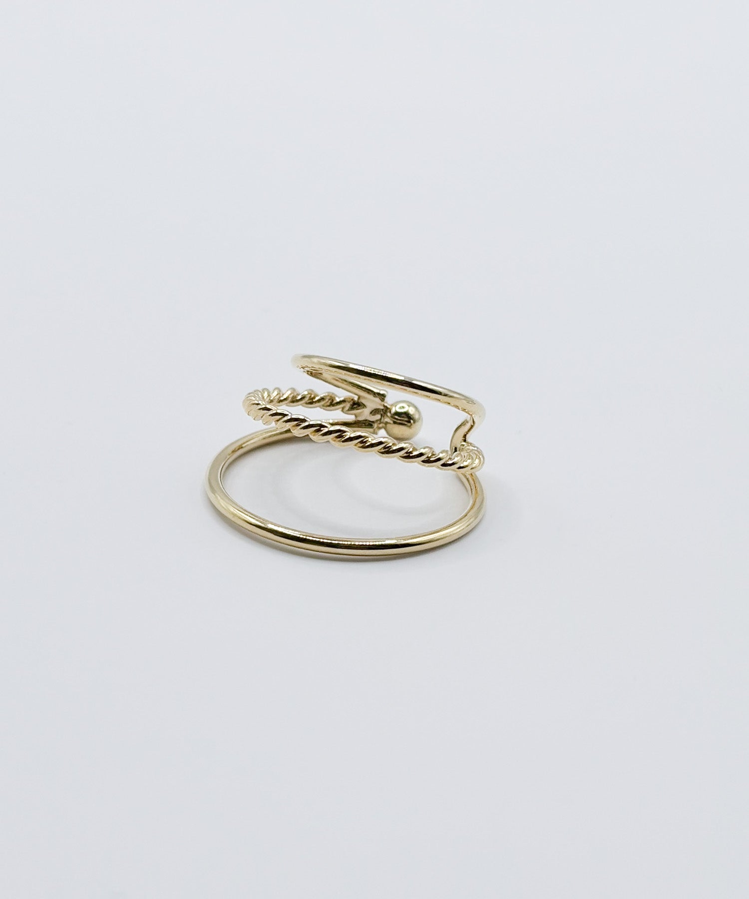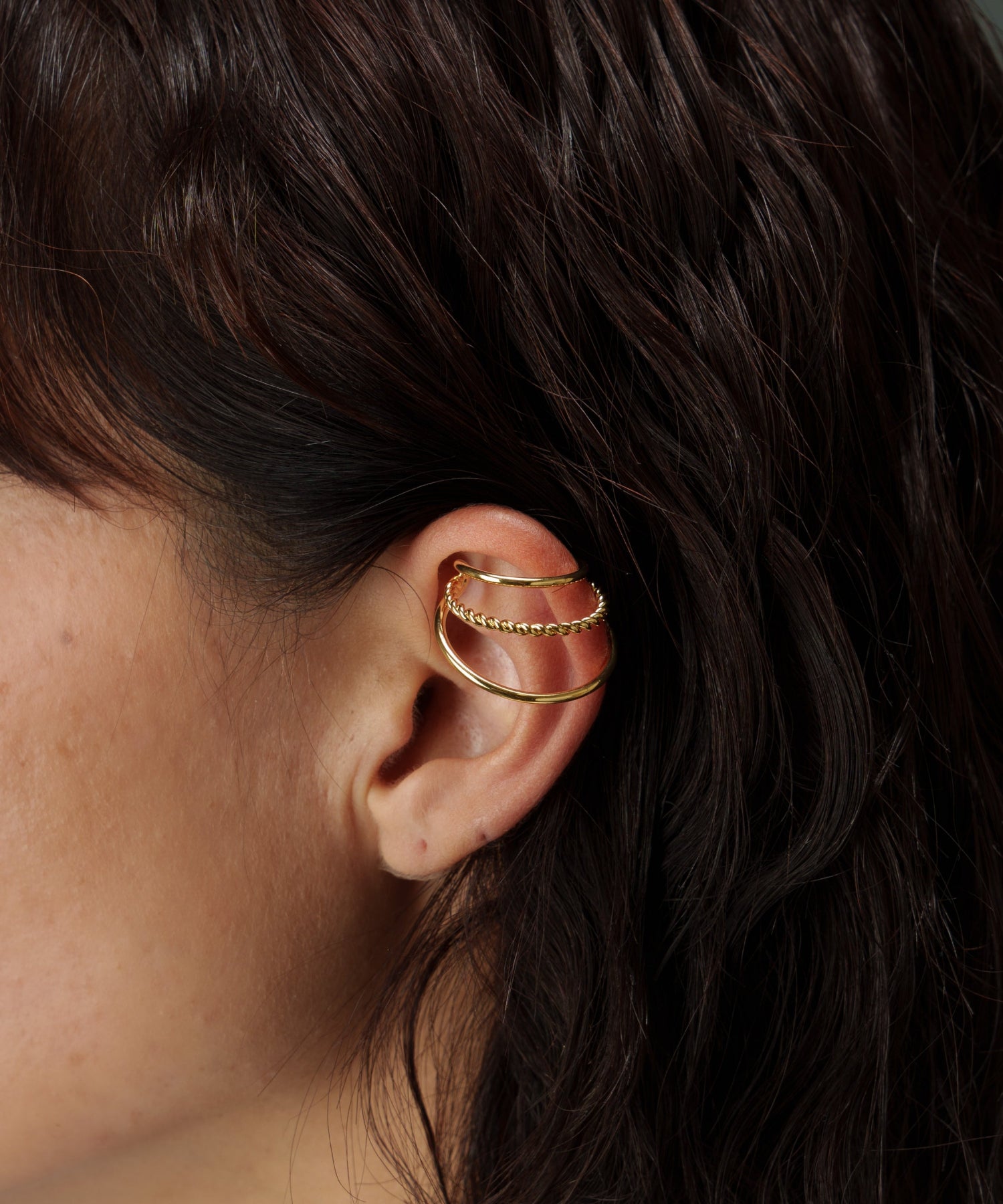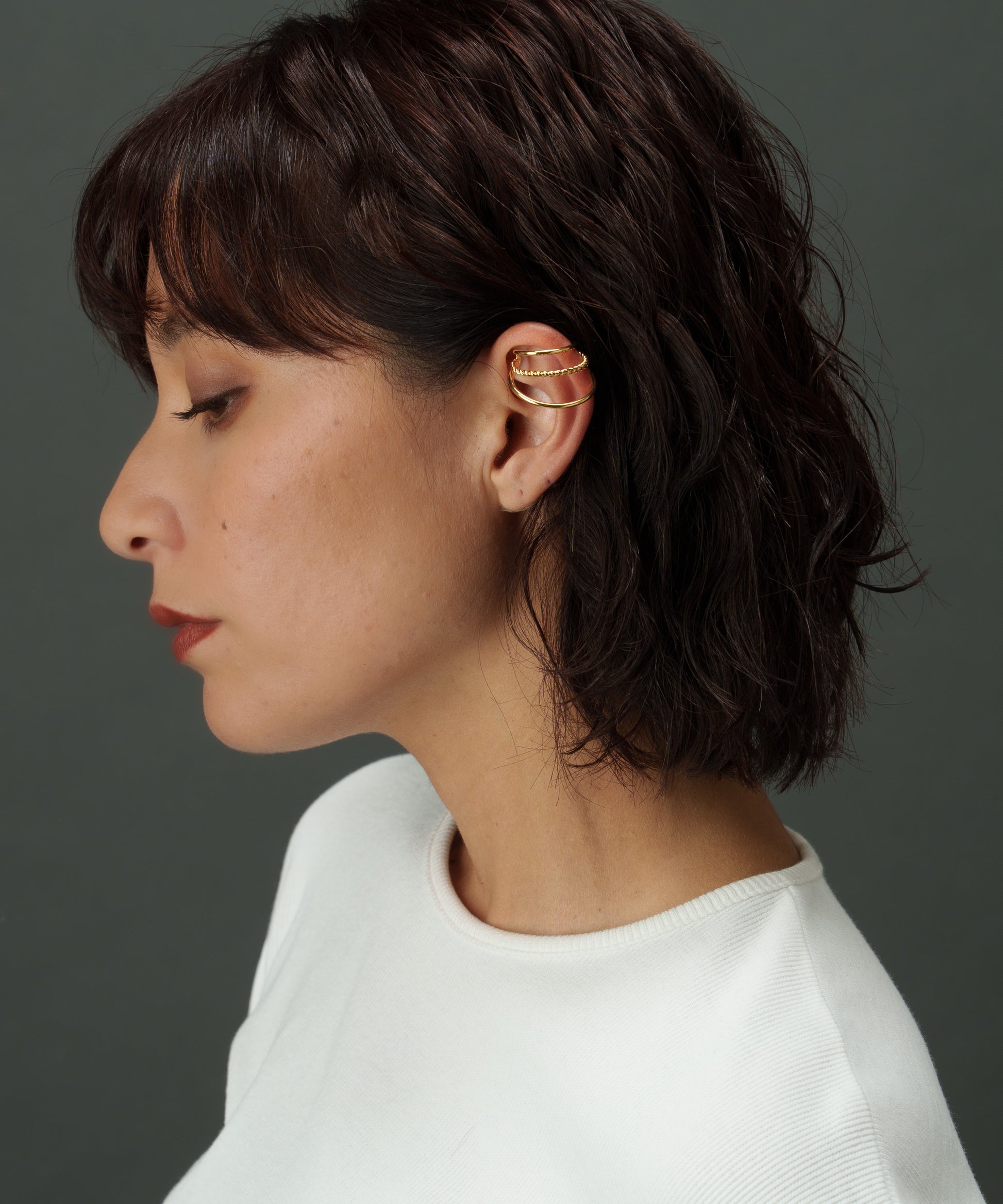 シンプルな金属パーツとツイストスティックを交互に組み合わせたイヤーカフ。耳に沿うデザインで、左耳用です。