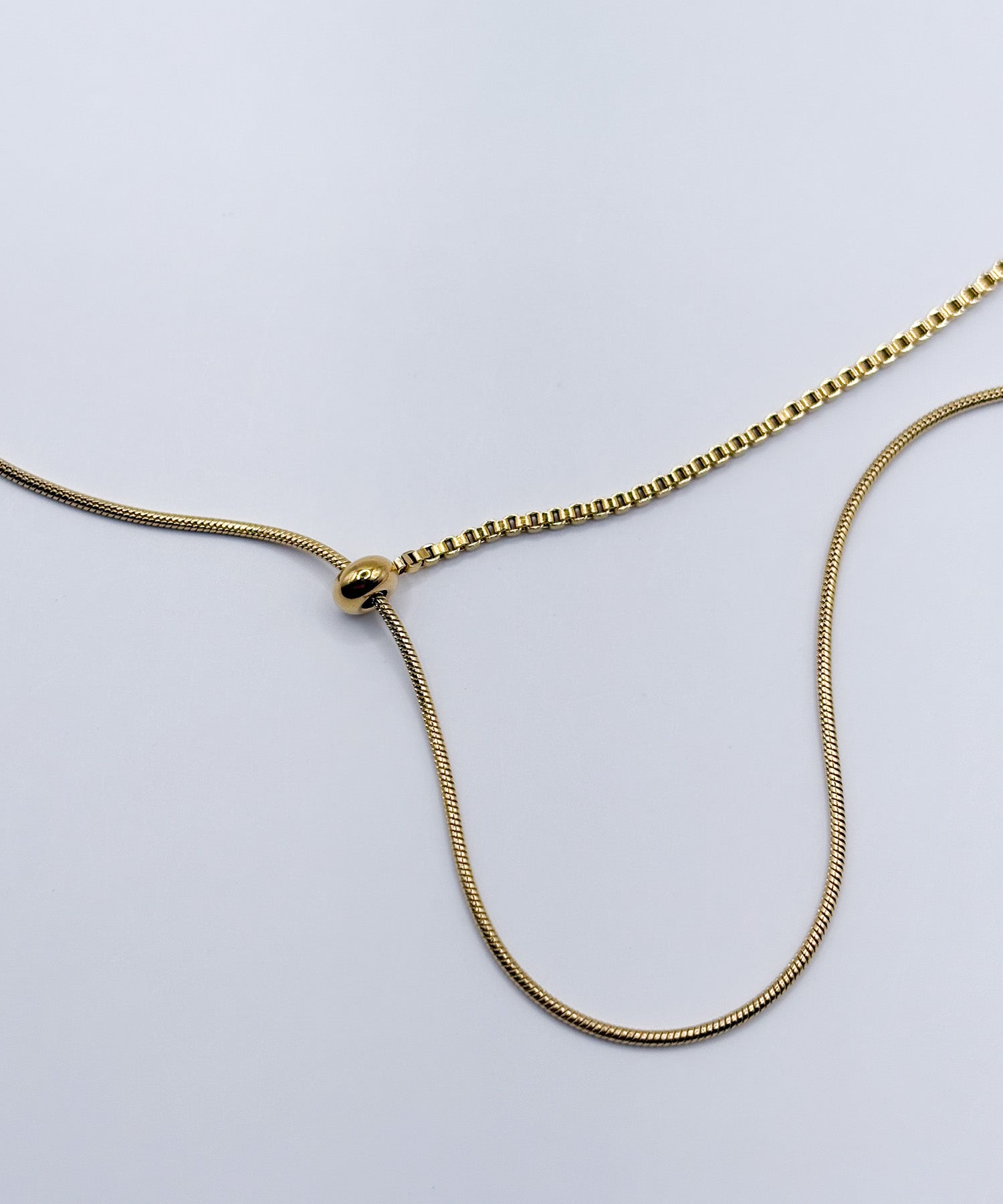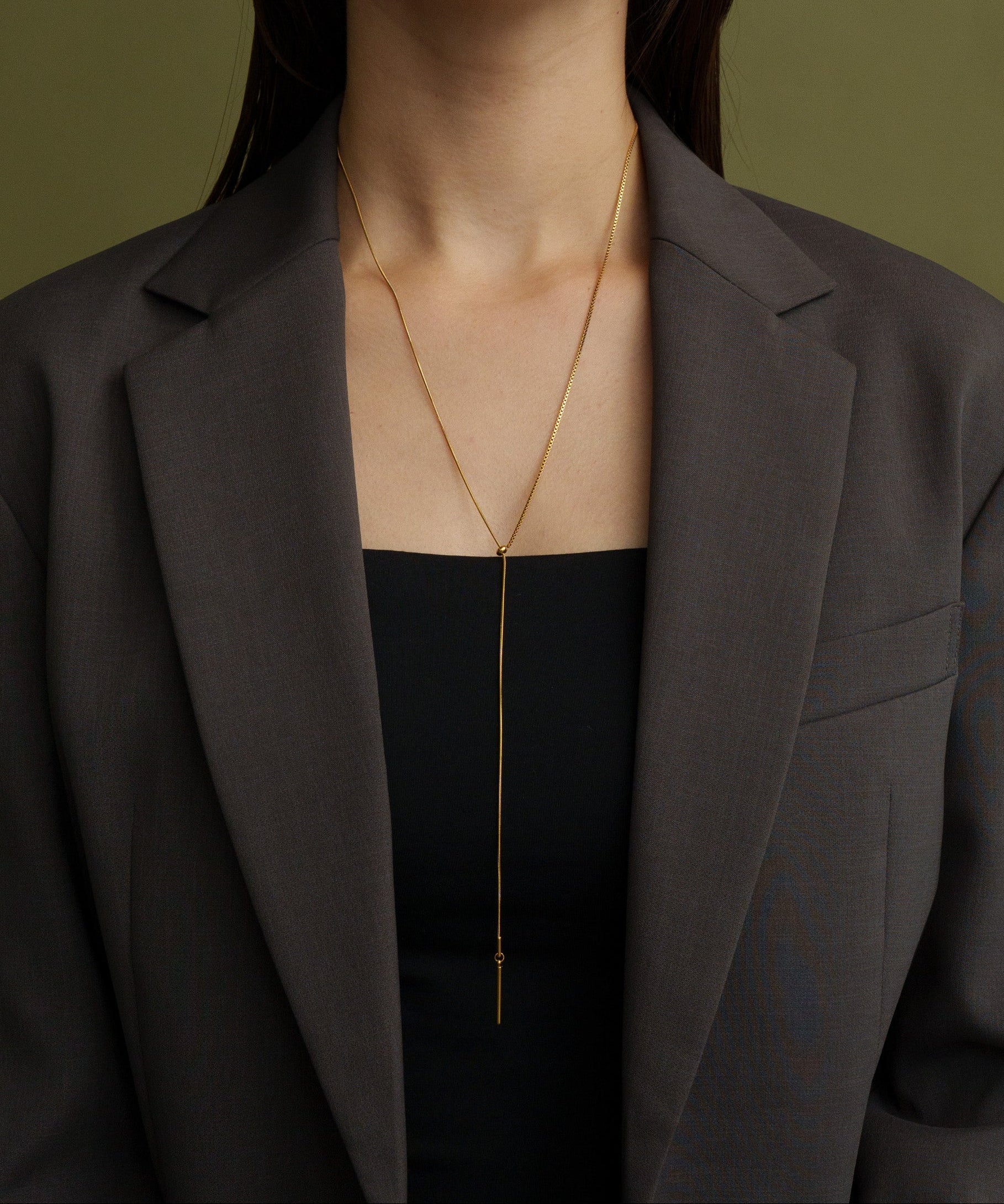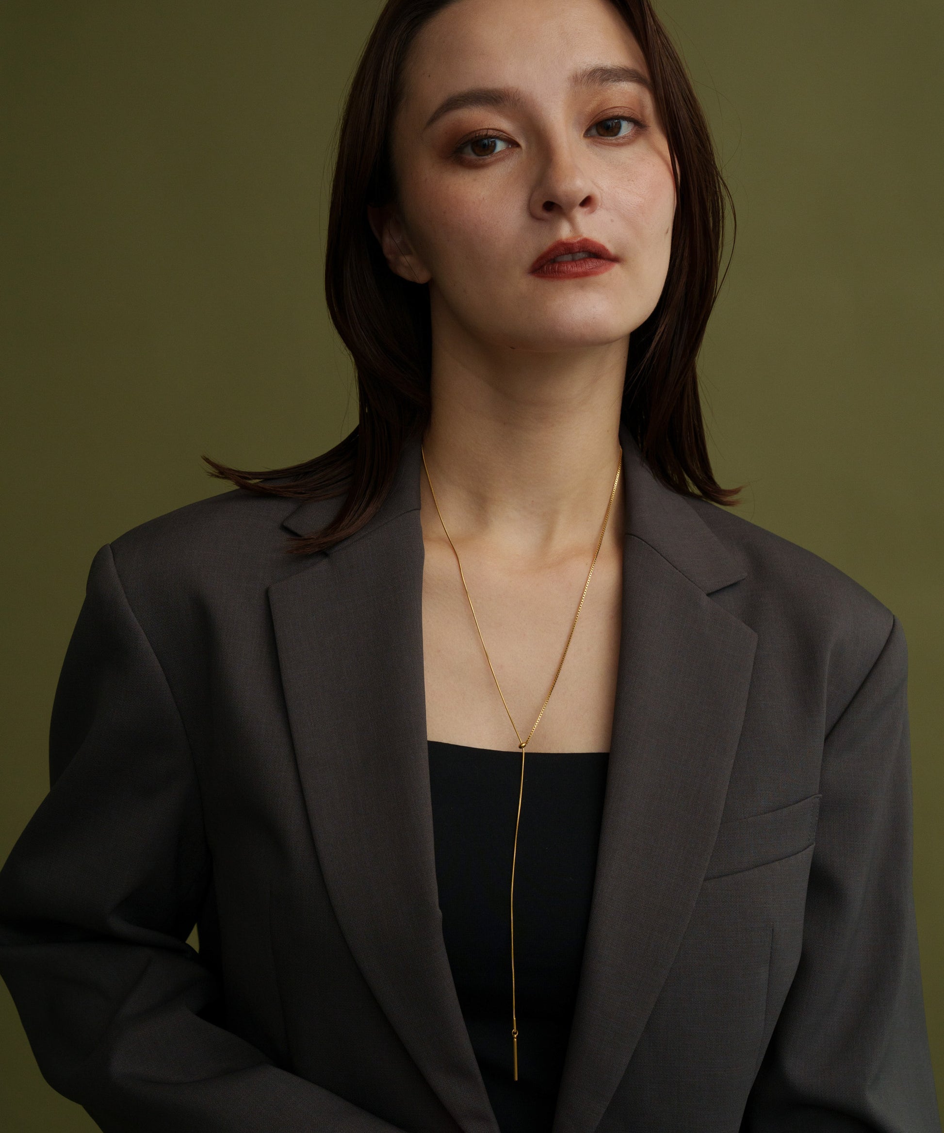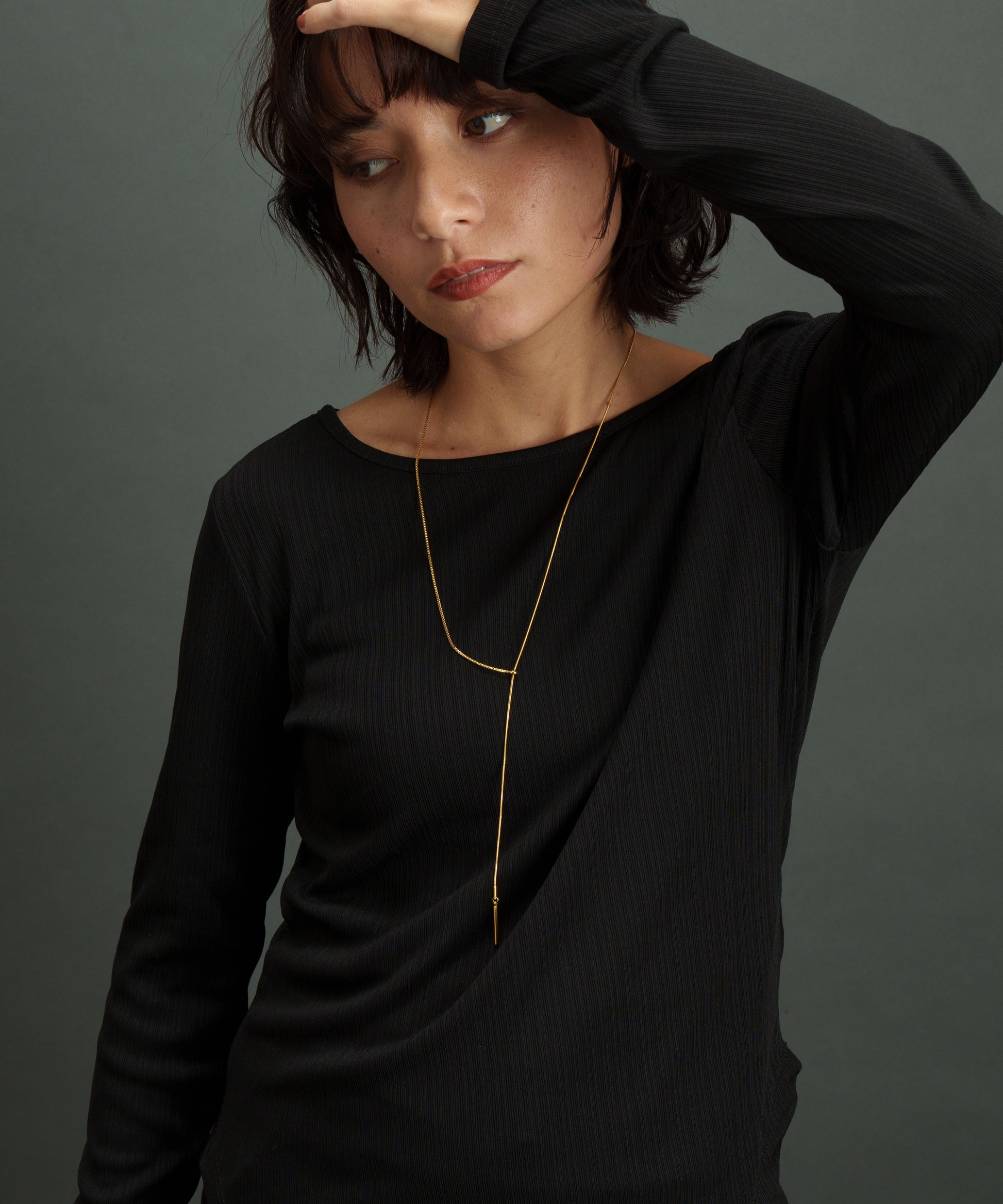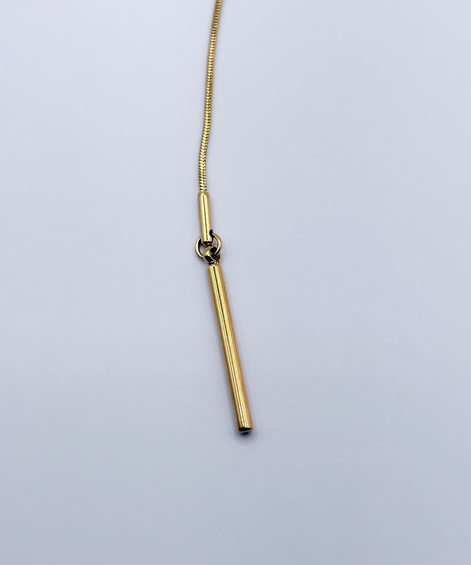 左右違ったチェーンを用いたアシメトリーデザイン。先端に揺れ動くバーを取り付け動きのあるY字ネックレスに。