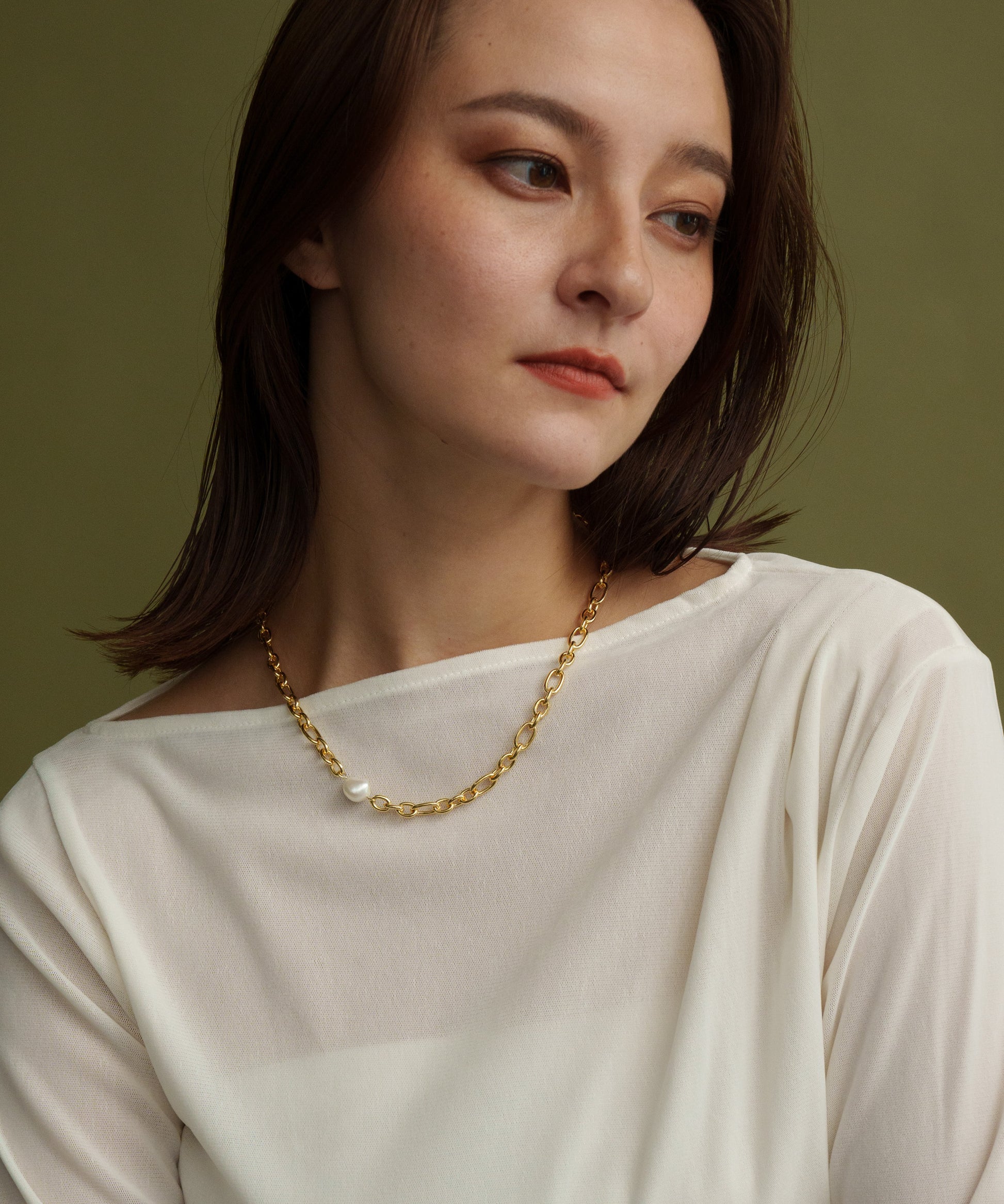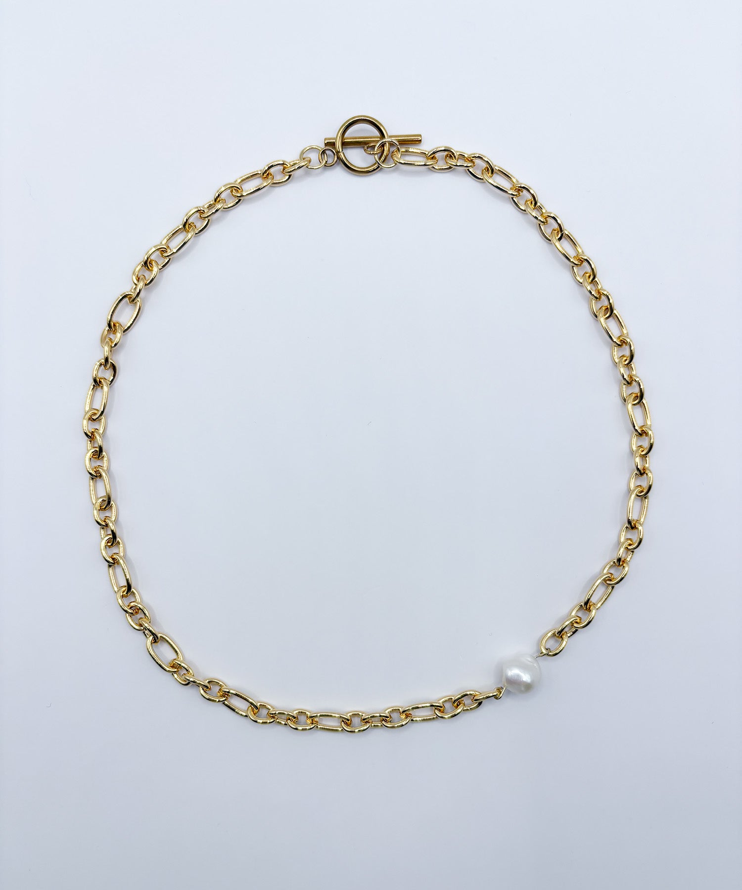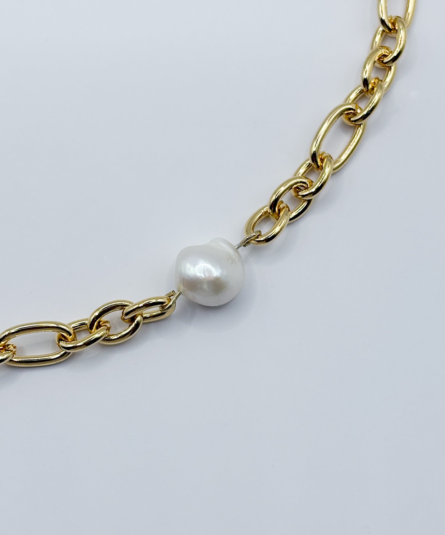 ミディアムサイズのオーバルとサークルパーツをミックスした、尖り感のあるチェーン。そこに一粒のパールを添えることで、甘さとシャープさが調和したネックレスに仕上げています。