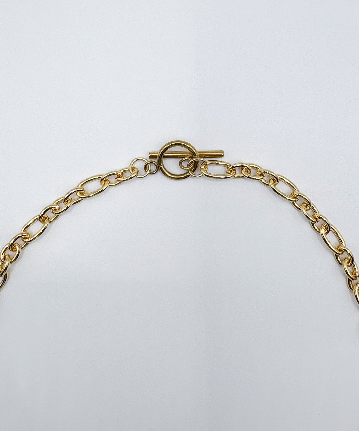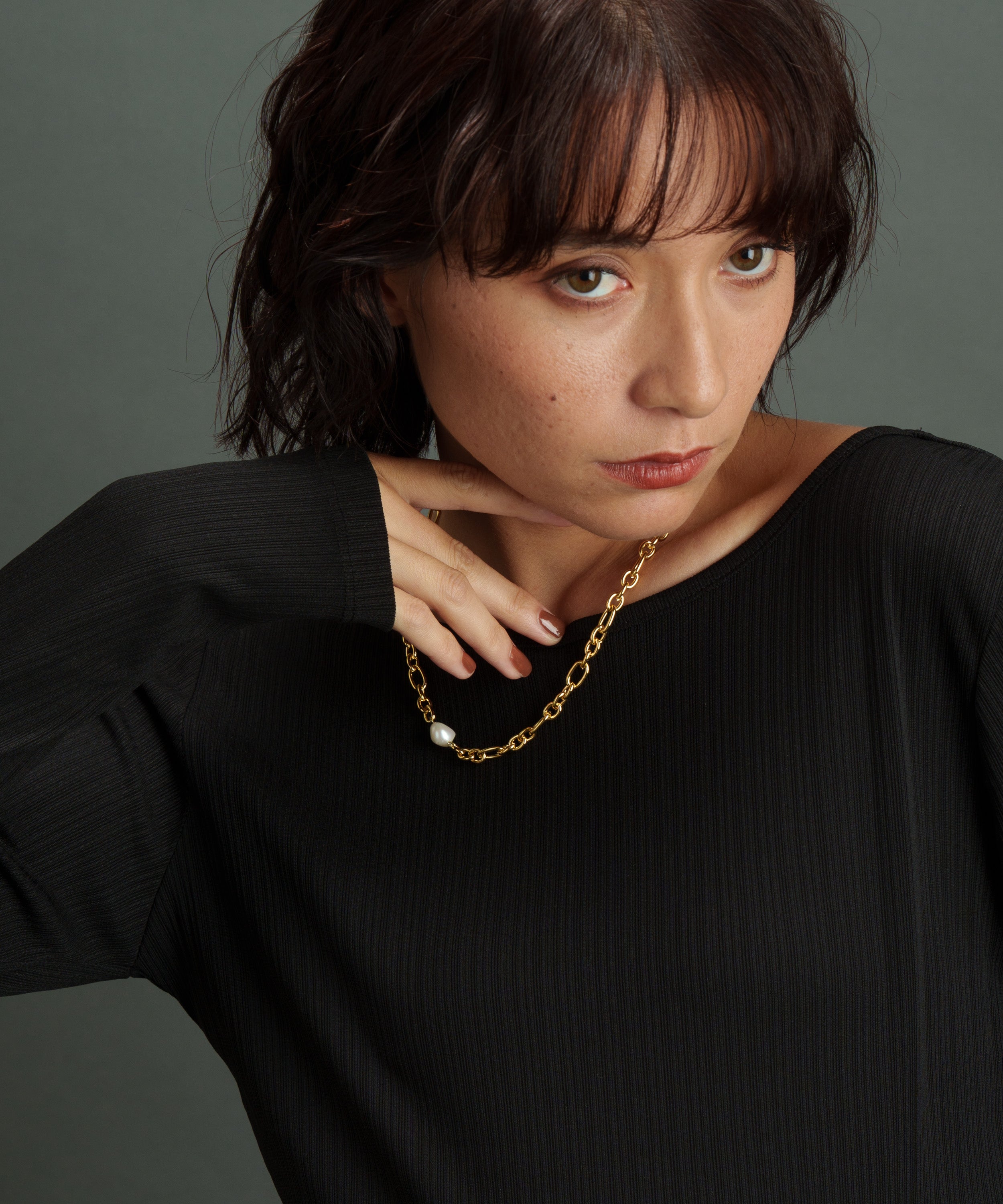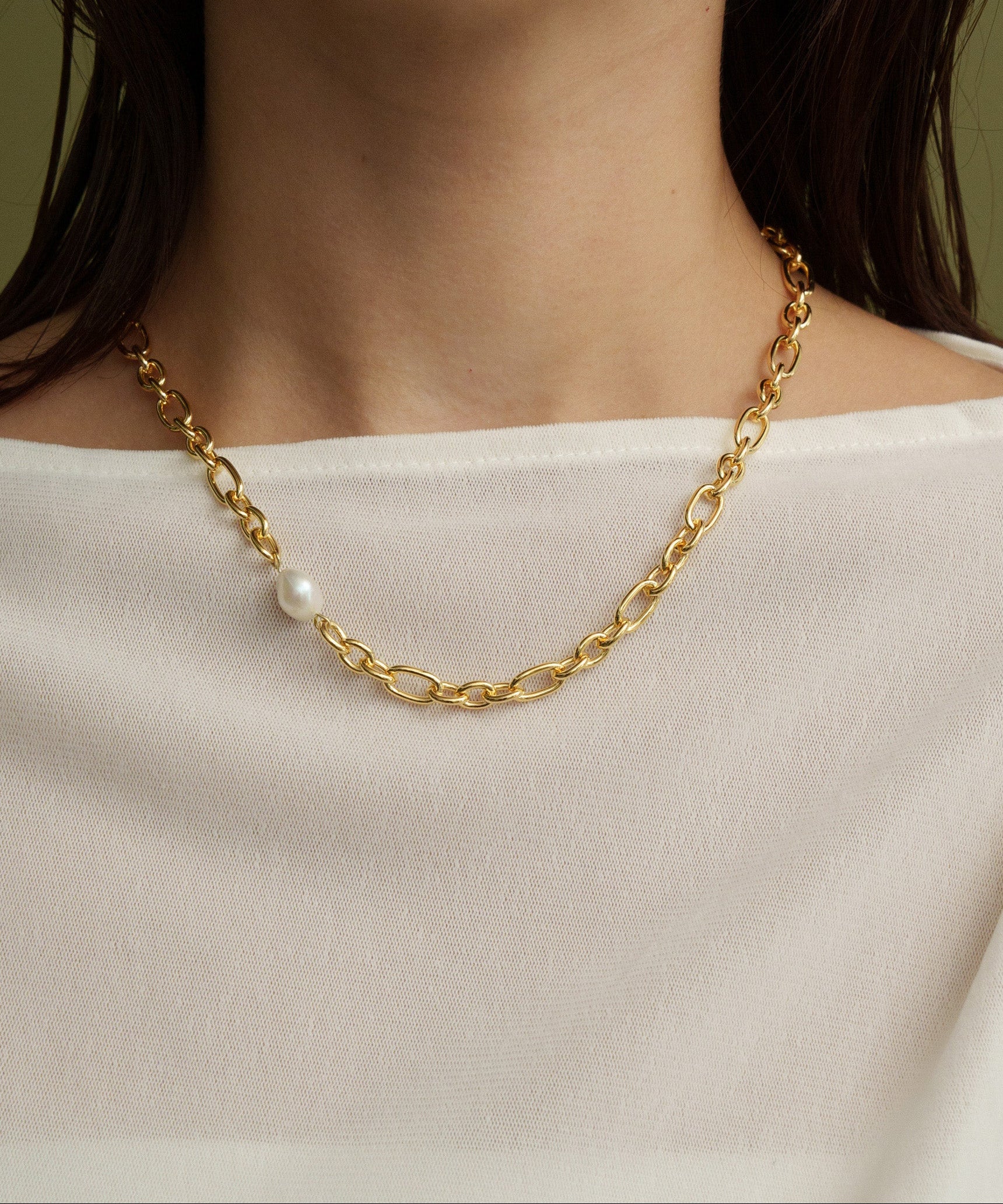ミディアムサイズのオーバルとサークルパーツをミックスした、尖り感のあるチェーン。そこに一粒のパールを添えることで、甘さとシャープさが調和したネックレスに仕上げています。