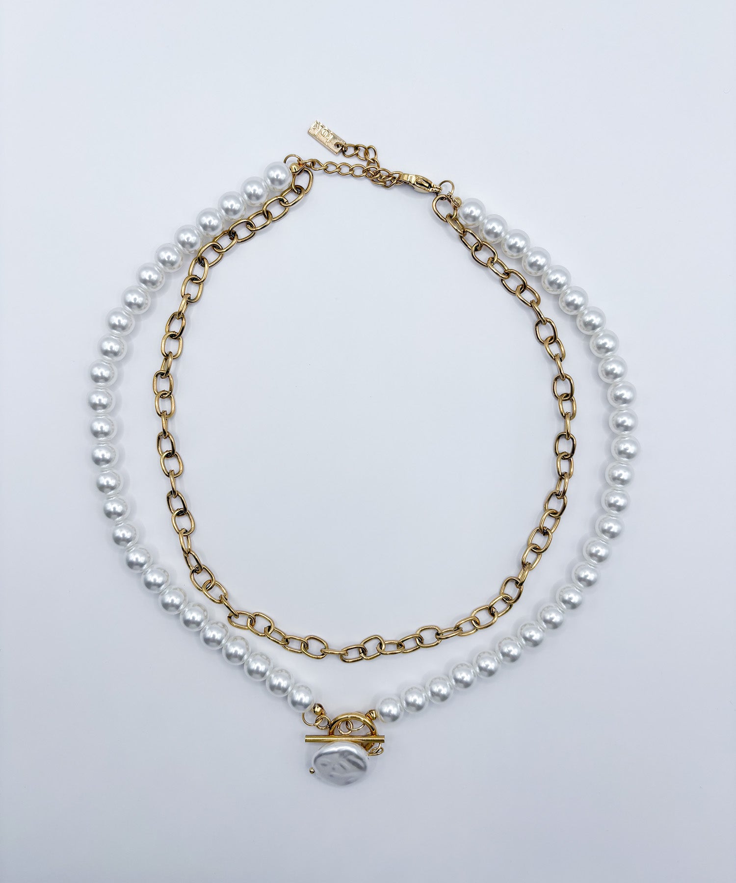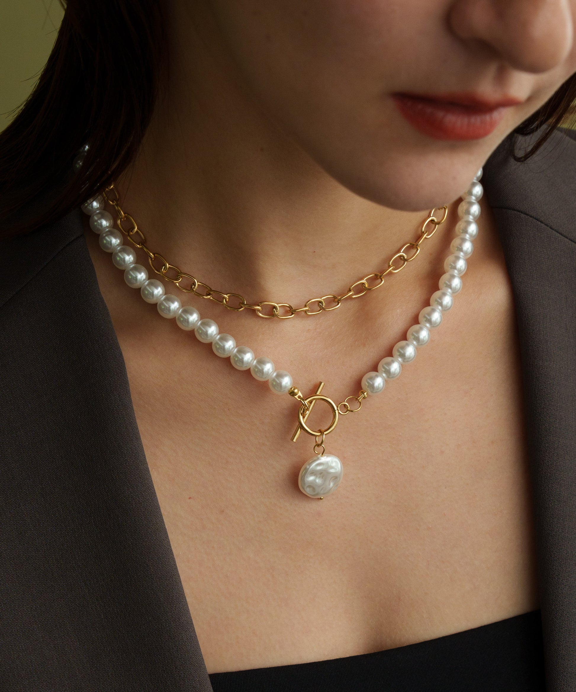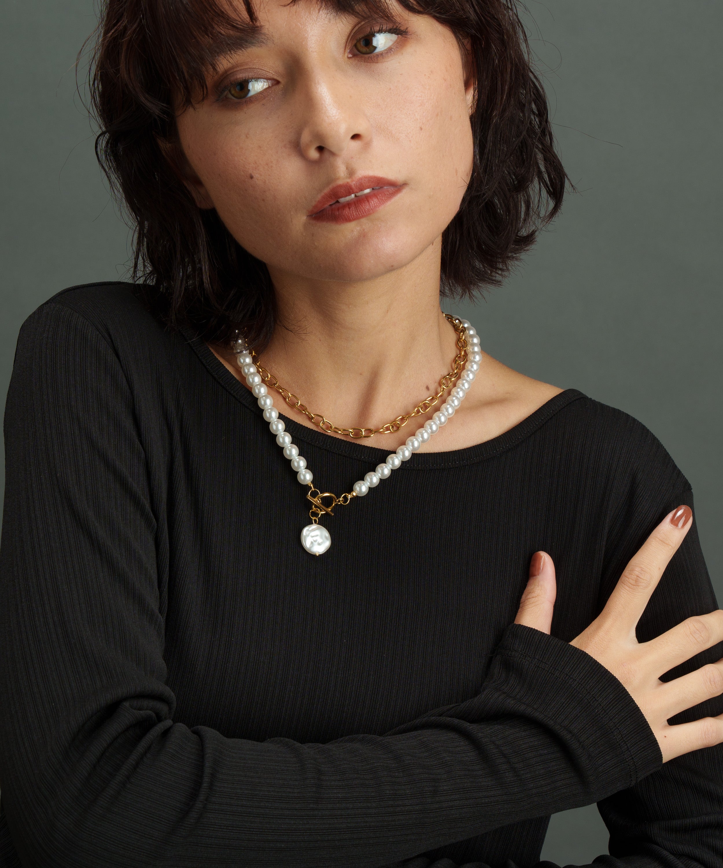 ヴィンテージ感のあるチェーンに、上品に輝くパールをレイヤードしたネックレス。やや大きめのパールもチェーンとのバランスで、カジュアルスタイルにもお使いいただけます。