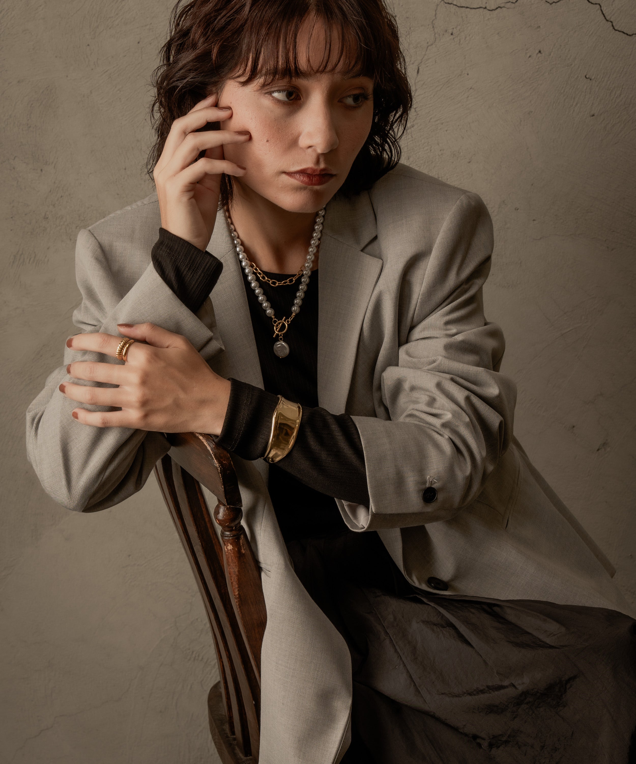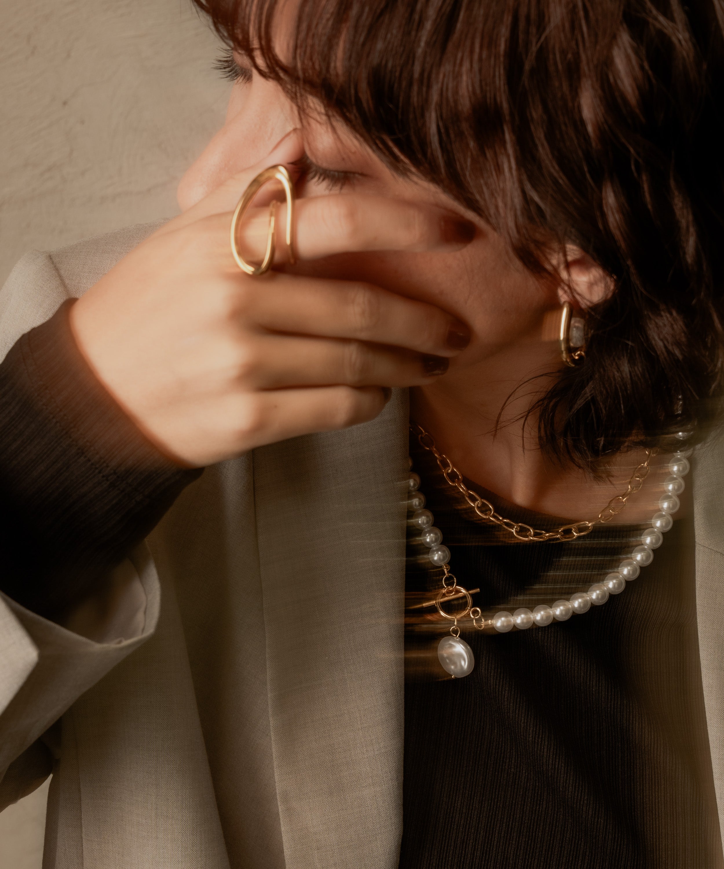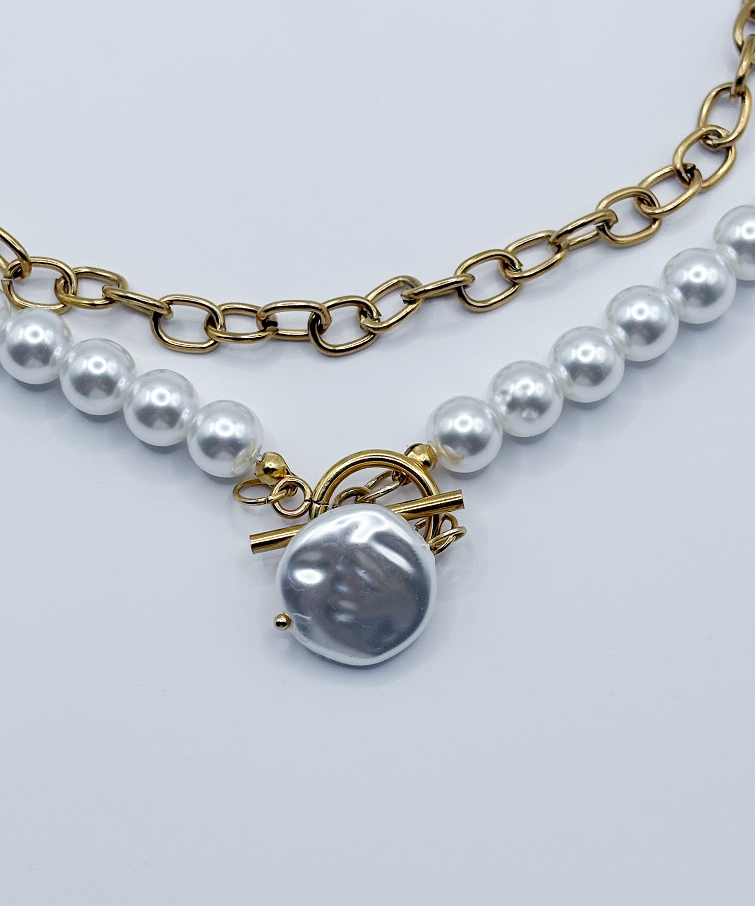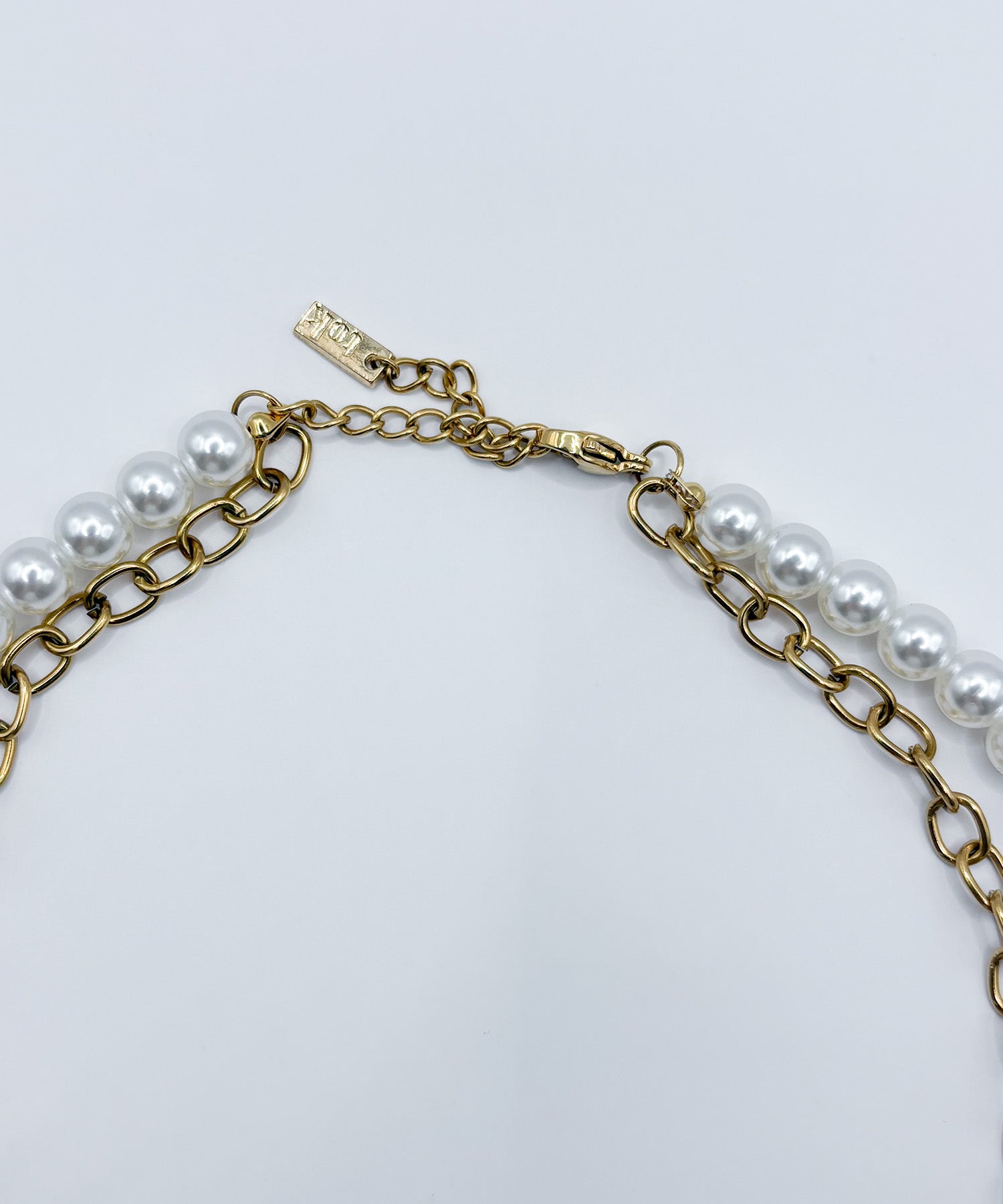 ヴィンテージ感のあるチェーンに、上品に輝くパールをレイヤードしたネックレス。やや大きめのパールもチェーンとのバランスで、カジュアルスタイルにもお使いいただけます。
