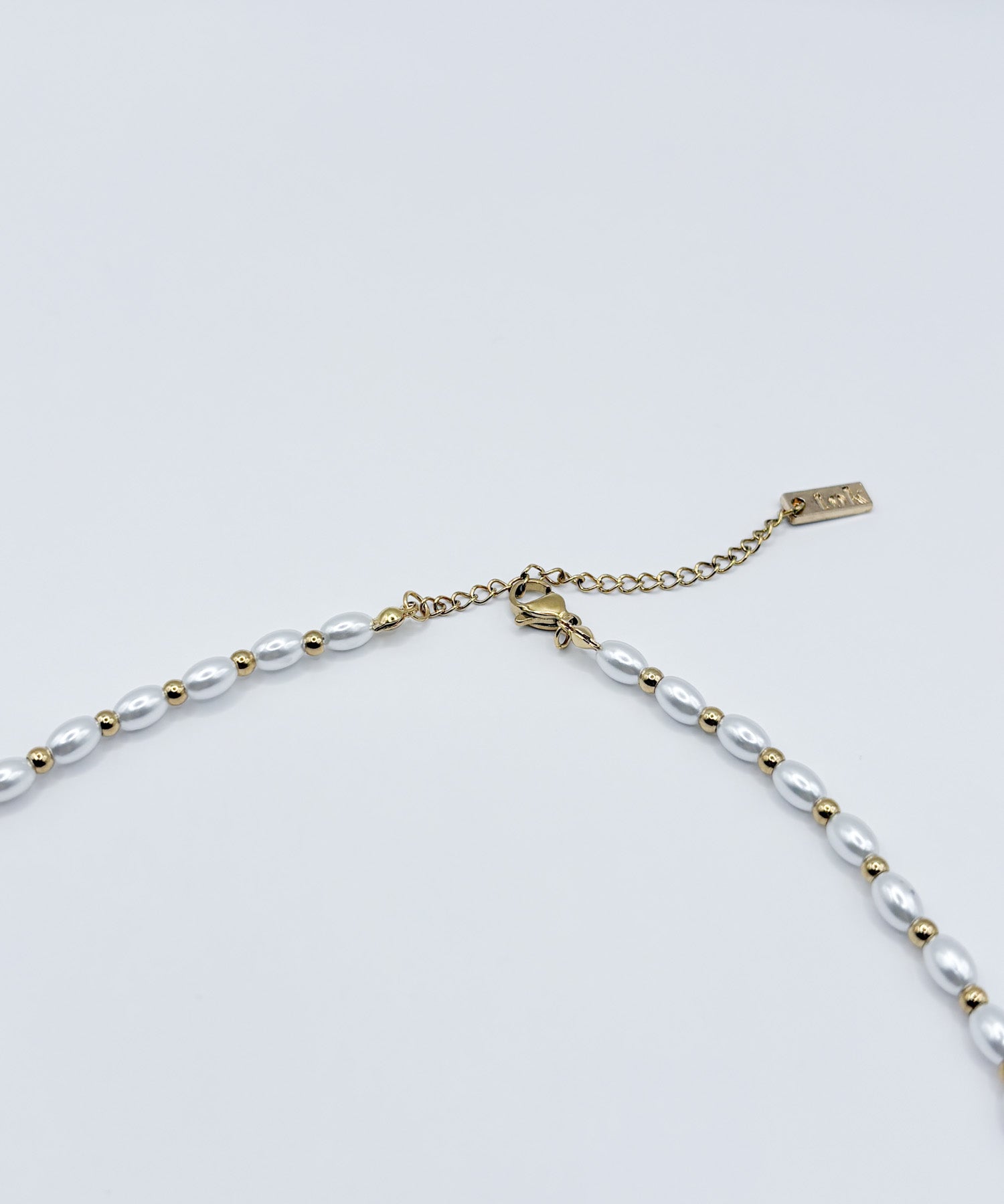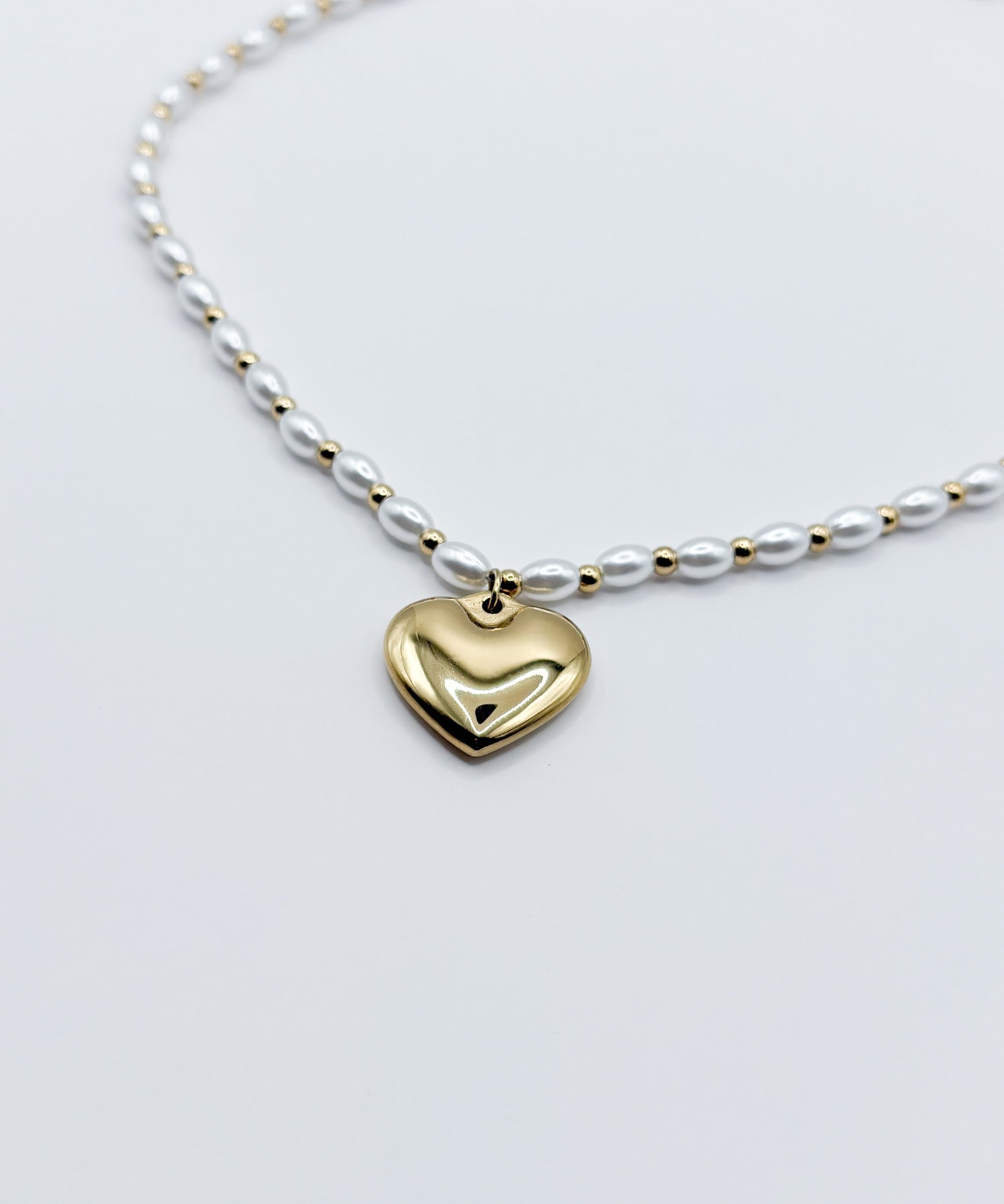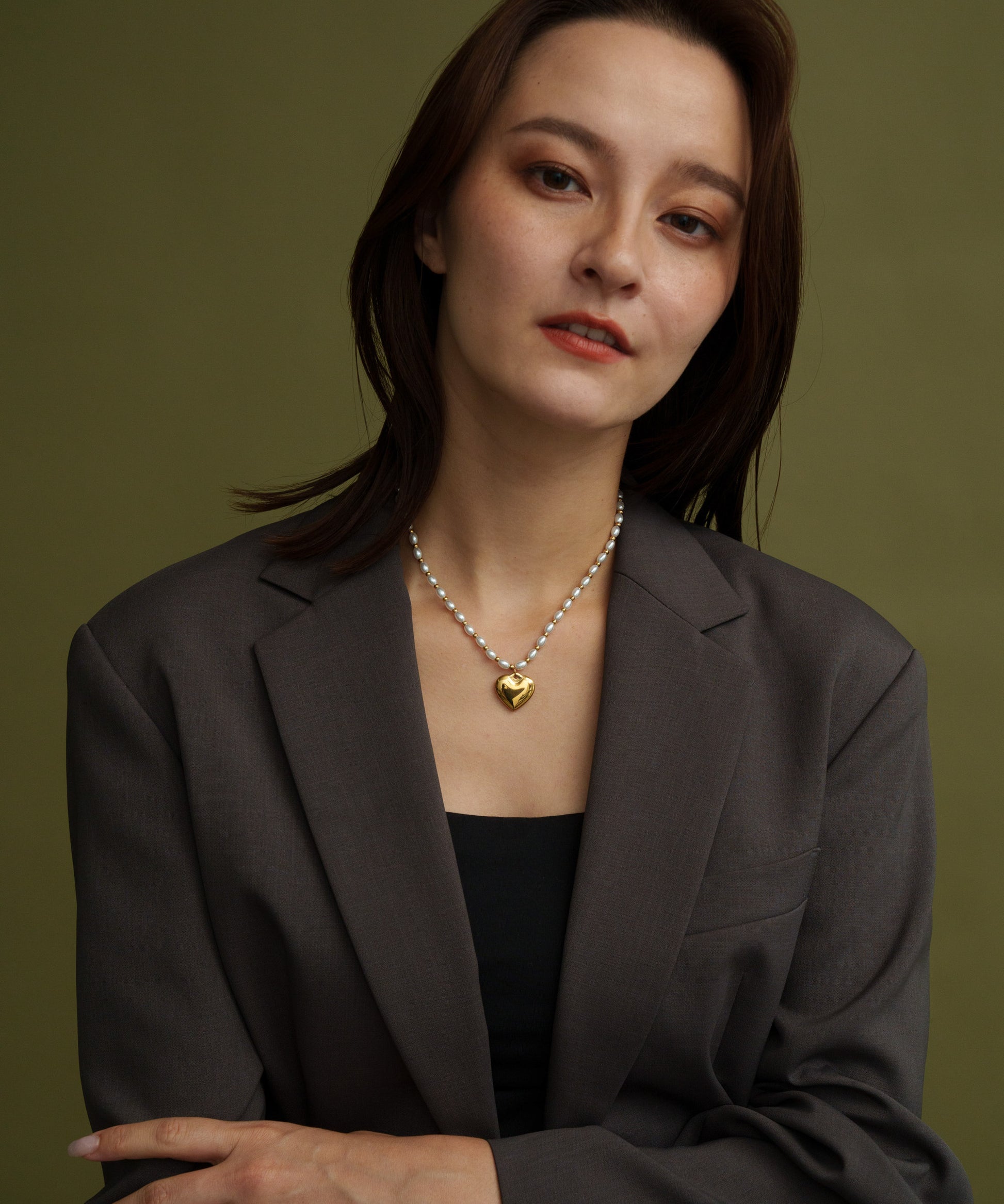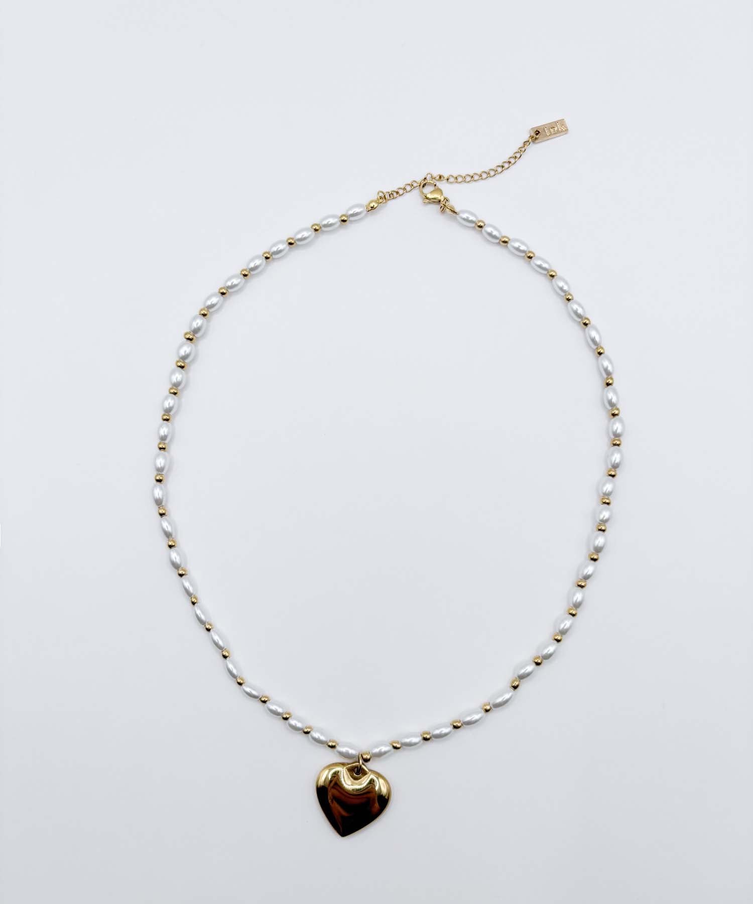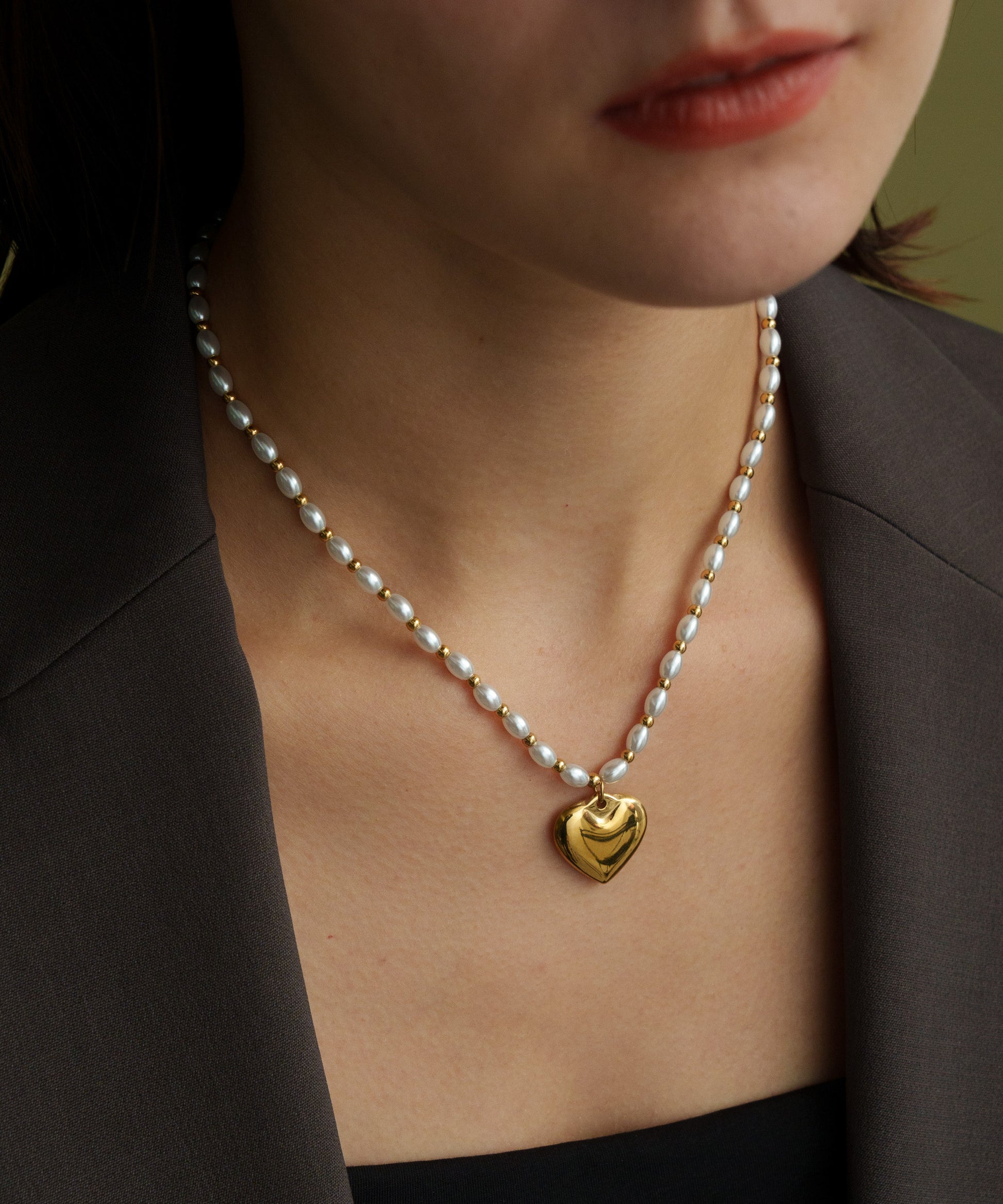 楕円のパールパーツと金属ボールを交互に組み合わせたチェーンのトップに、ぷっくり可愛らしいハートチャームを添えたガーリーなネックレスです。