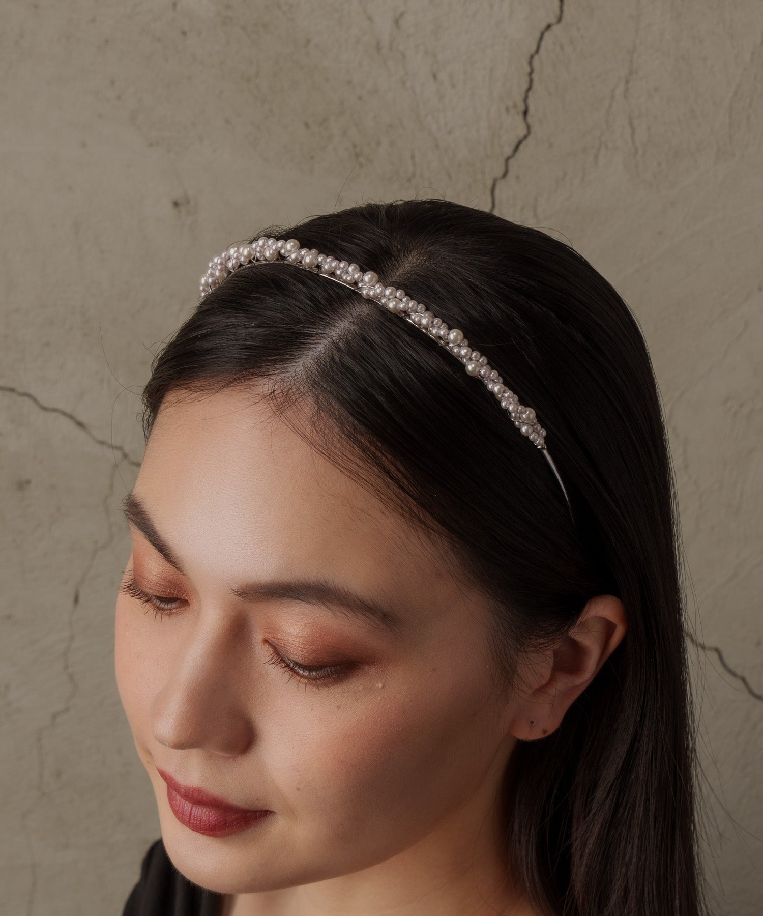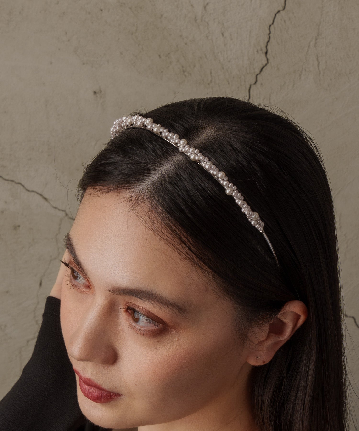 細めの土台にパールを配列し、厚みを出したカチューシャ。オケージョンコーデをより華やかに演出してくれます。