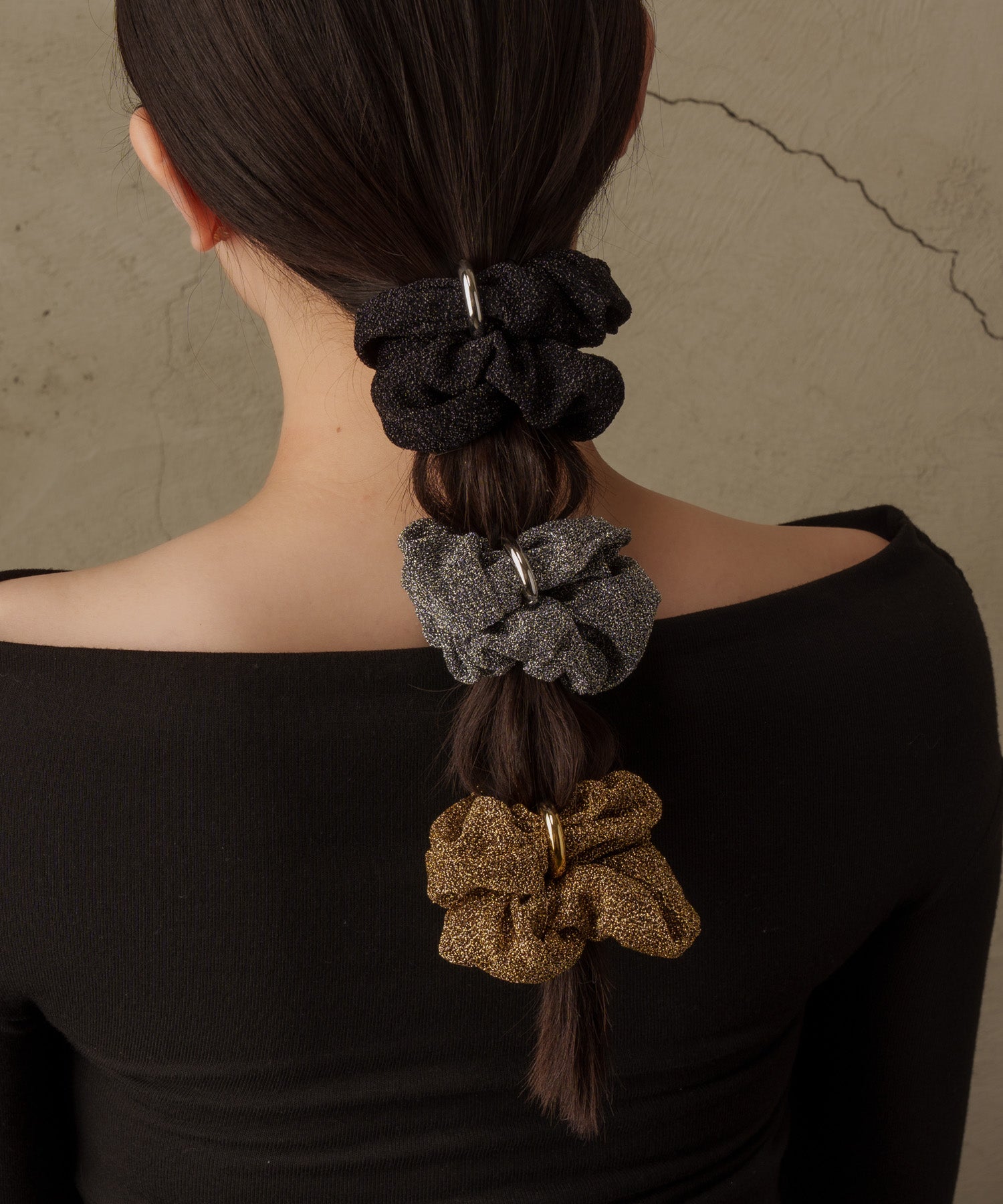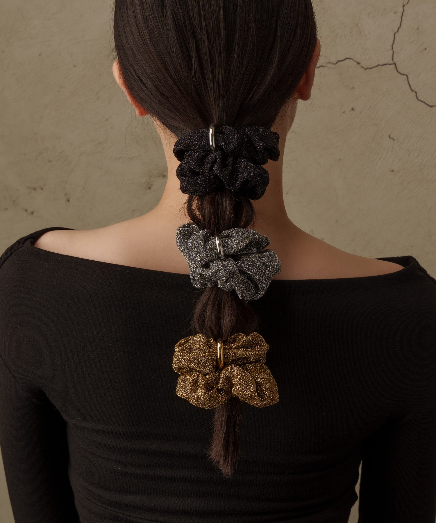 光り過ぎないラメ生地を使用したシュシュなのでデイリー使いに最適。付属のリングは真鍮素材の為アレルギー非対応です。