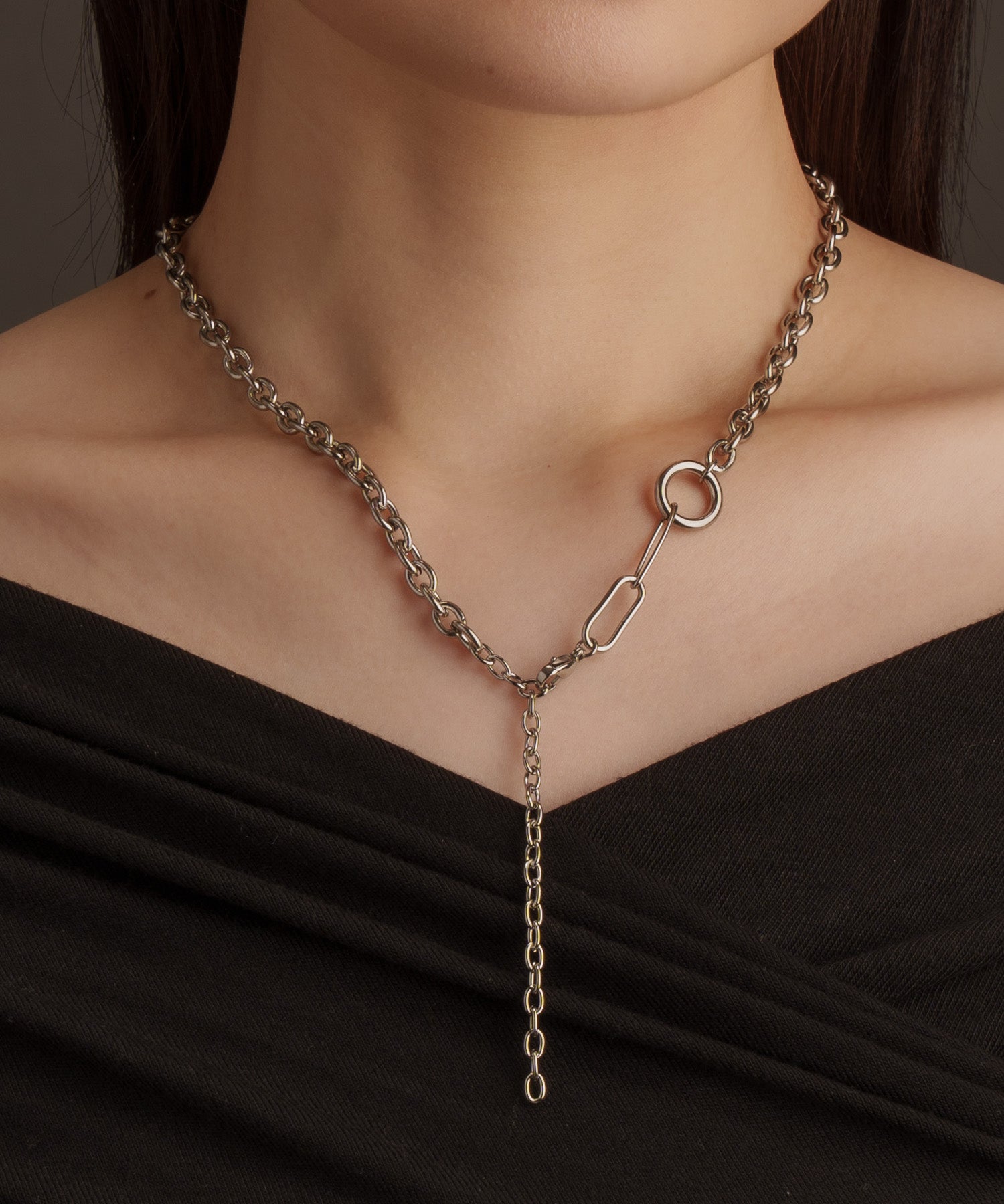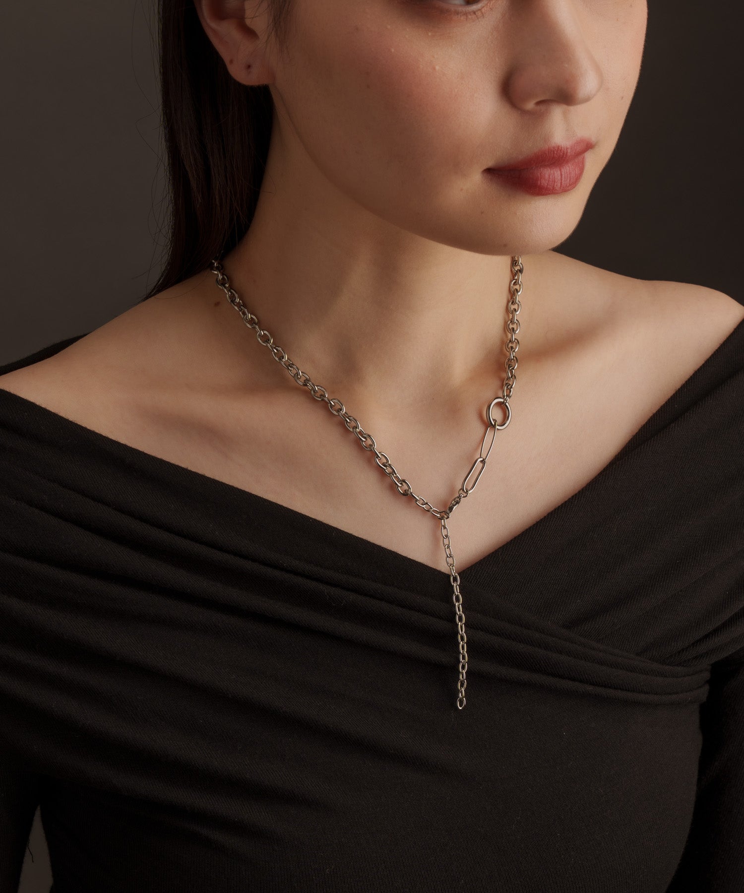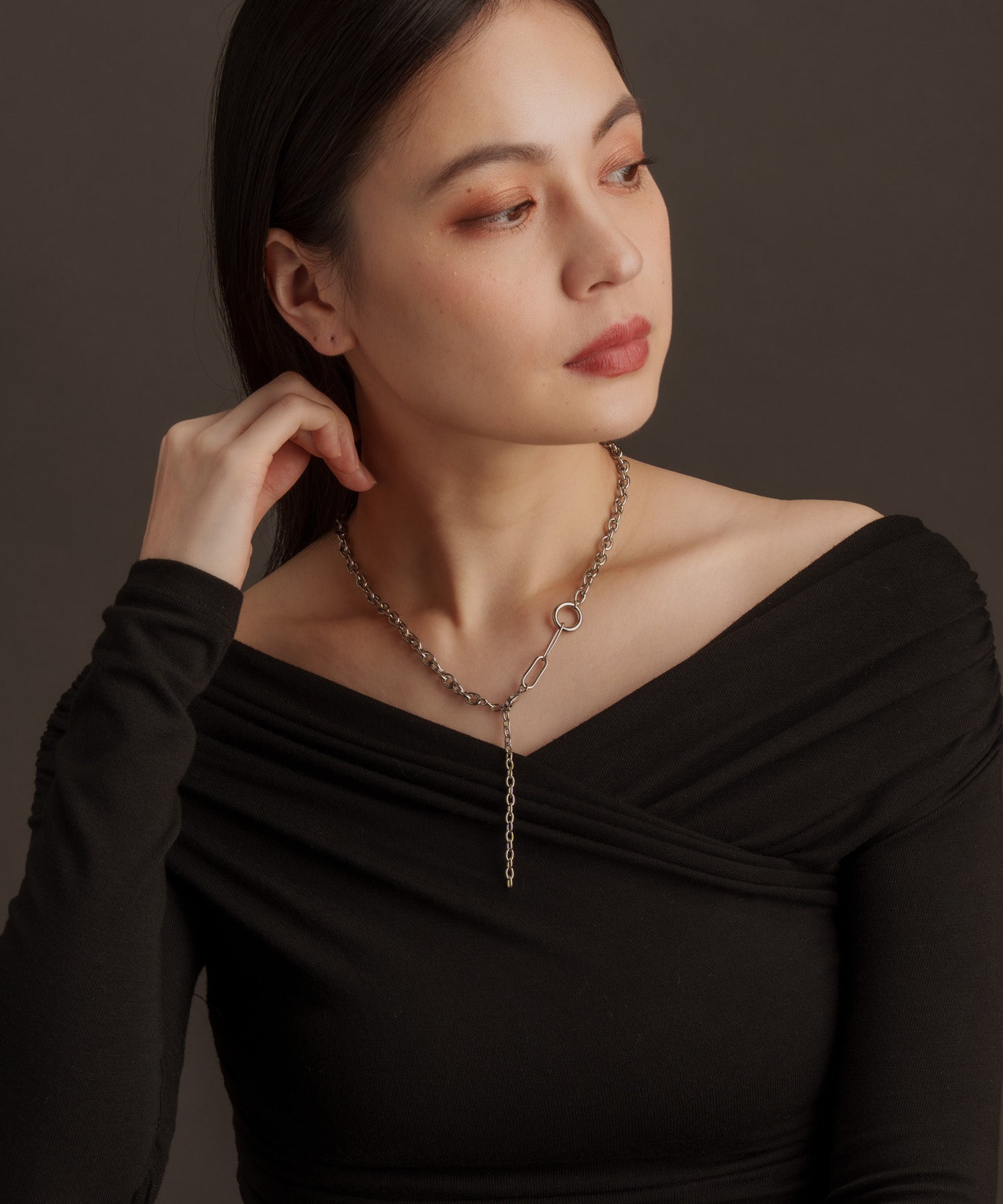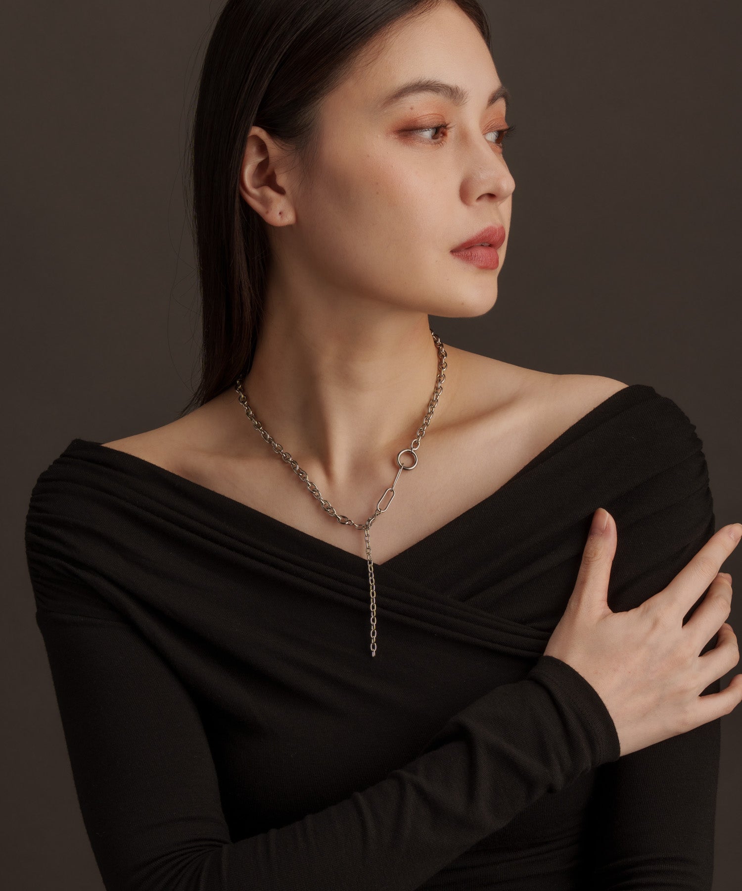 サイドにデザイン違いのチェーンを加えて一癖プラス。留め位置を変えれば通常のネックレスにも変身。