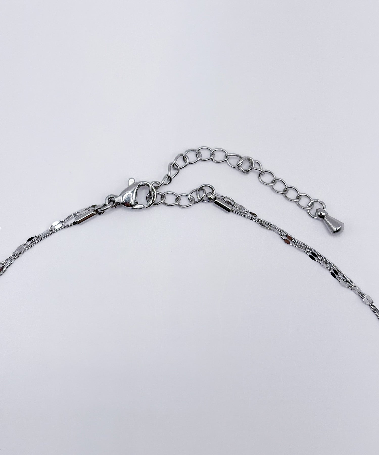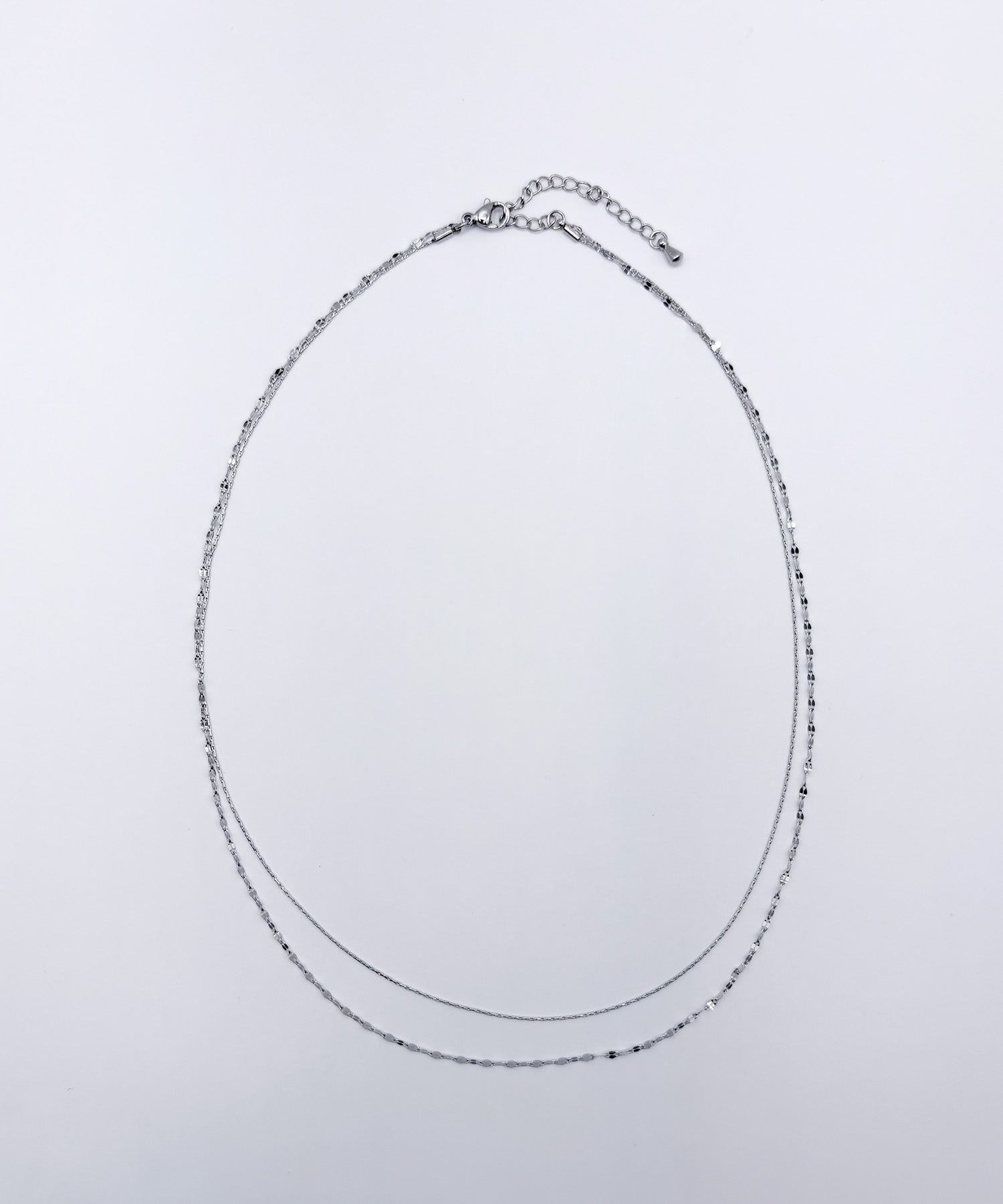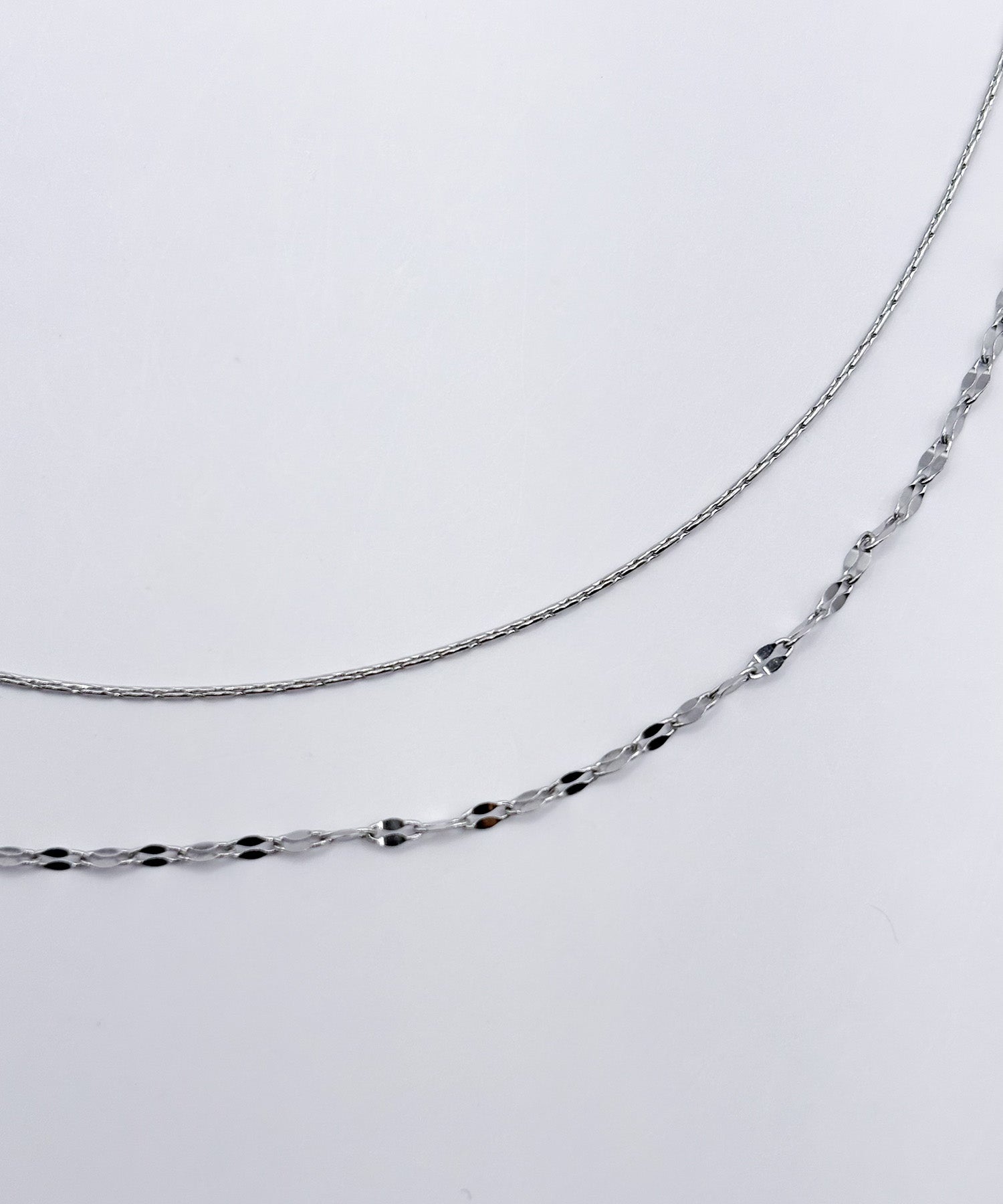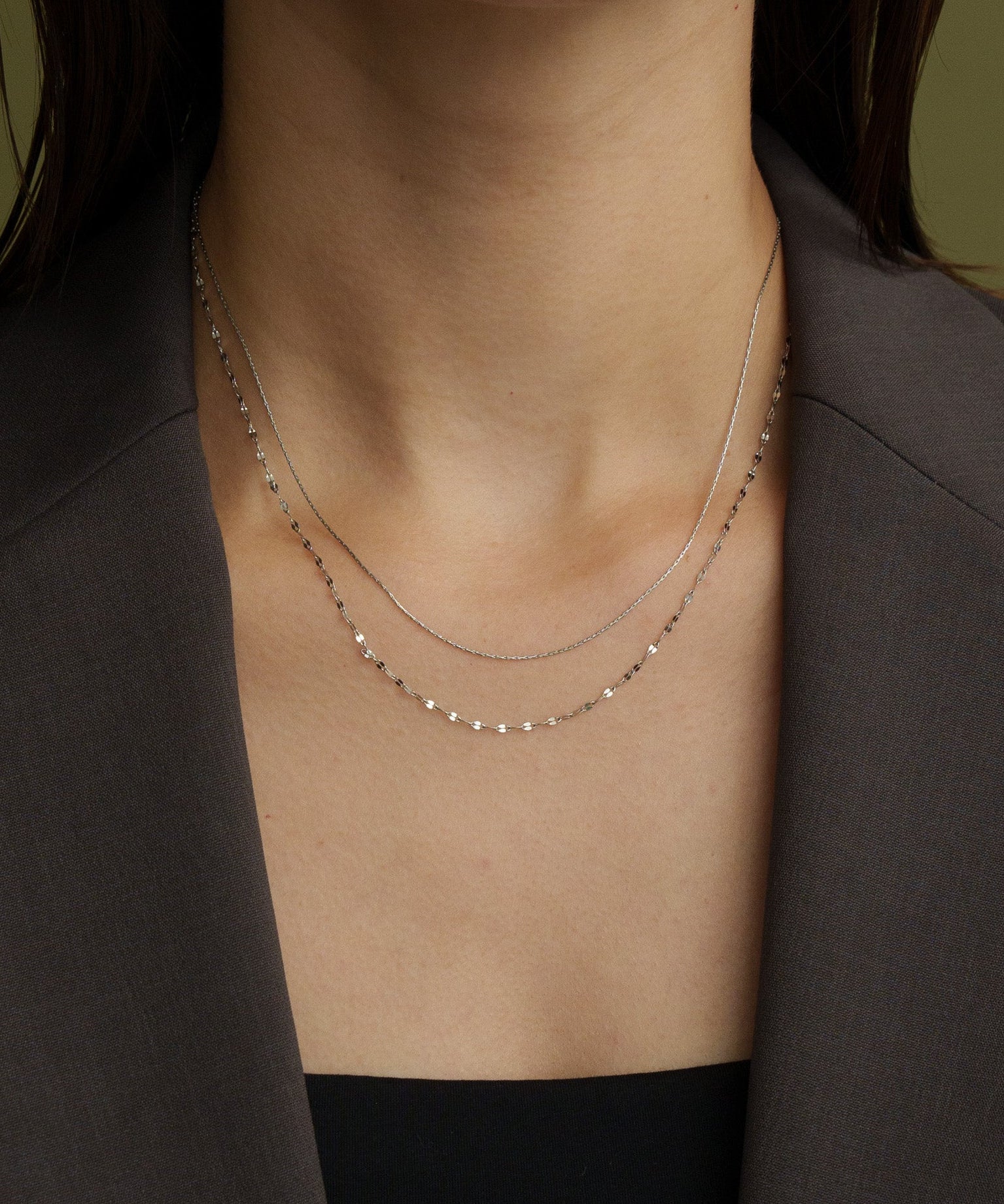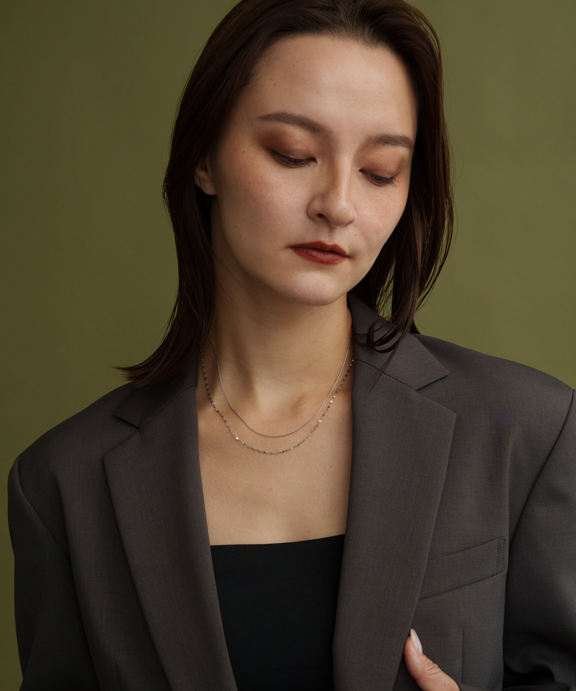 中央を潰したかのようなコマのペタルチェーンと細い鎖のようなチェーンをレイヤードしドッキングした2連ネックレス。華奢なのにキラキラとした存在感があります。
