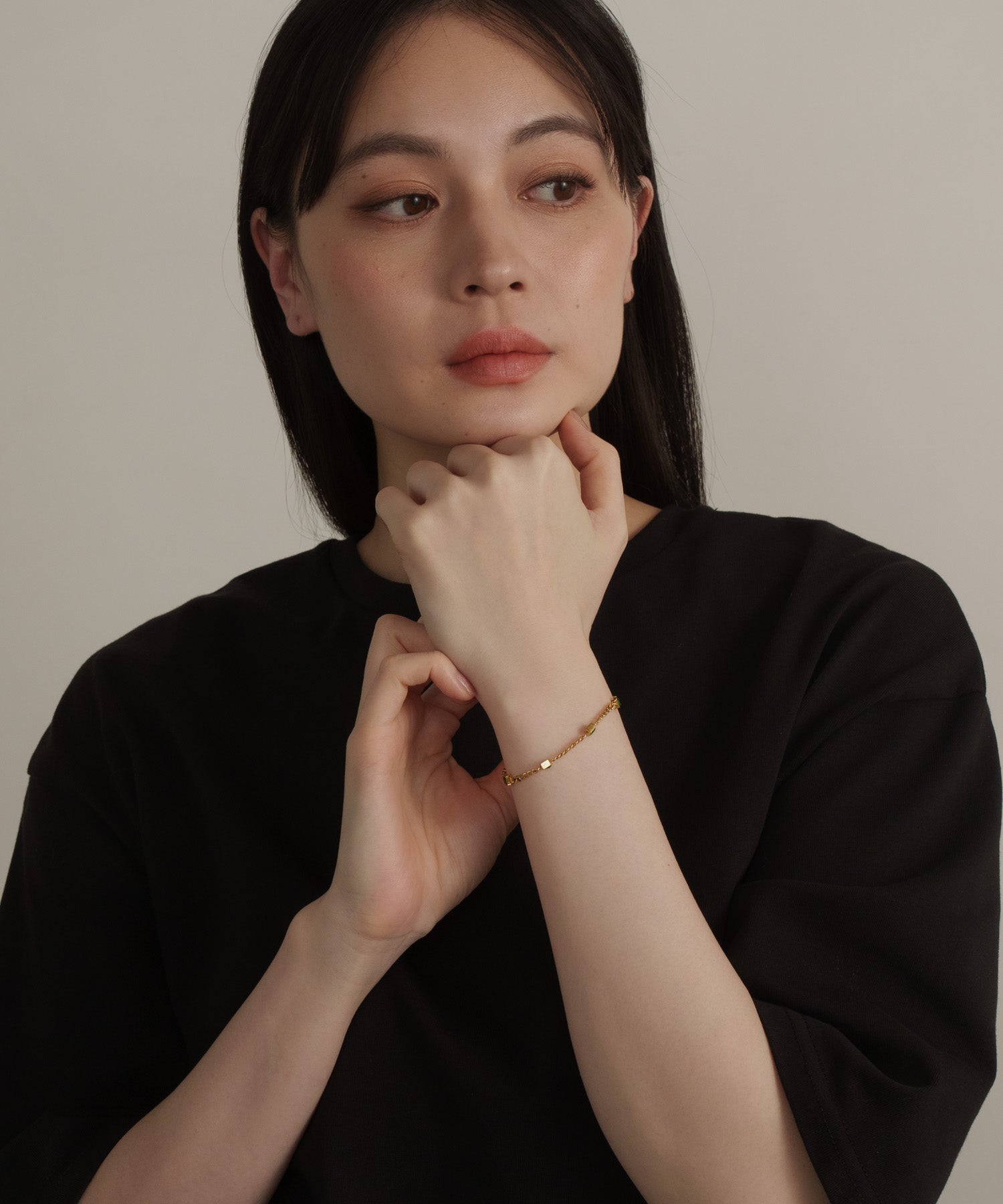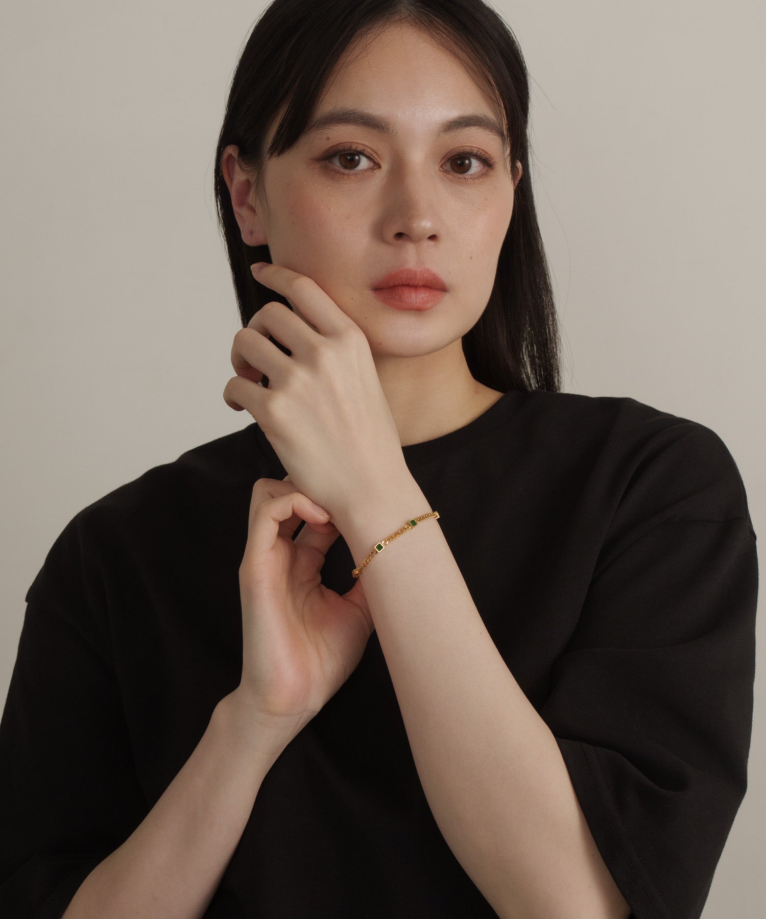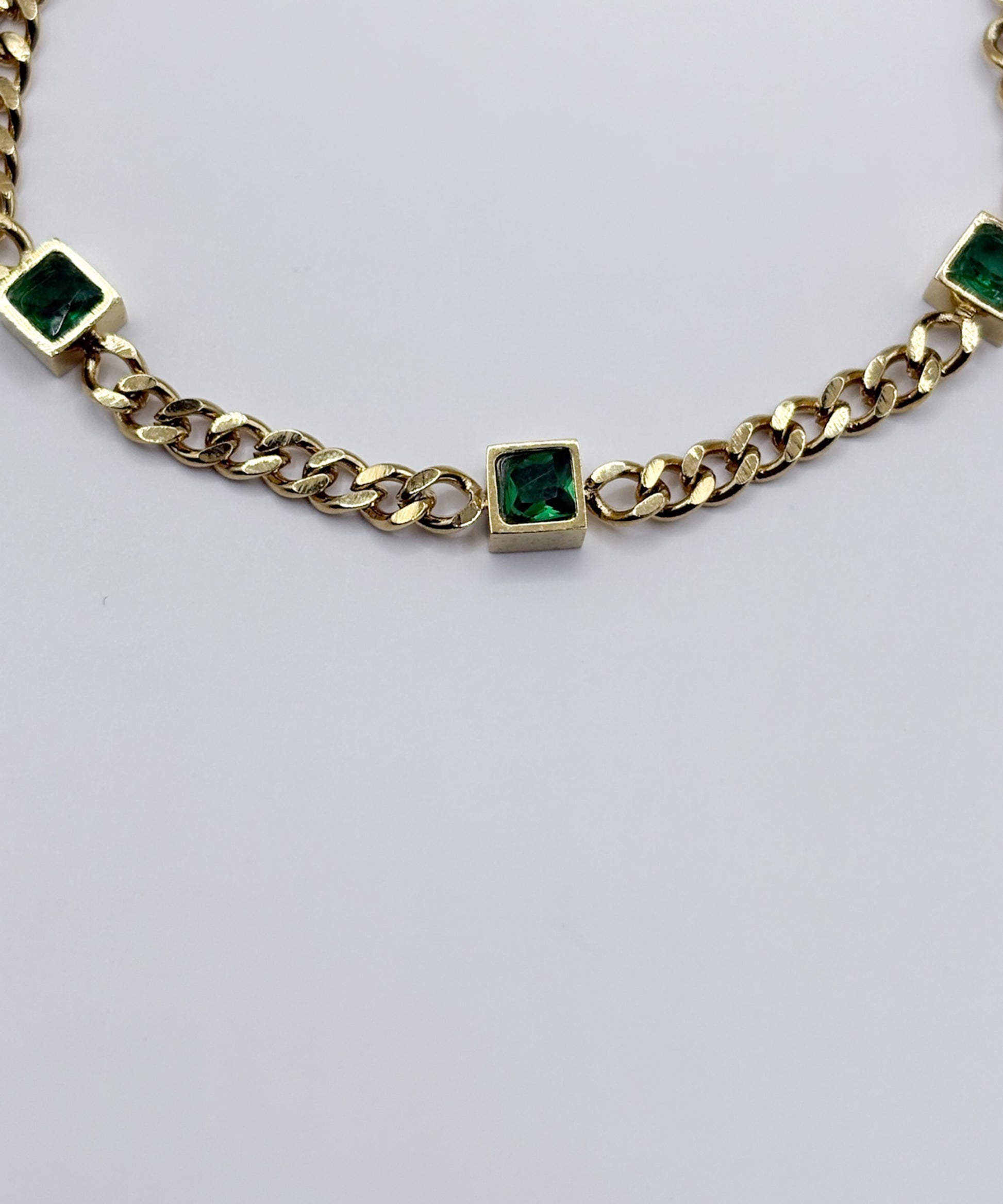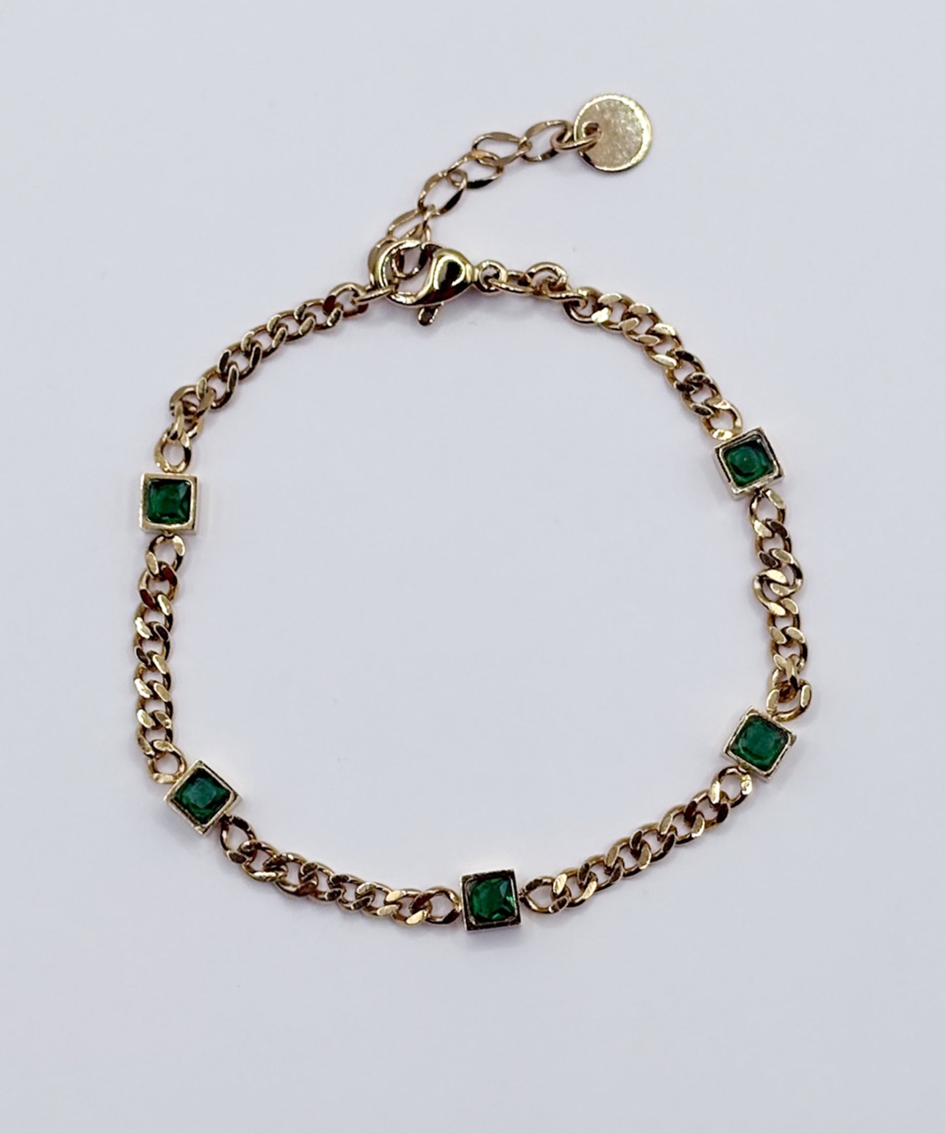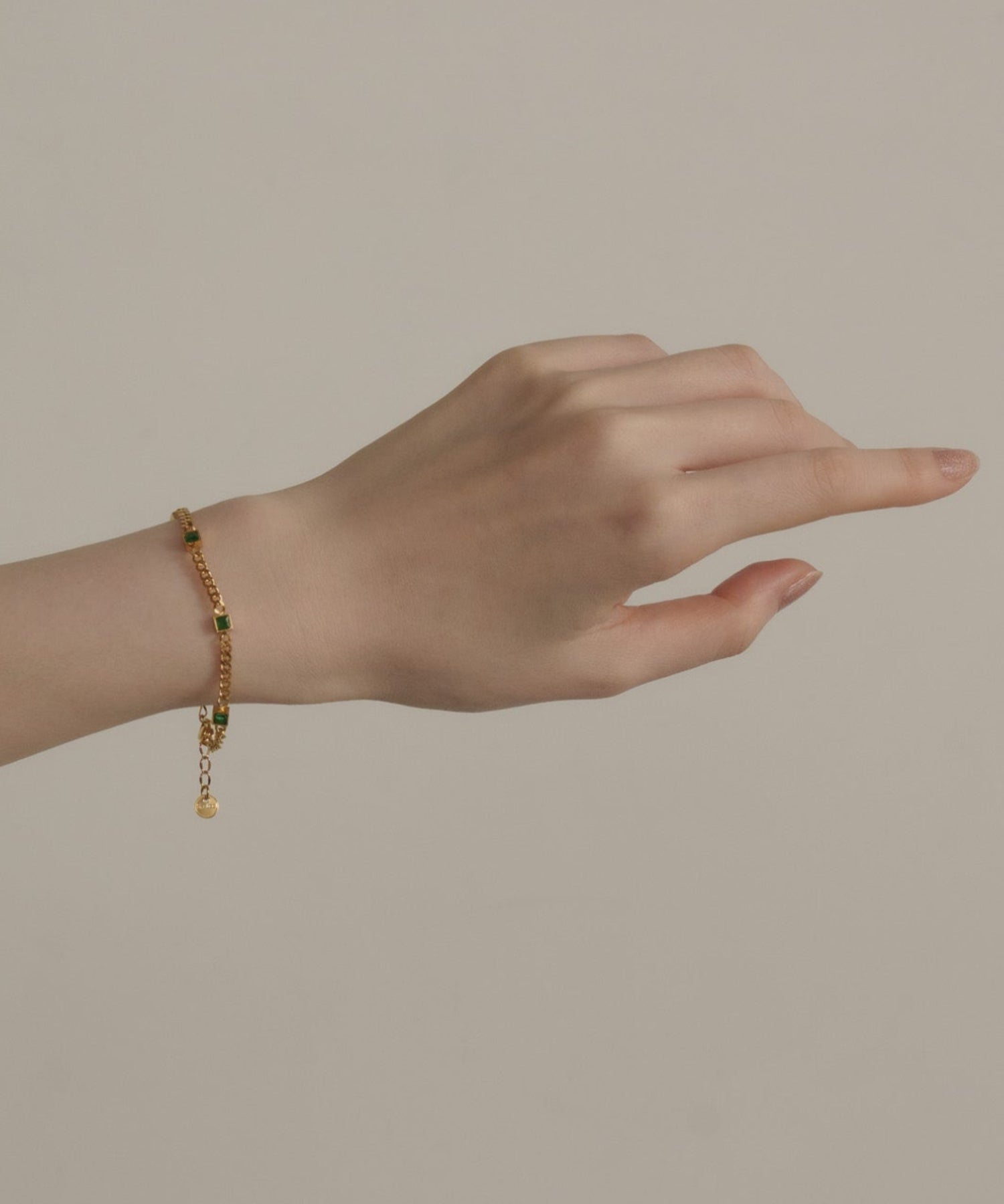 チェーンの間に並ぶグリーンカラーのスクエアストーンがポイントのブレスレット。ほどよくヴィンテージ感のあるデザインで、手元に落ち着いた華やかさを添えます。