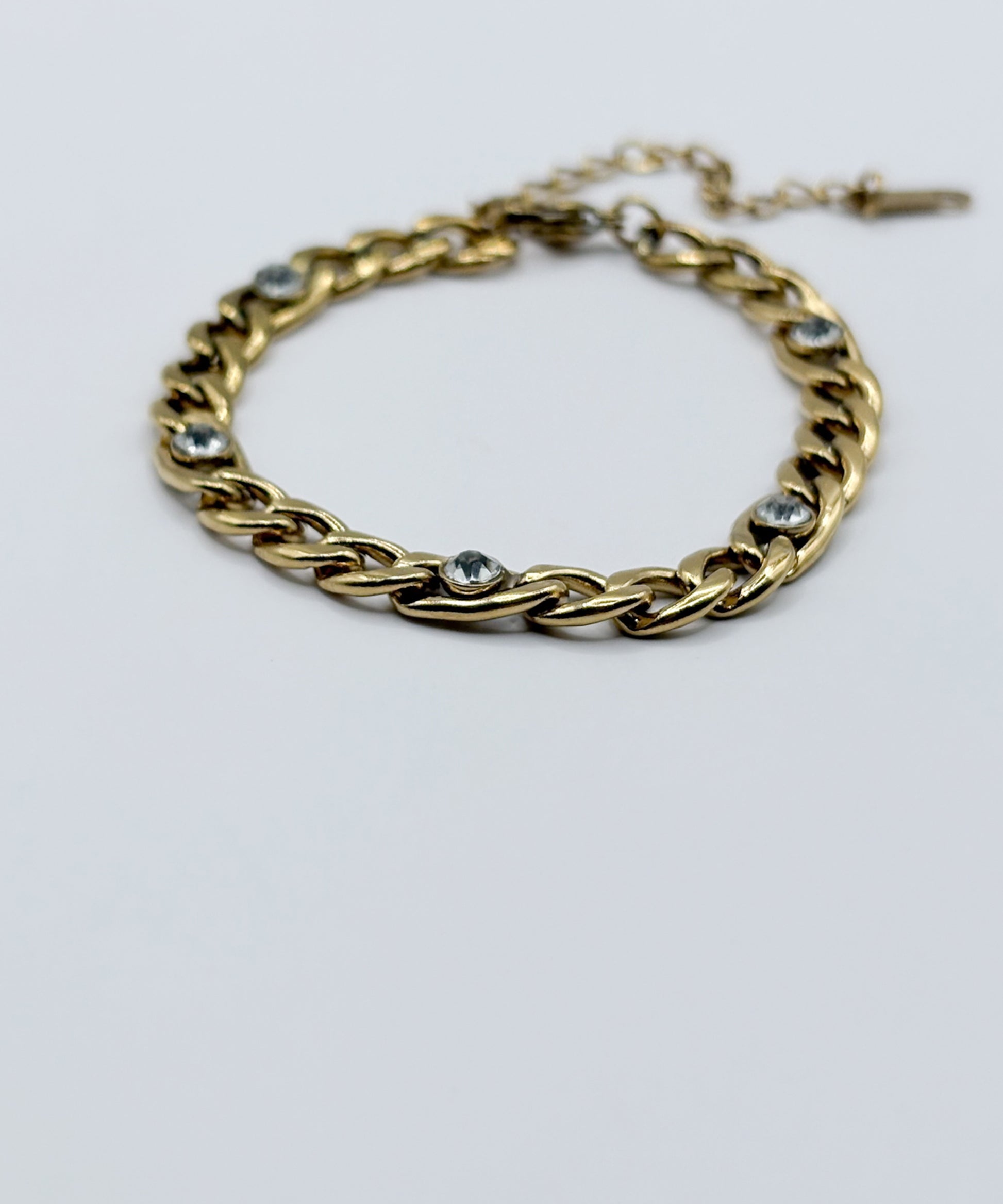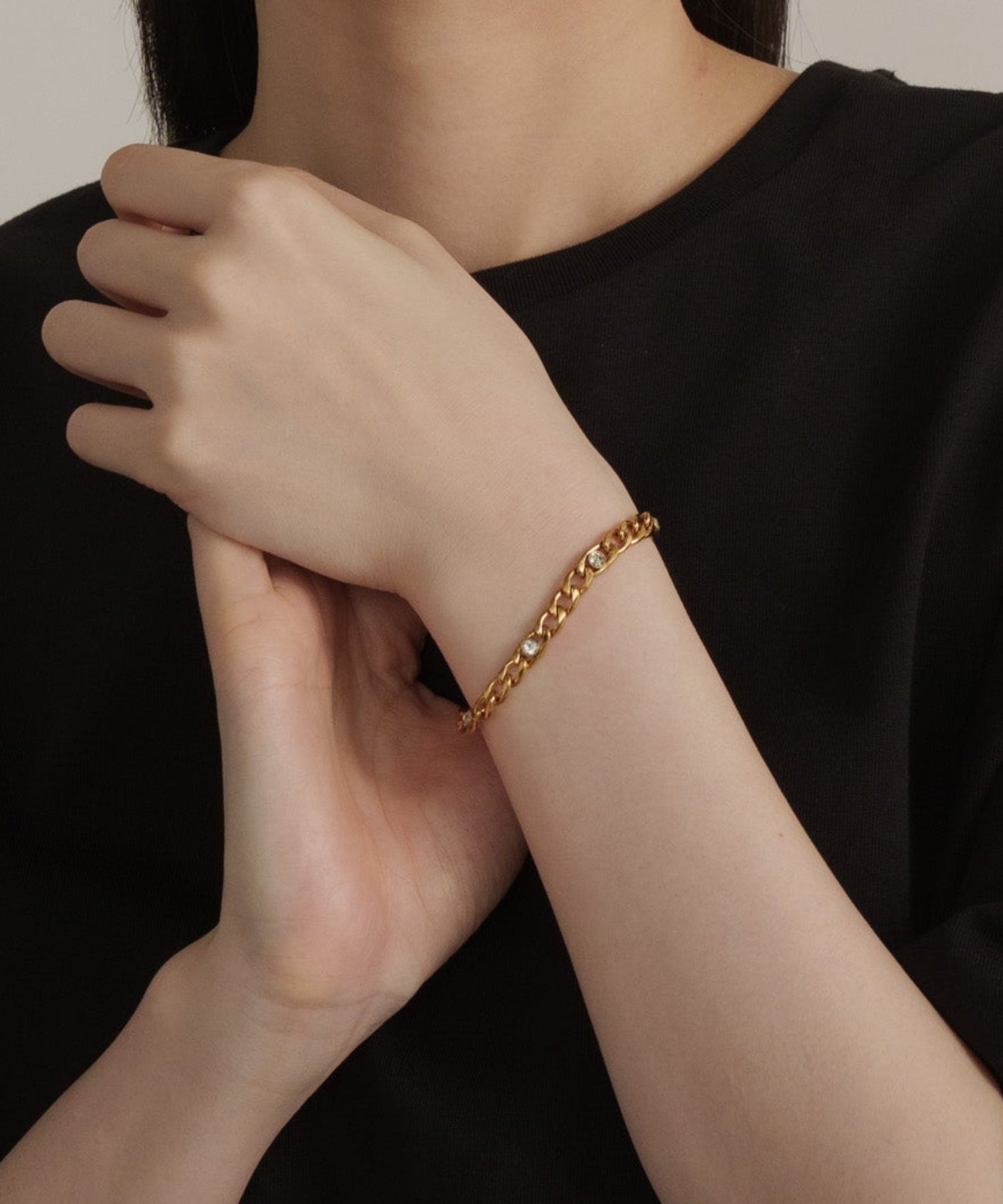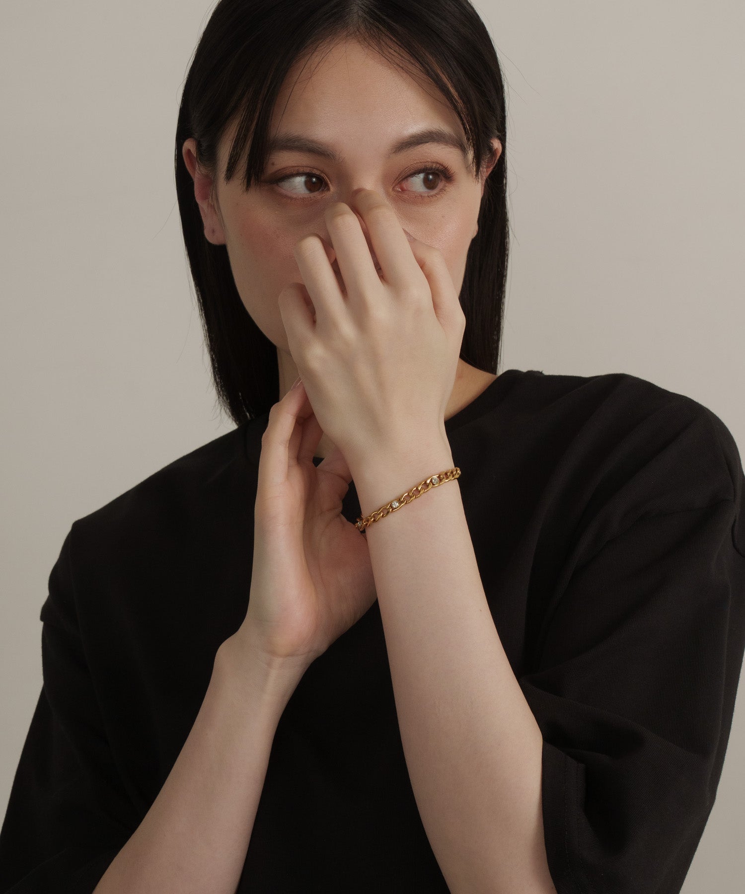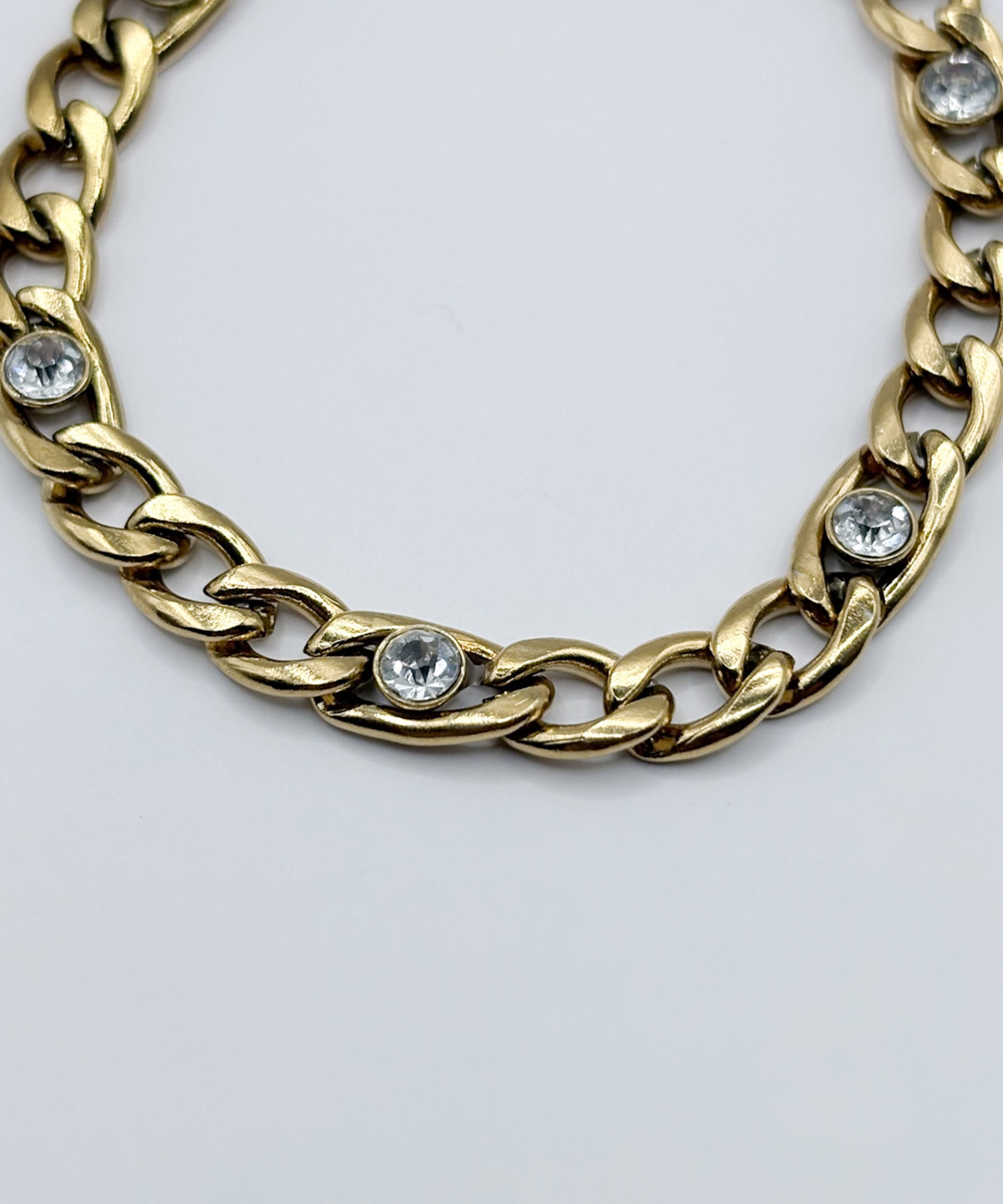ヴィンテージライクな色合いのGoldに、アクセントとしてストーンを配置。喜平チェーンを使用しつつも、コマが小さめで滑らかなため、ハードになりすぎず上品な印象に。
