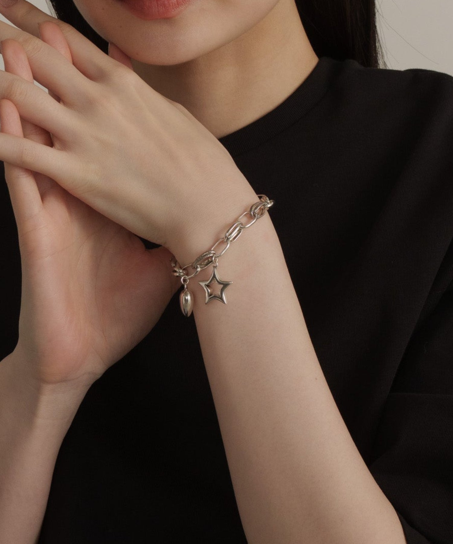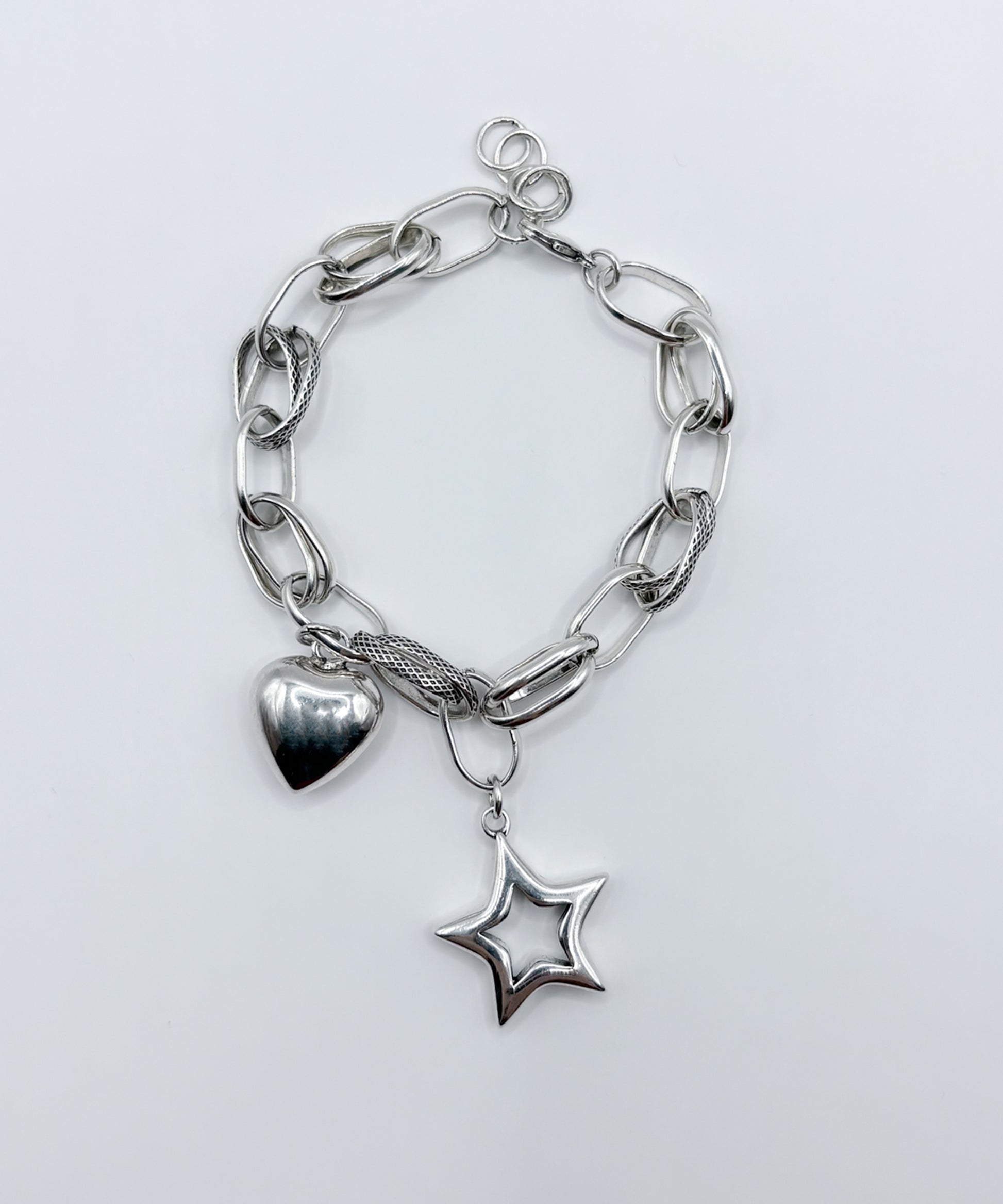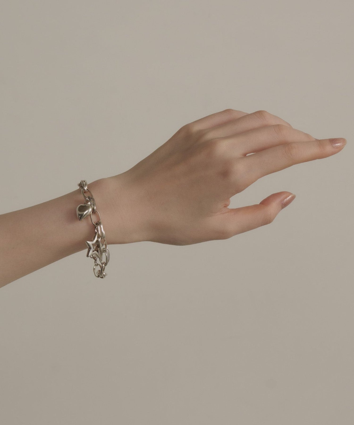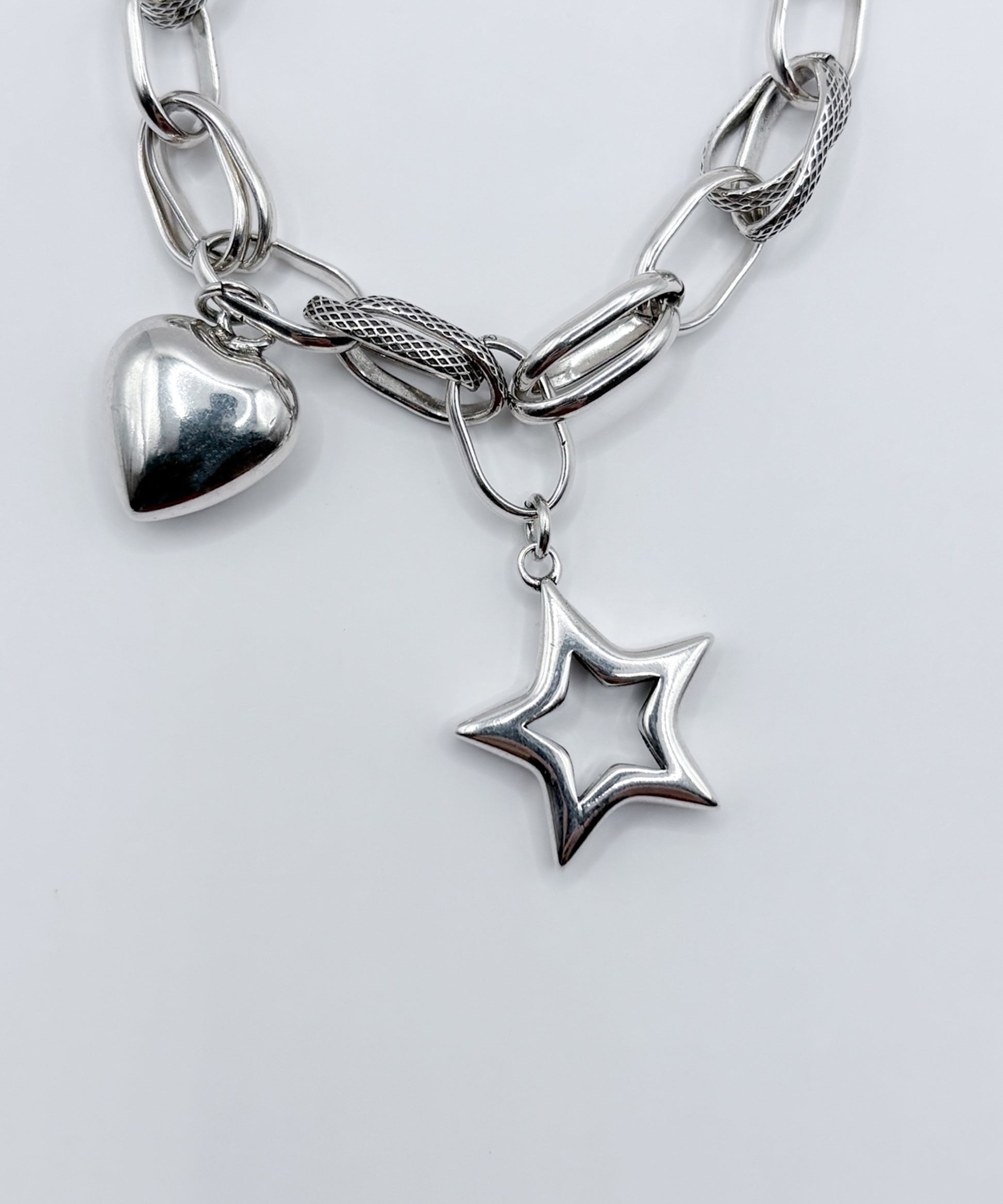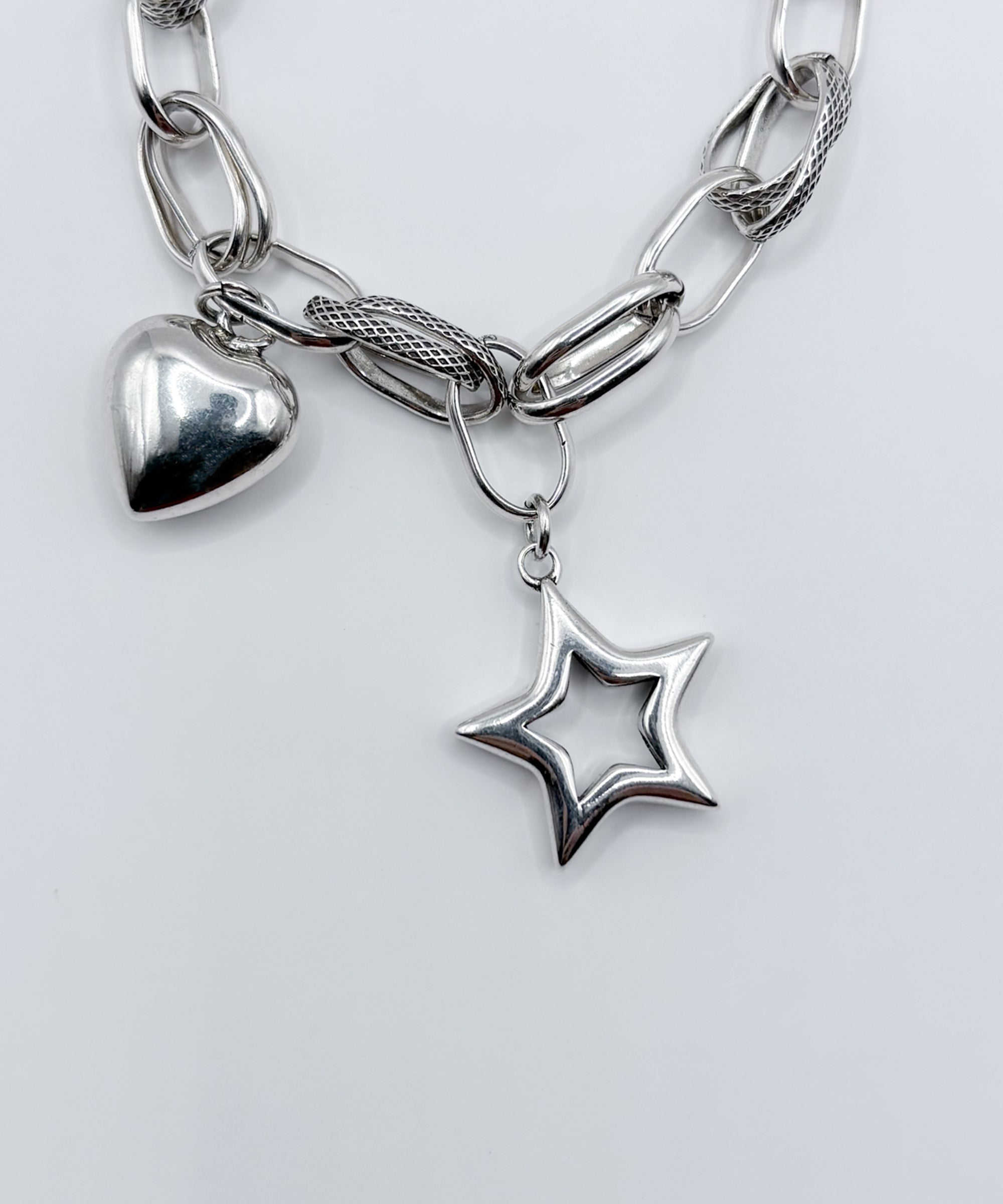 3Dのぷっくりとした星とハートのチャームが揺れ動き、目を引くデザイン。ステンレスにSilver925メッキを施し、カジュアルな印象に。ボリューミーなチェーンも軽やかな付け心地です。