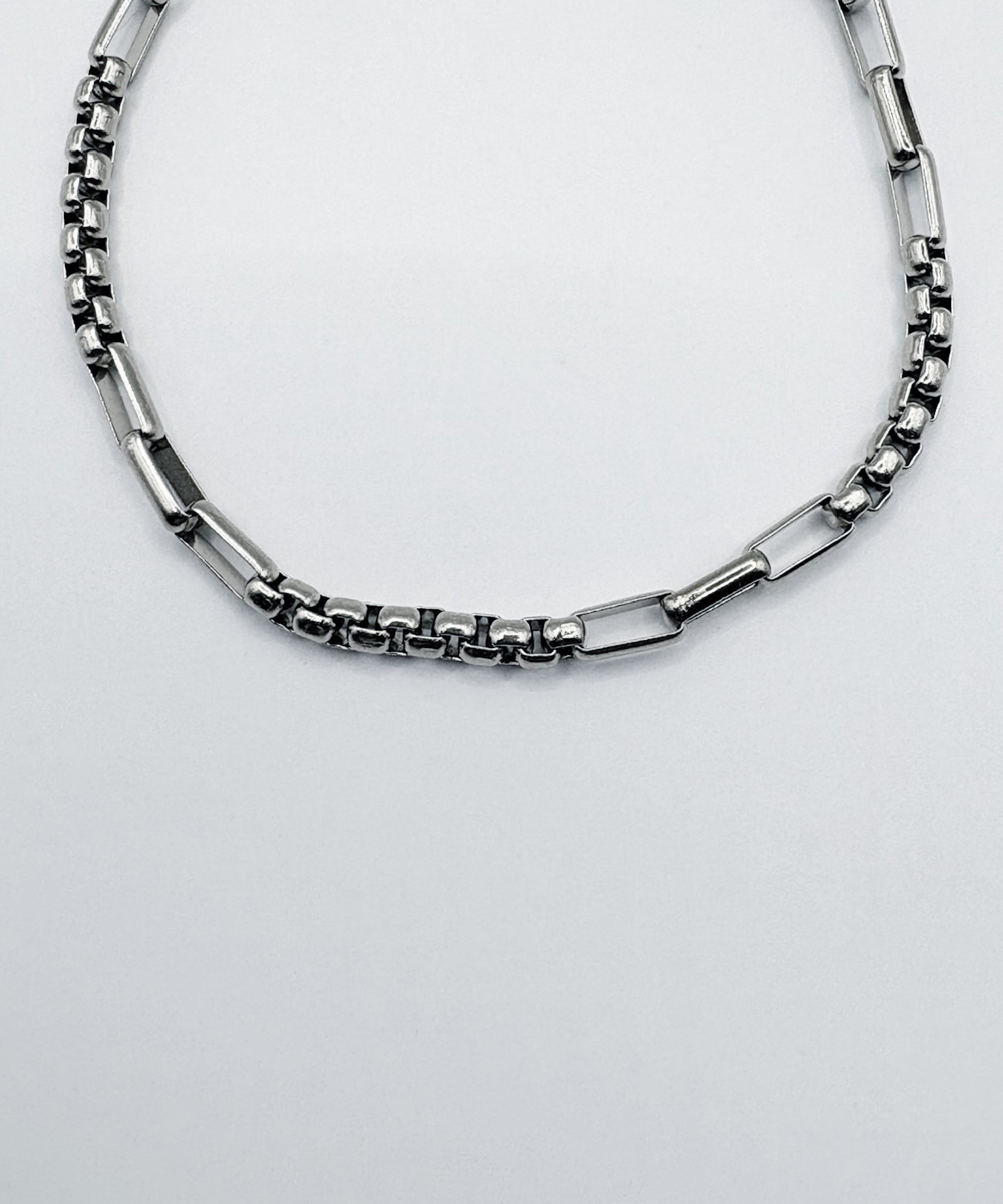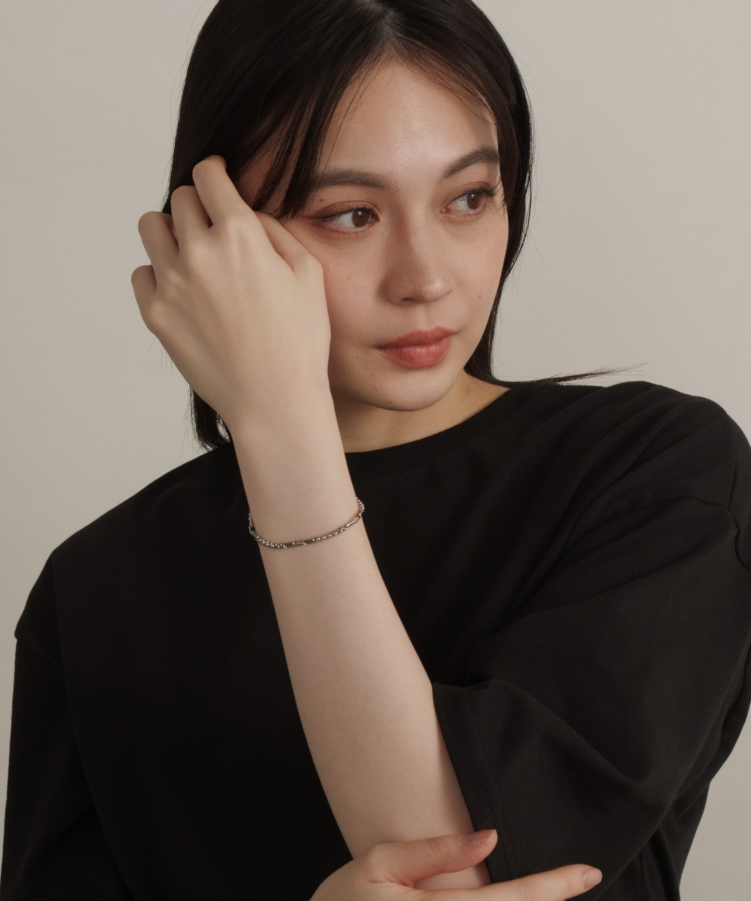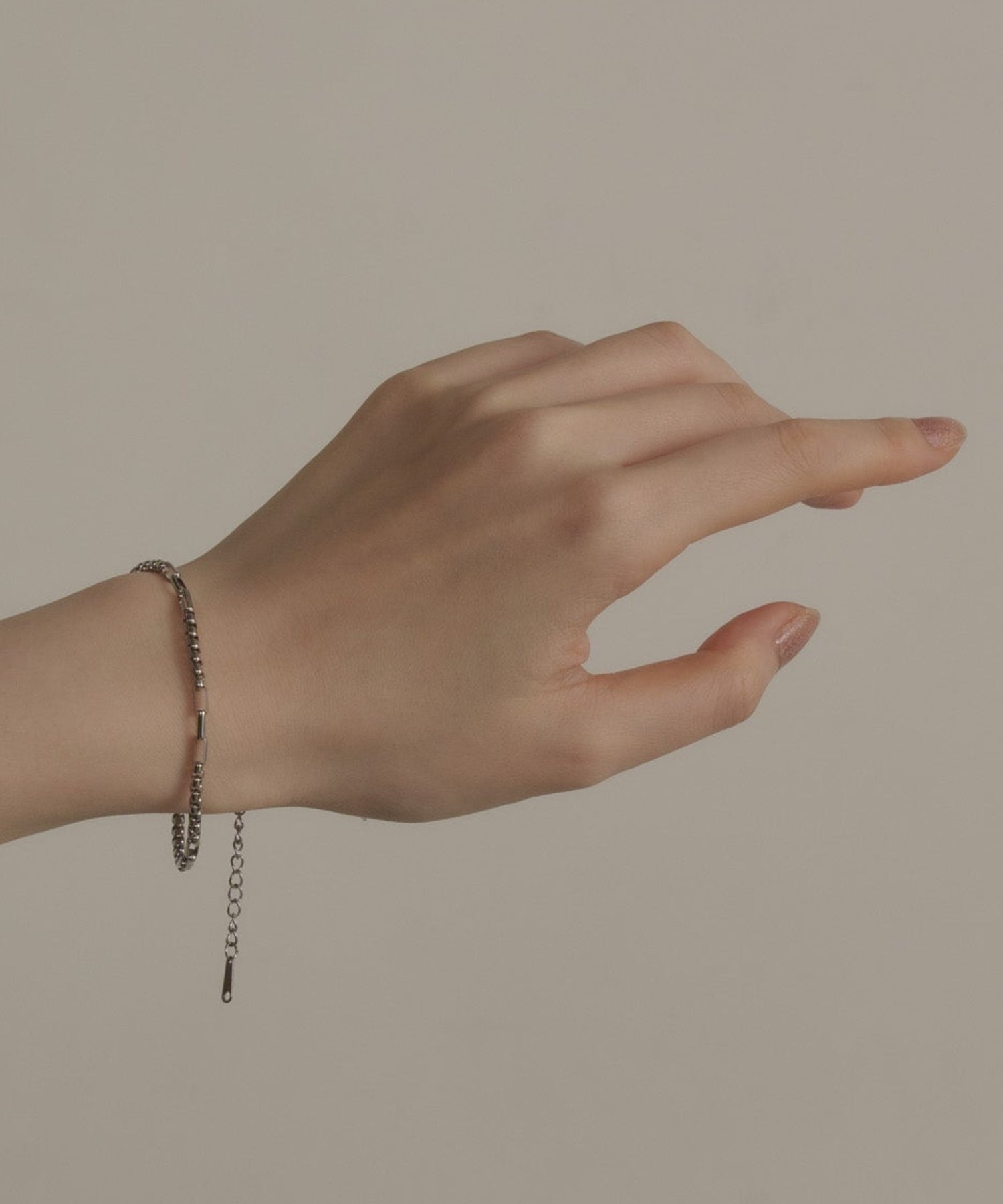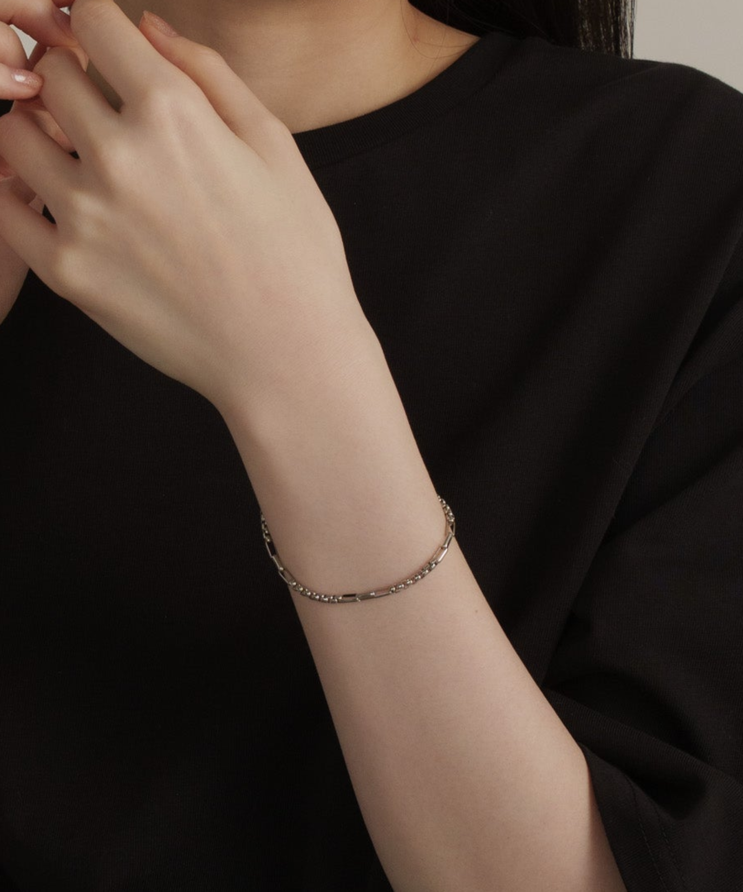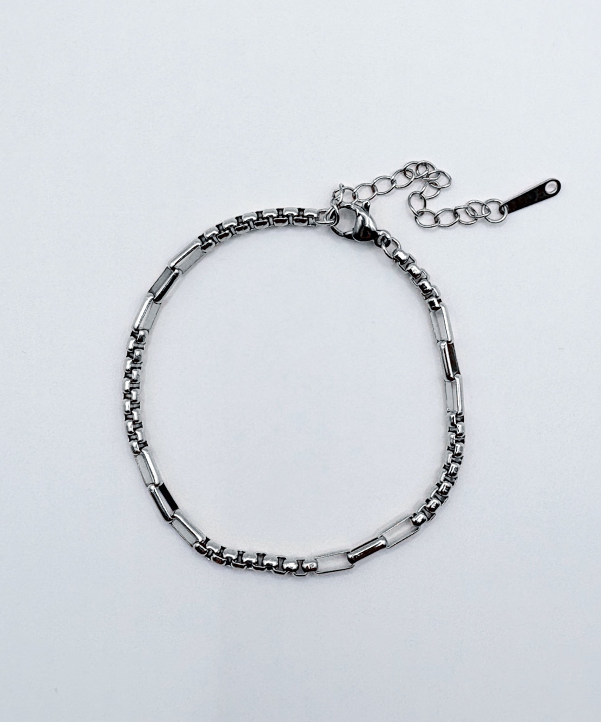 スクエアで立体感のあるチェーンの間に、長方形のチェーンをアクセントにあしらったシンプルな一連ブレスレット。ミニマルな中に個性が光り、さりげない奥行きをプラスしてくれます。同デザインのネックレスとセットで着用可能です。