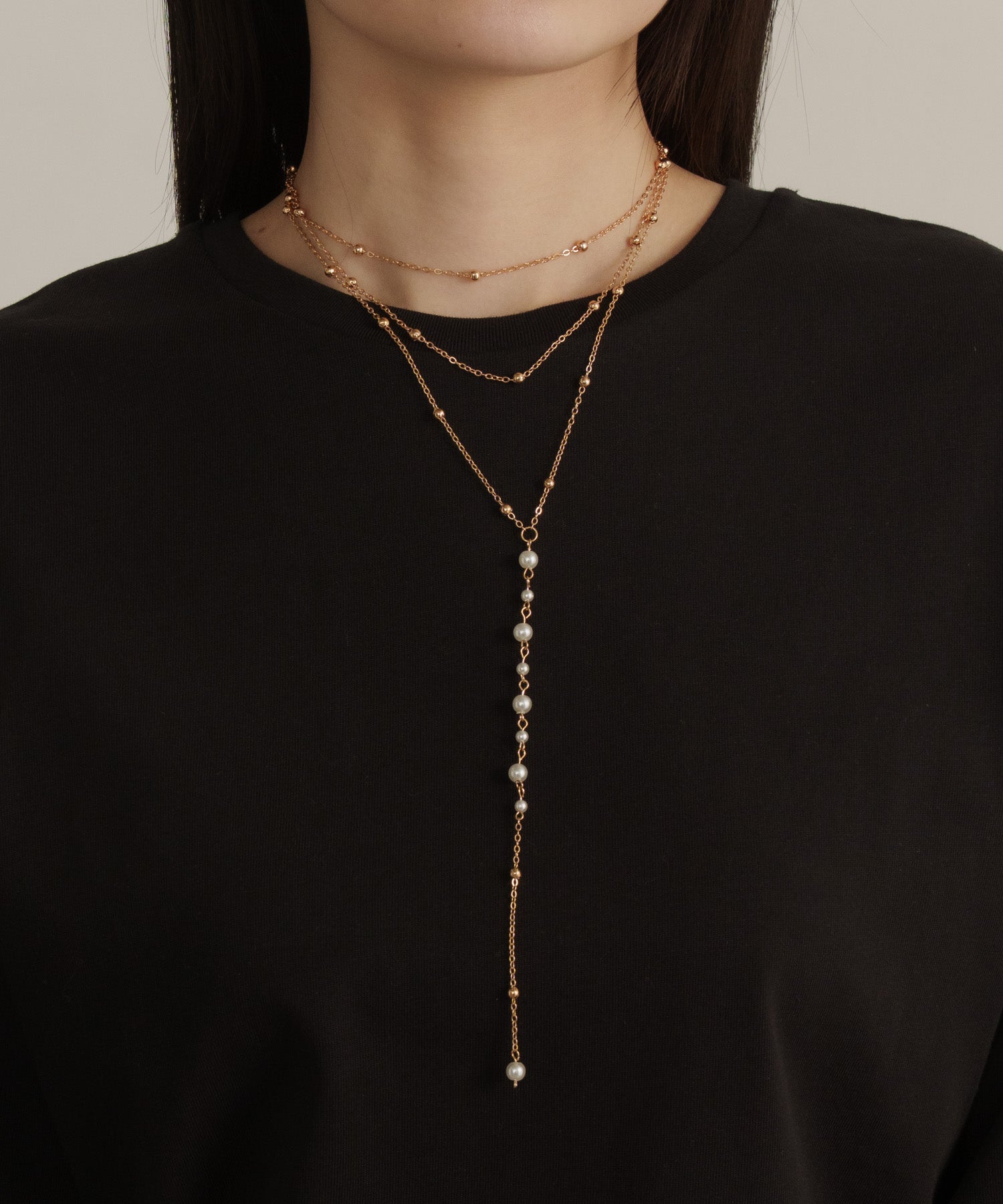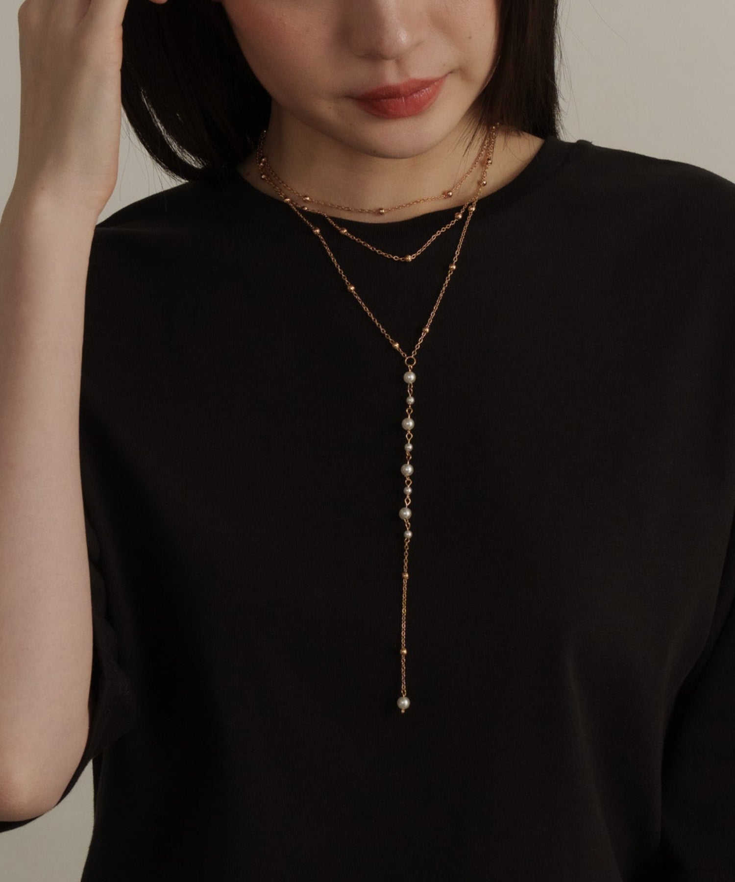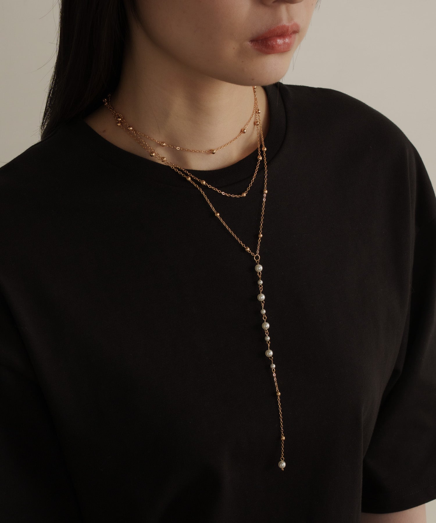 等間隔に並んだボールがデコルテを華やかに演出し、Y字ラインのパールが上品なアクセントを添えるデザインです。