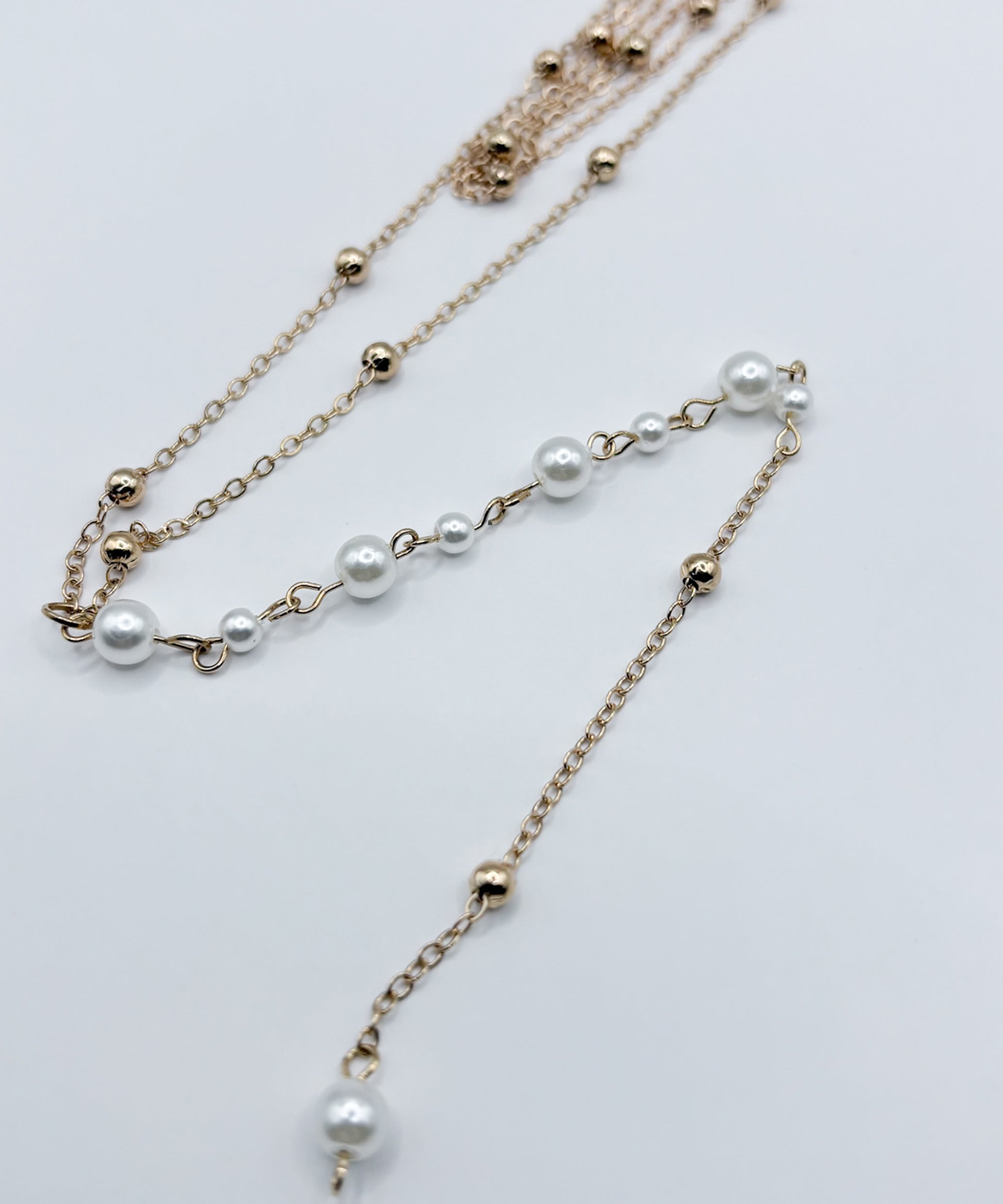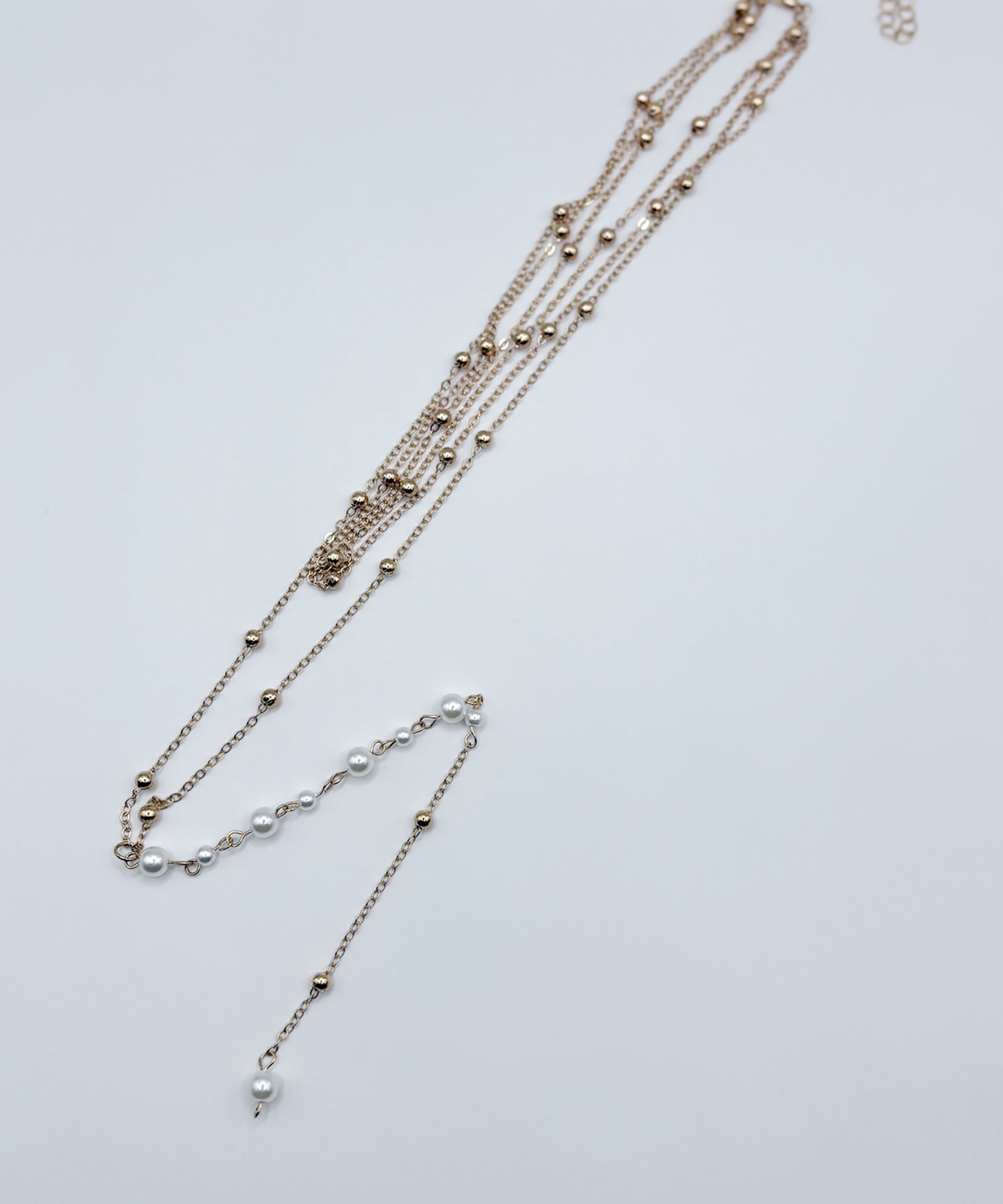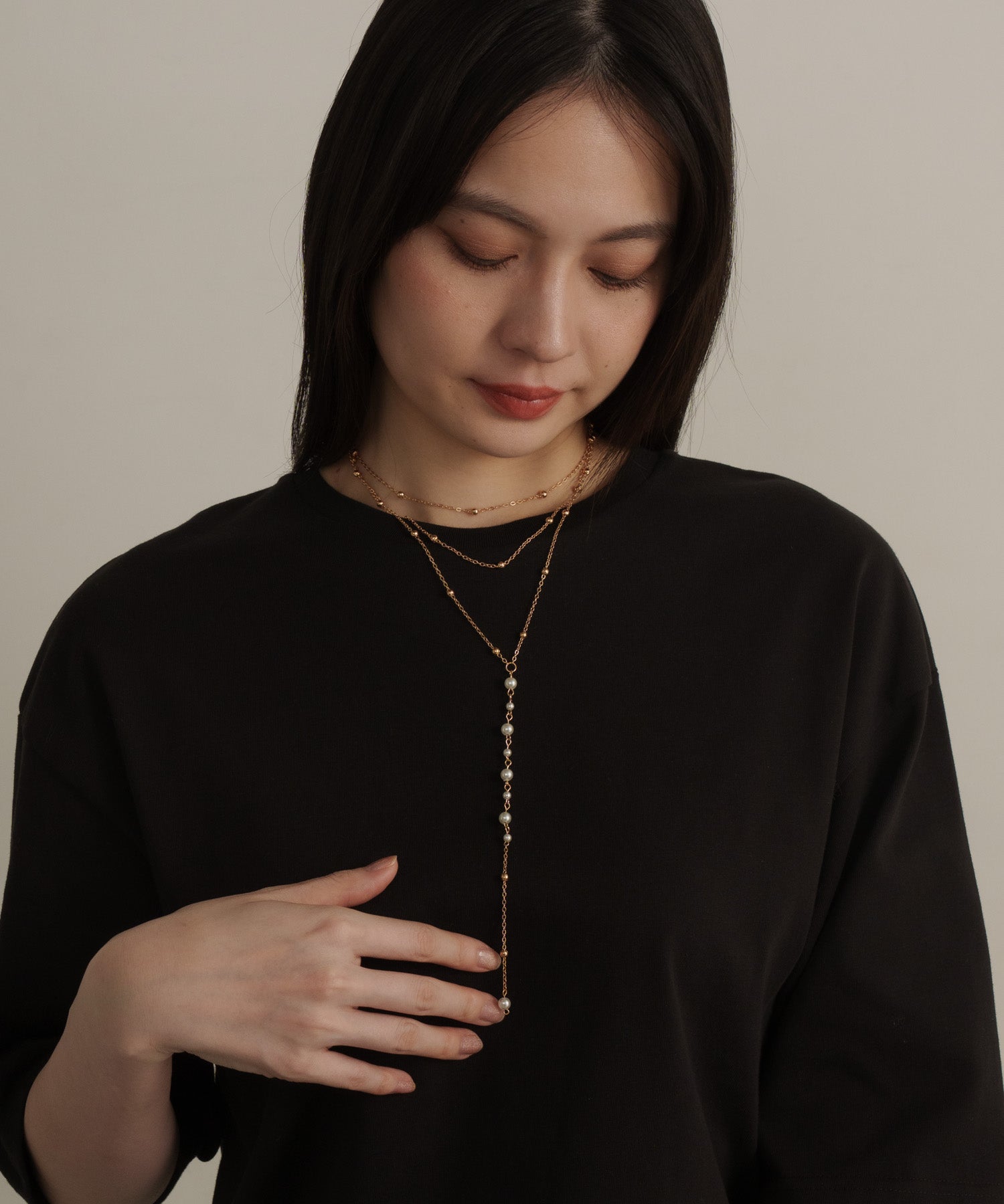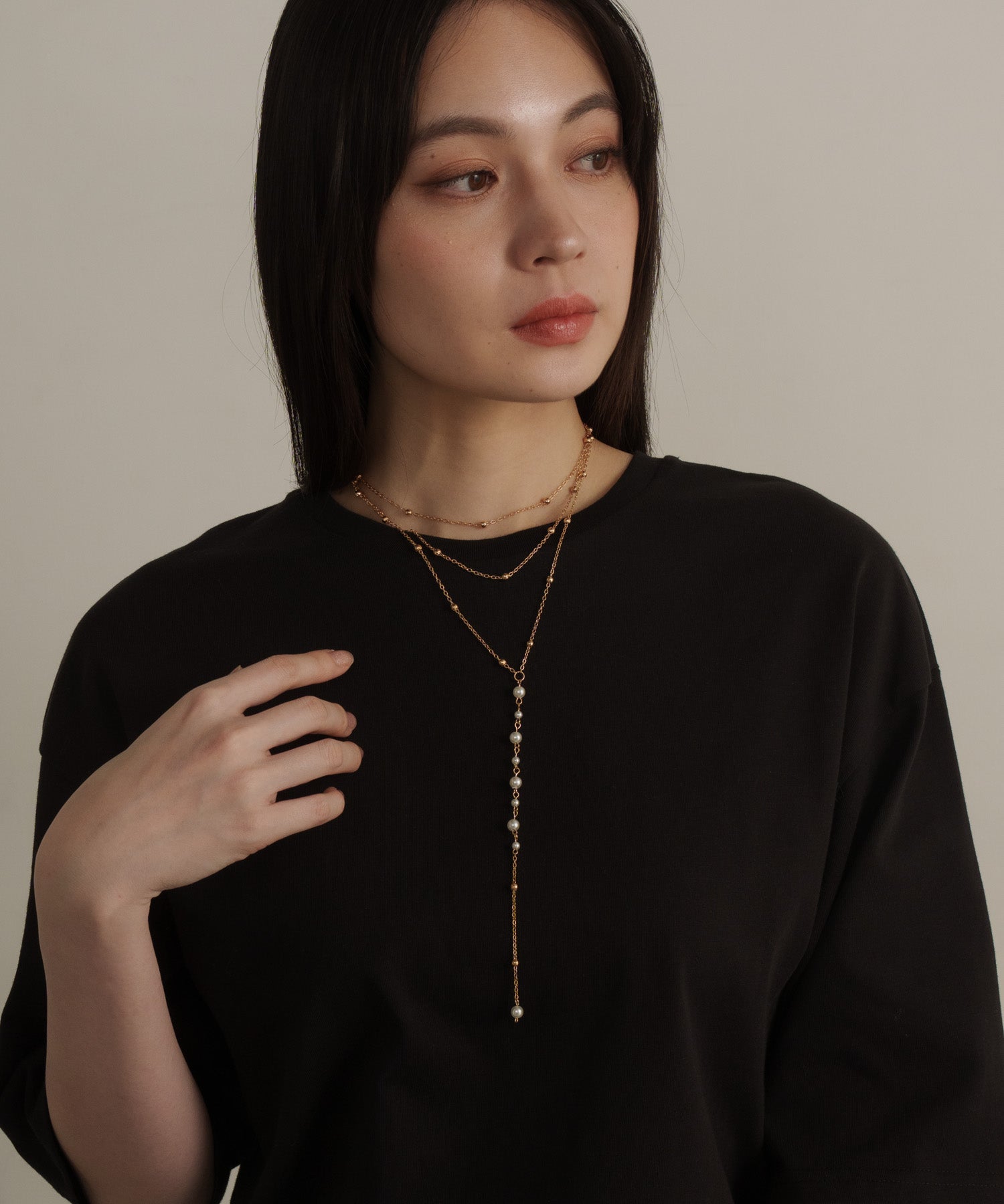 等間隔に並んだボールがデコルテを華やかに演出し、Y字ラインのパールが上品なアクセントを添えるデザインです。