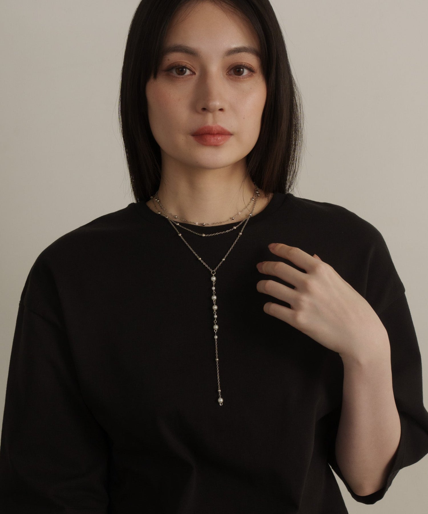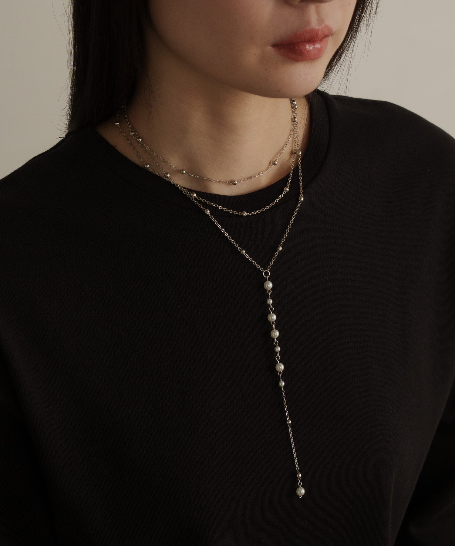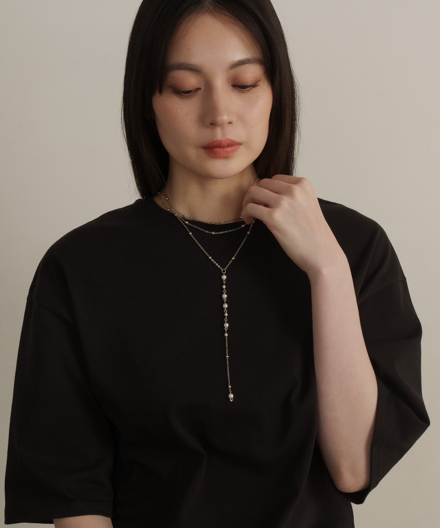 等間隔に並んだボールがデコルテを華やかに演出し、Y字ラインのパールが上品なアクセントを添えるデザインです。