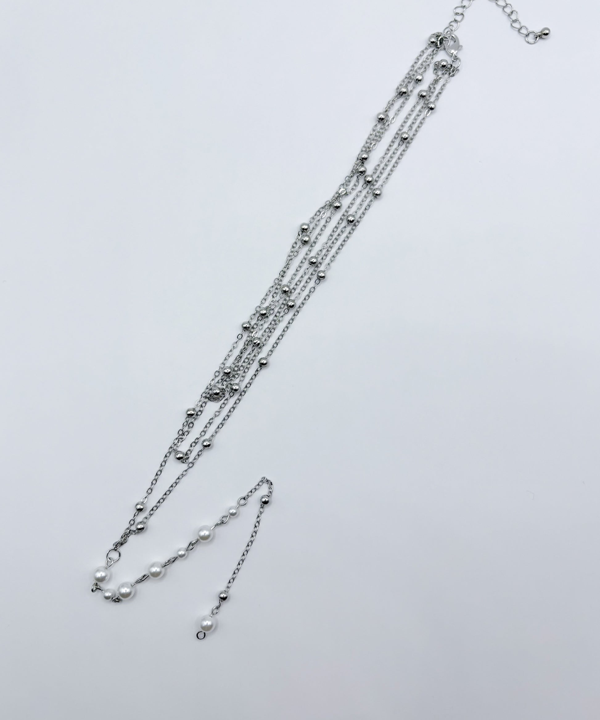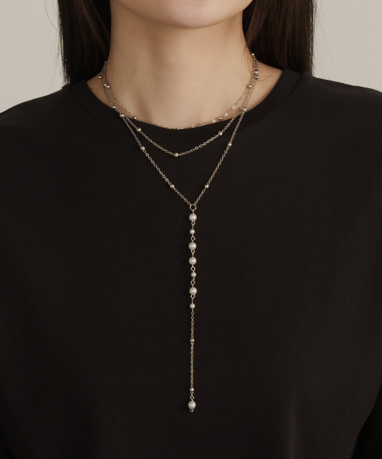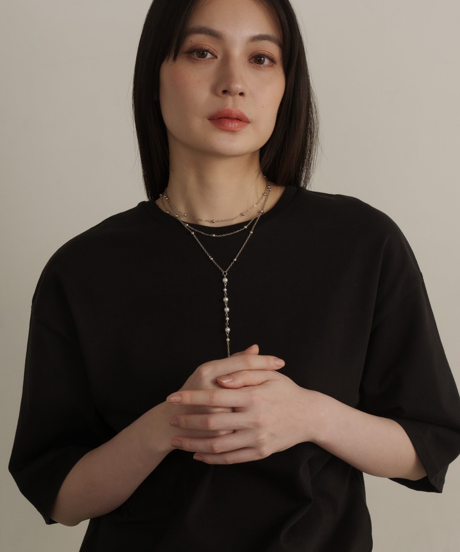 等間隔に並んだボールがデコルテを華やかに演出し、Y字ラインのパールが上品なアクセントを添えるデザインです。