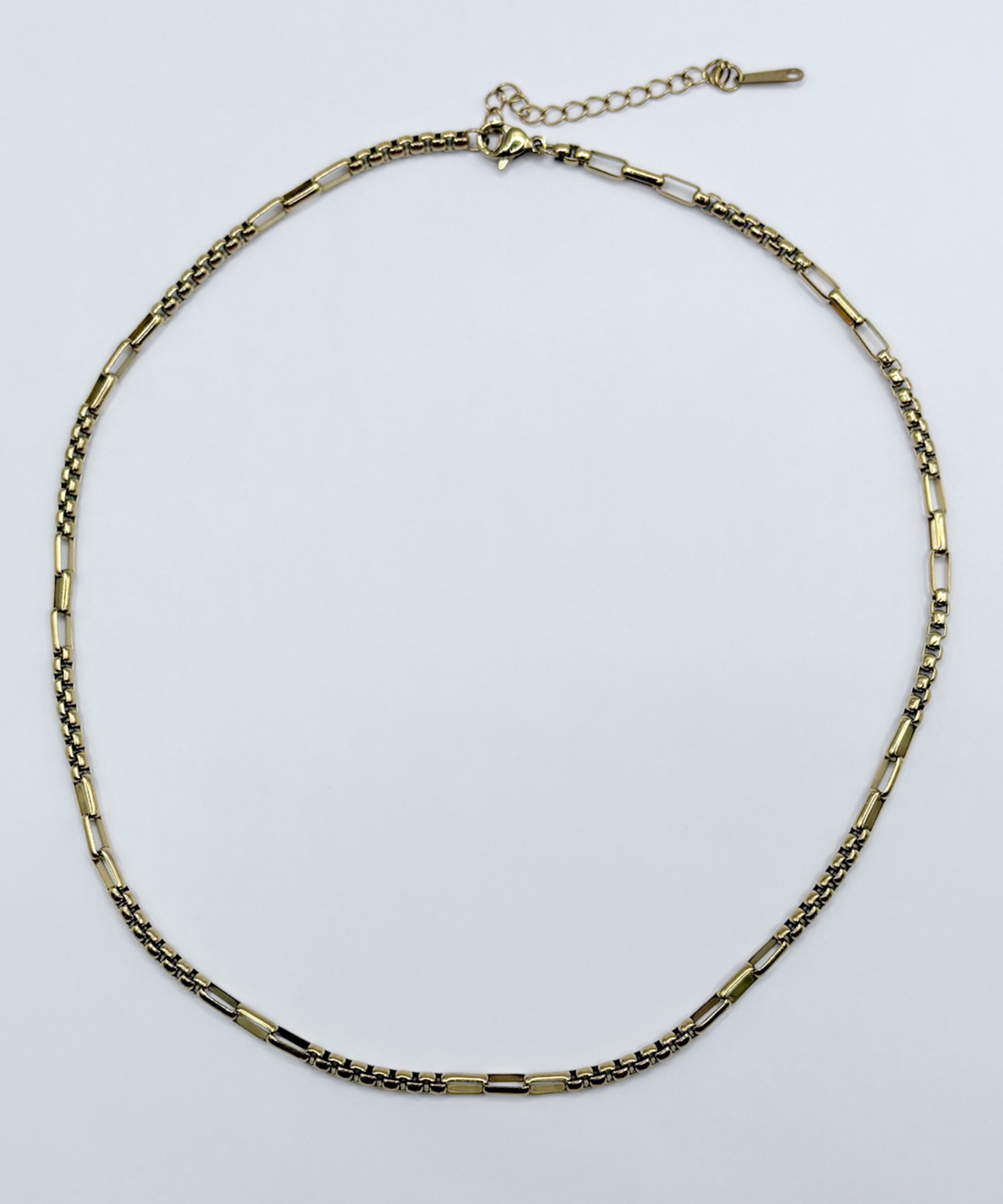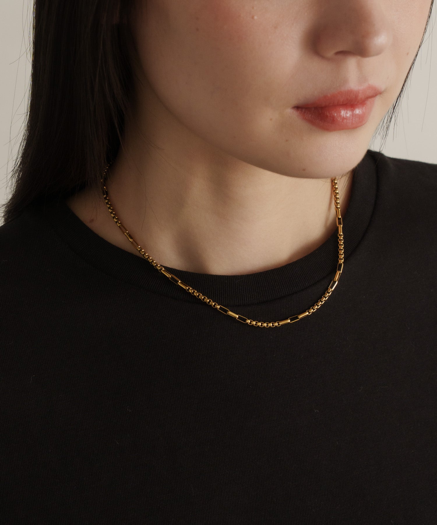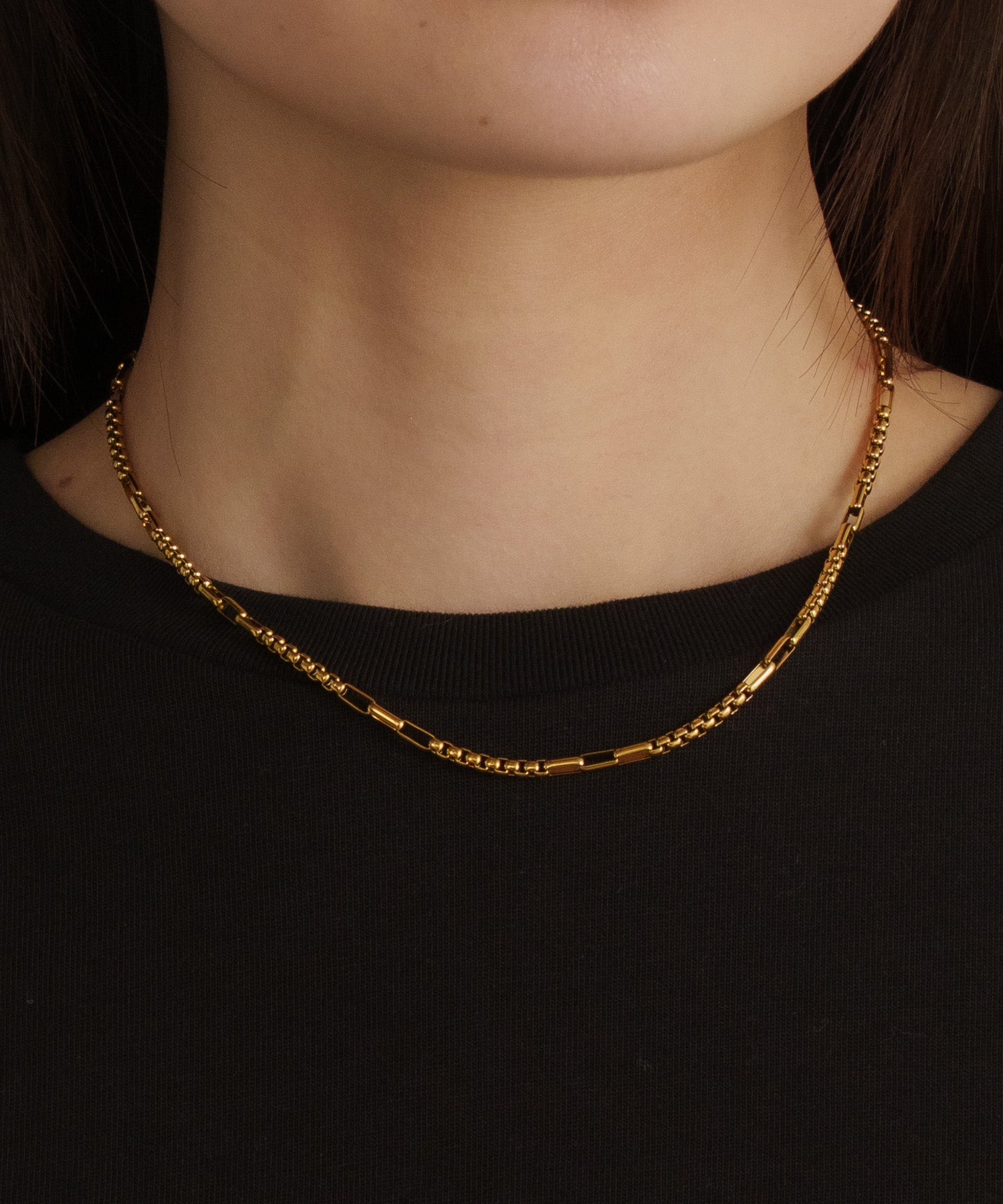 スクエアで立体感のあるチェーンの間に、長方形のチェーンをアクセントにあしらったシンプルな一連ネックレス。ミニマルな中に個性が光り、さりげない奥行きをプラスしてくれます。同デザインのブレスレットとセットで着用可能です。