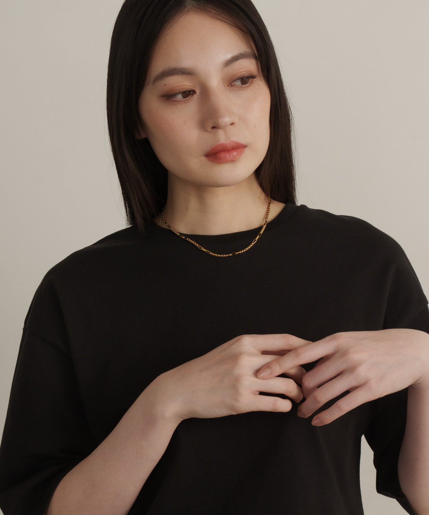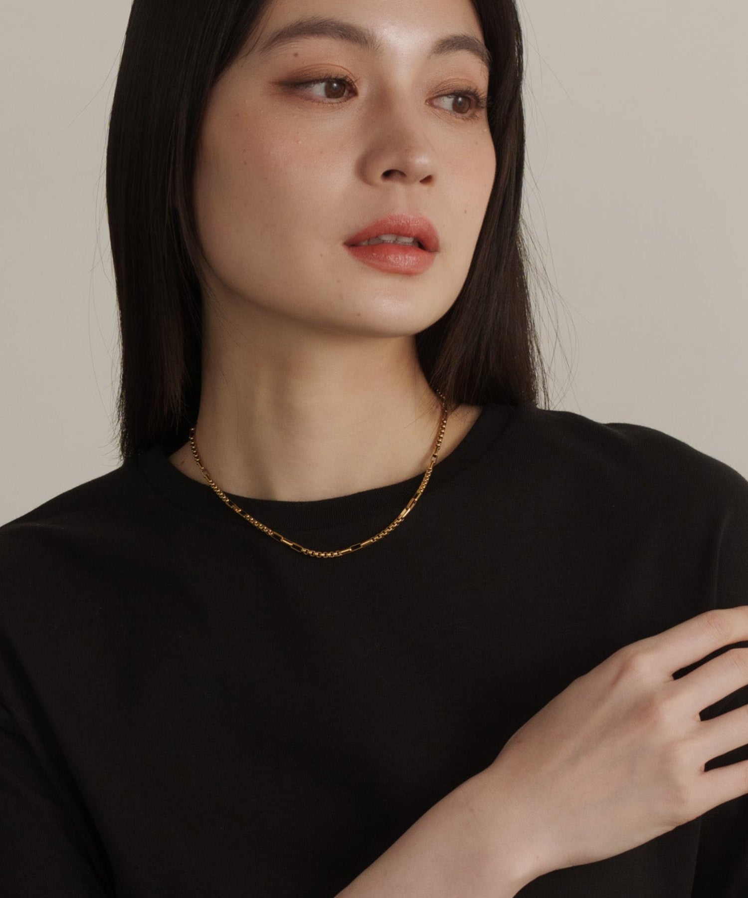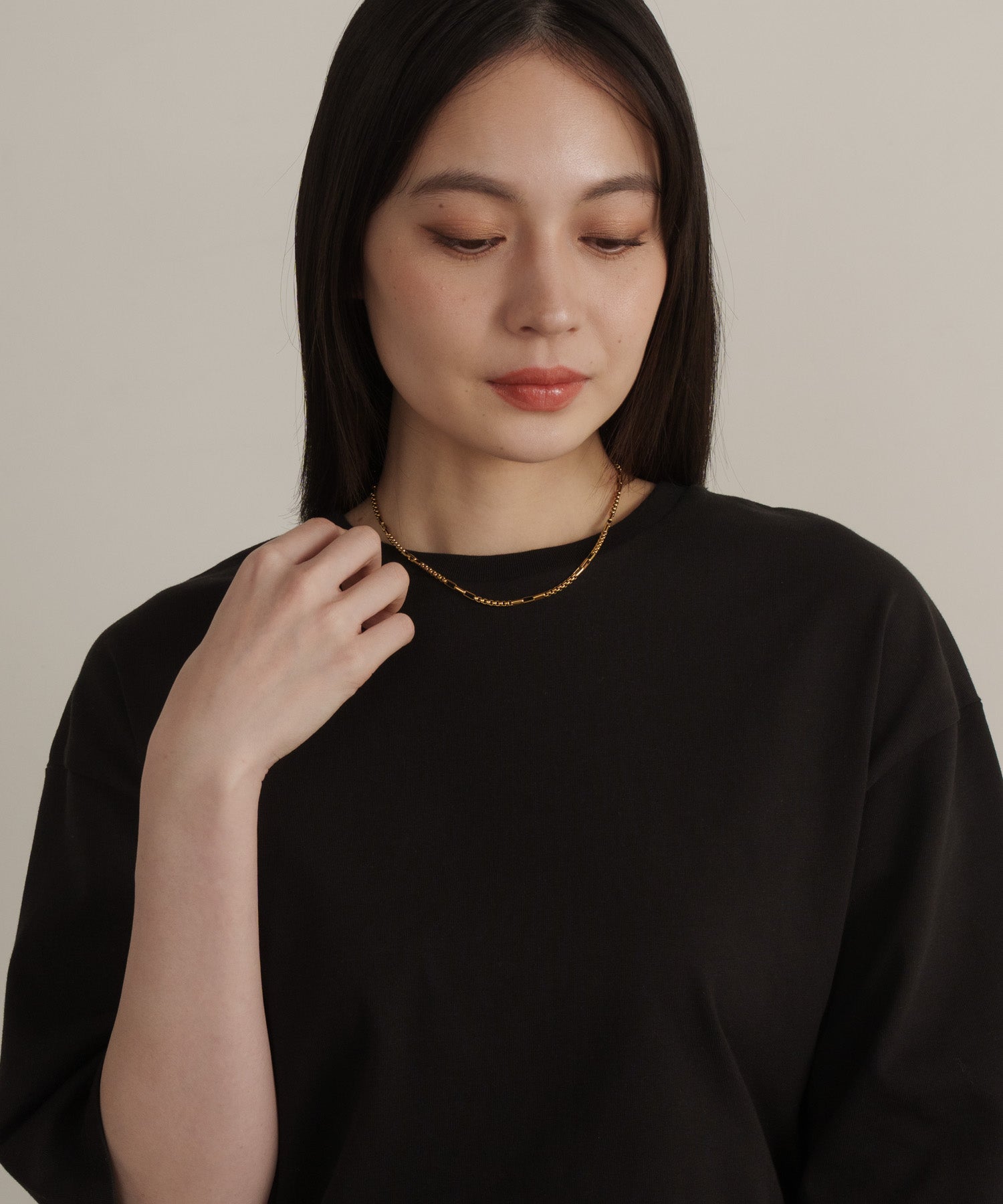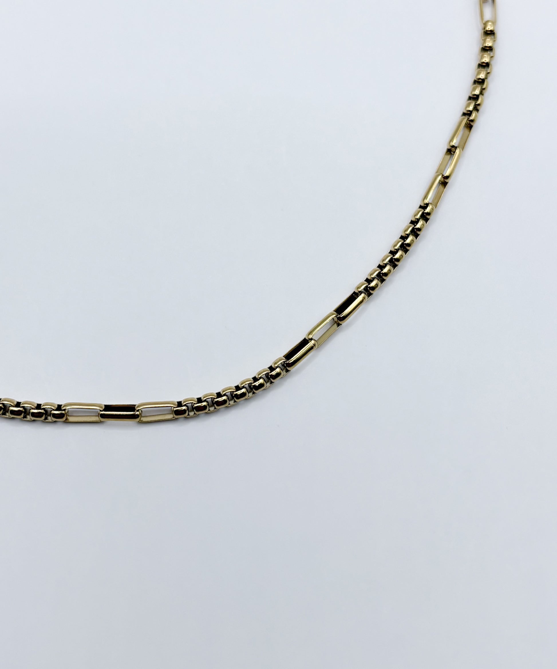 スクエアで立体感のあるチェーンの間に、長方形のチェーンをアクセントにあしらったシンプルな一連ネックレス。ミニマルな中に個性が光り、さりげない奥行きをプラスしてくれます。同デザインのブレスレットとセットで着用可能です。