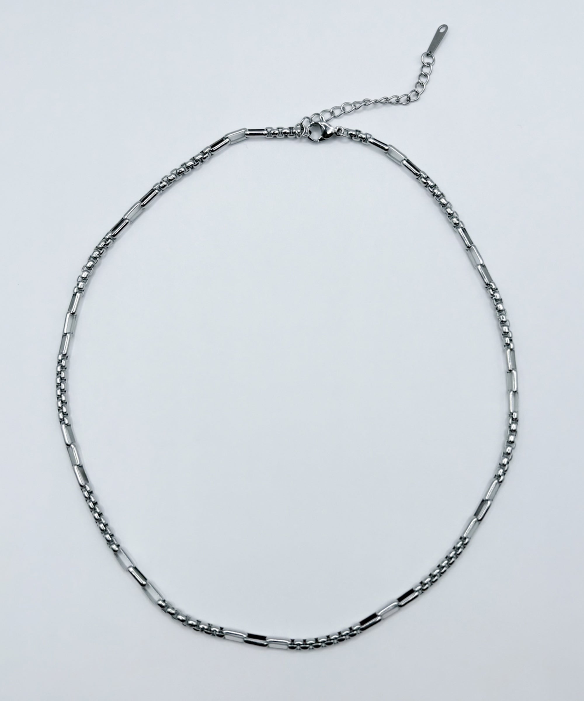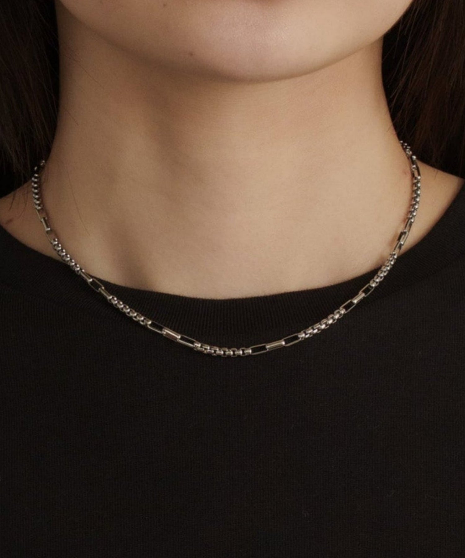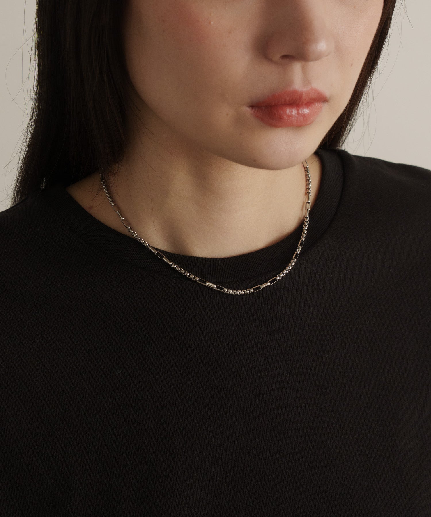 スクエアで立体感のあるチェーンの間に、長方形のチェーンをアクセントにあしらったシンプルな一連ネックレス。ミニマルな中に個性が光り、さりげない奥行きをプラスしてくれます。同デザインのブレスレットとセットで着用可能です。