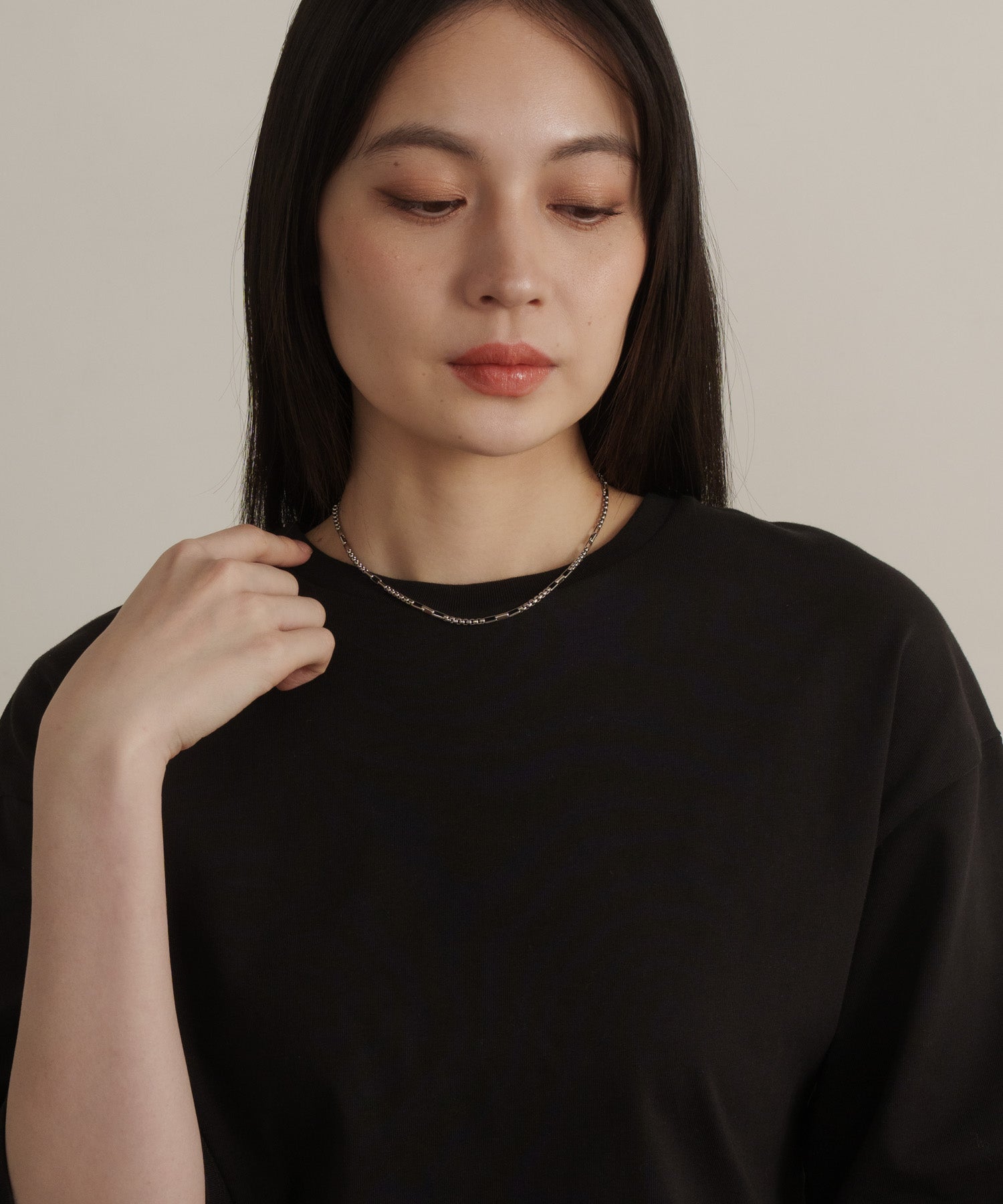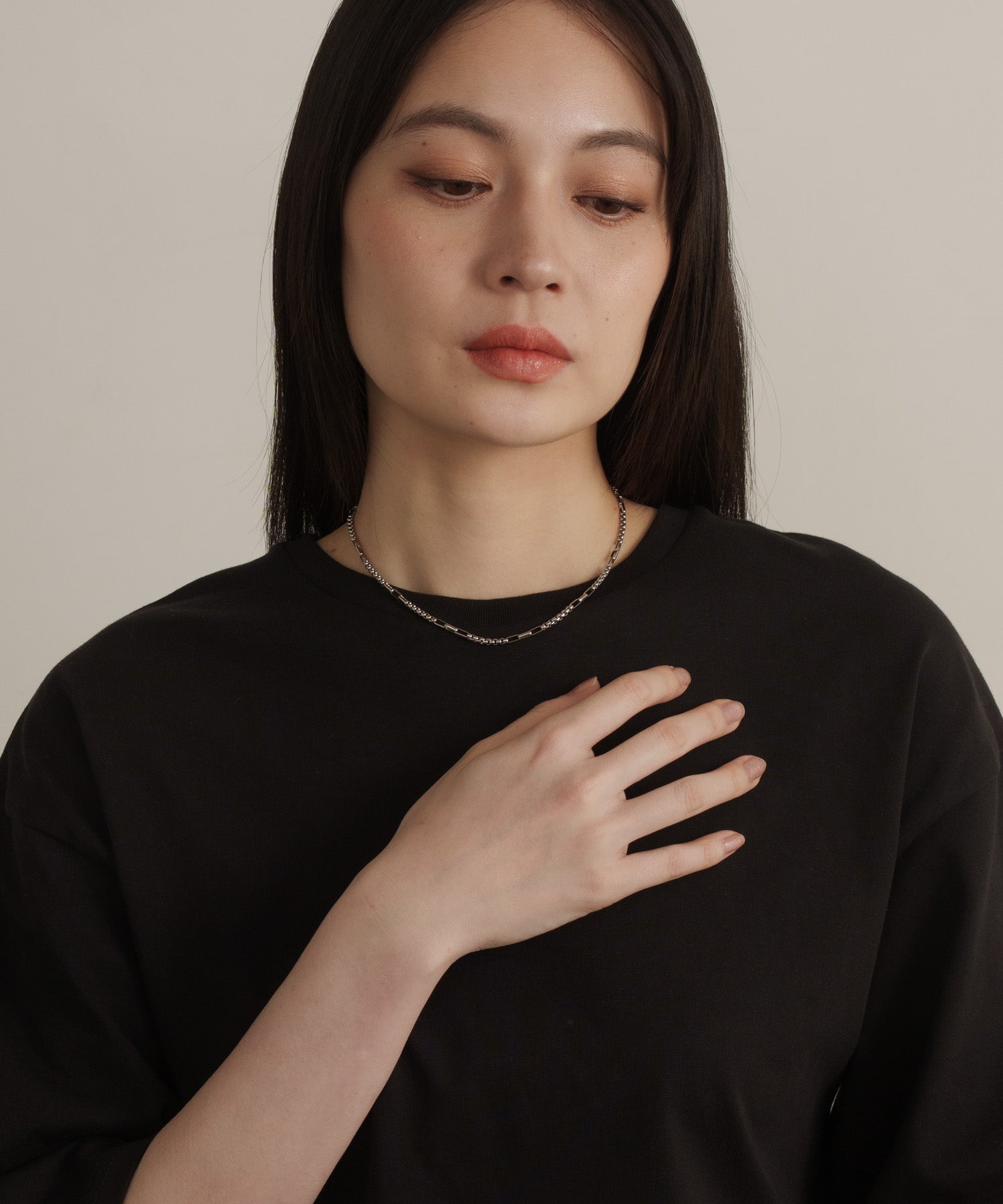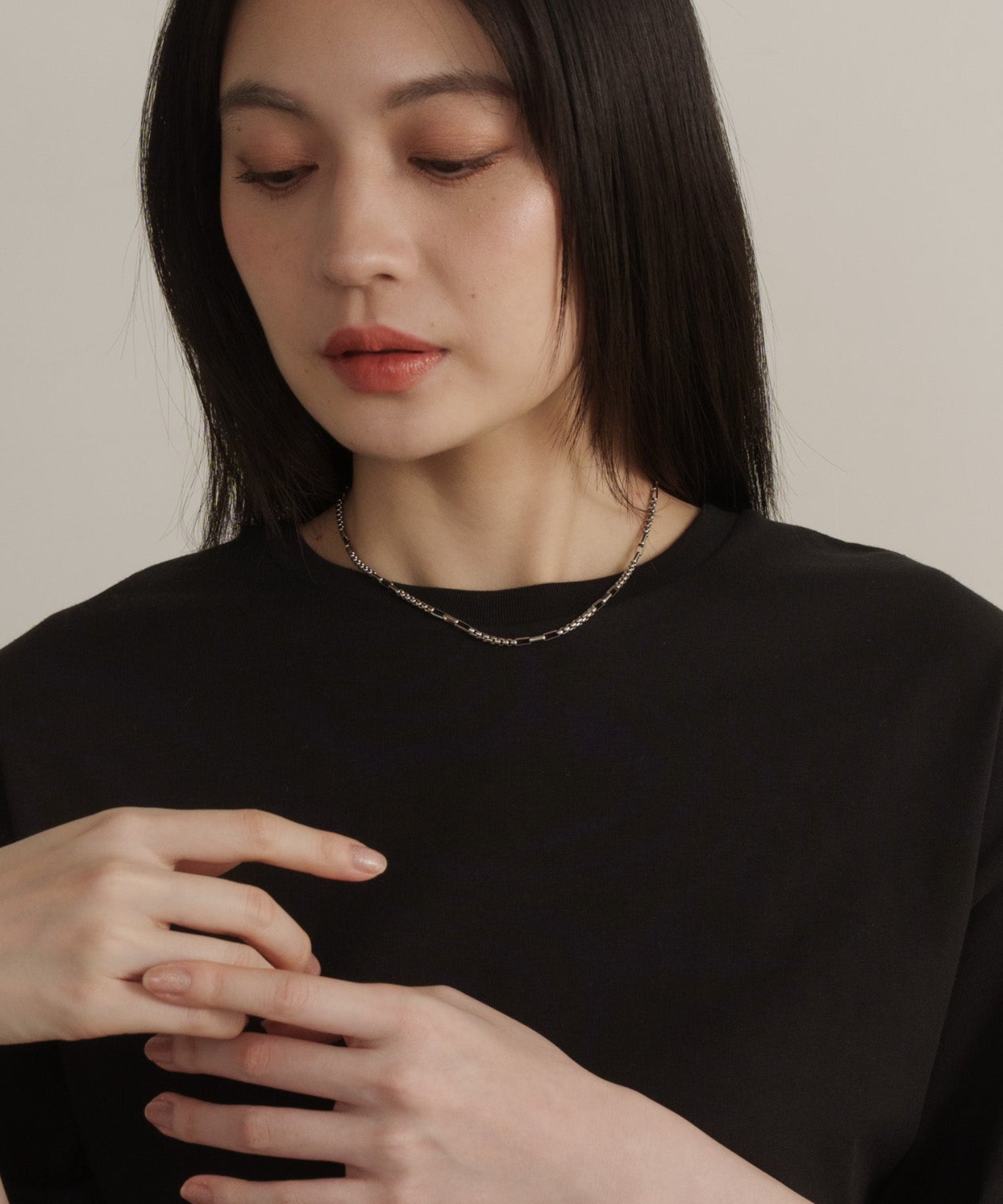 スクエアで立体感のあるチェーンの間に、長方形のチェーンをアクセントにあしらったシンプルな一連ネックレス。ミニマルな中に個性が光り、さりげない奥行きをプラスしてくれます。同デザインのブレスレットとセットで着用可能です。