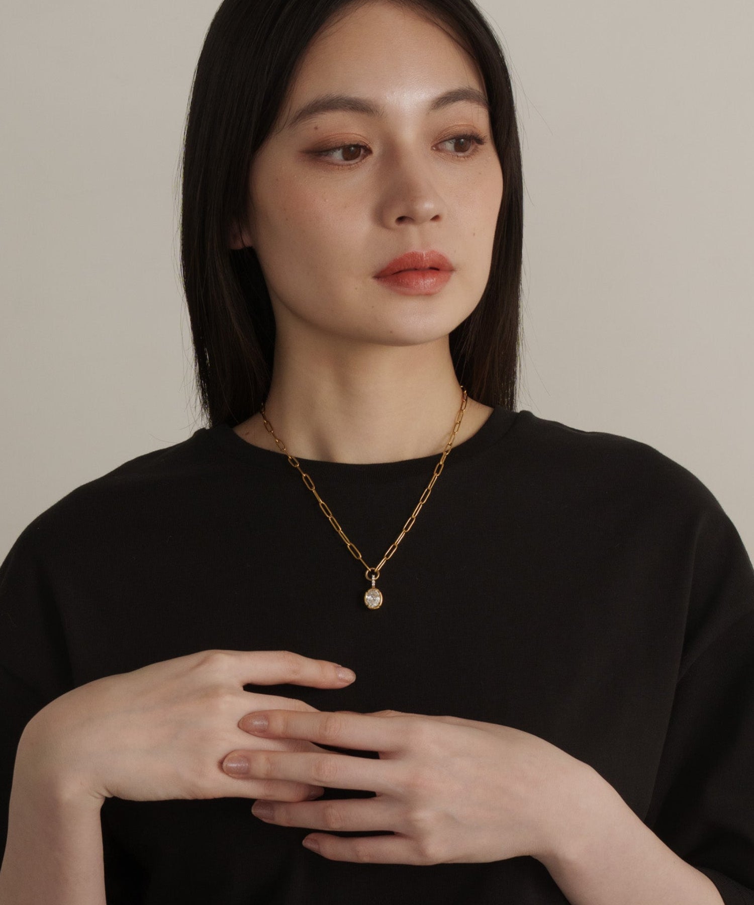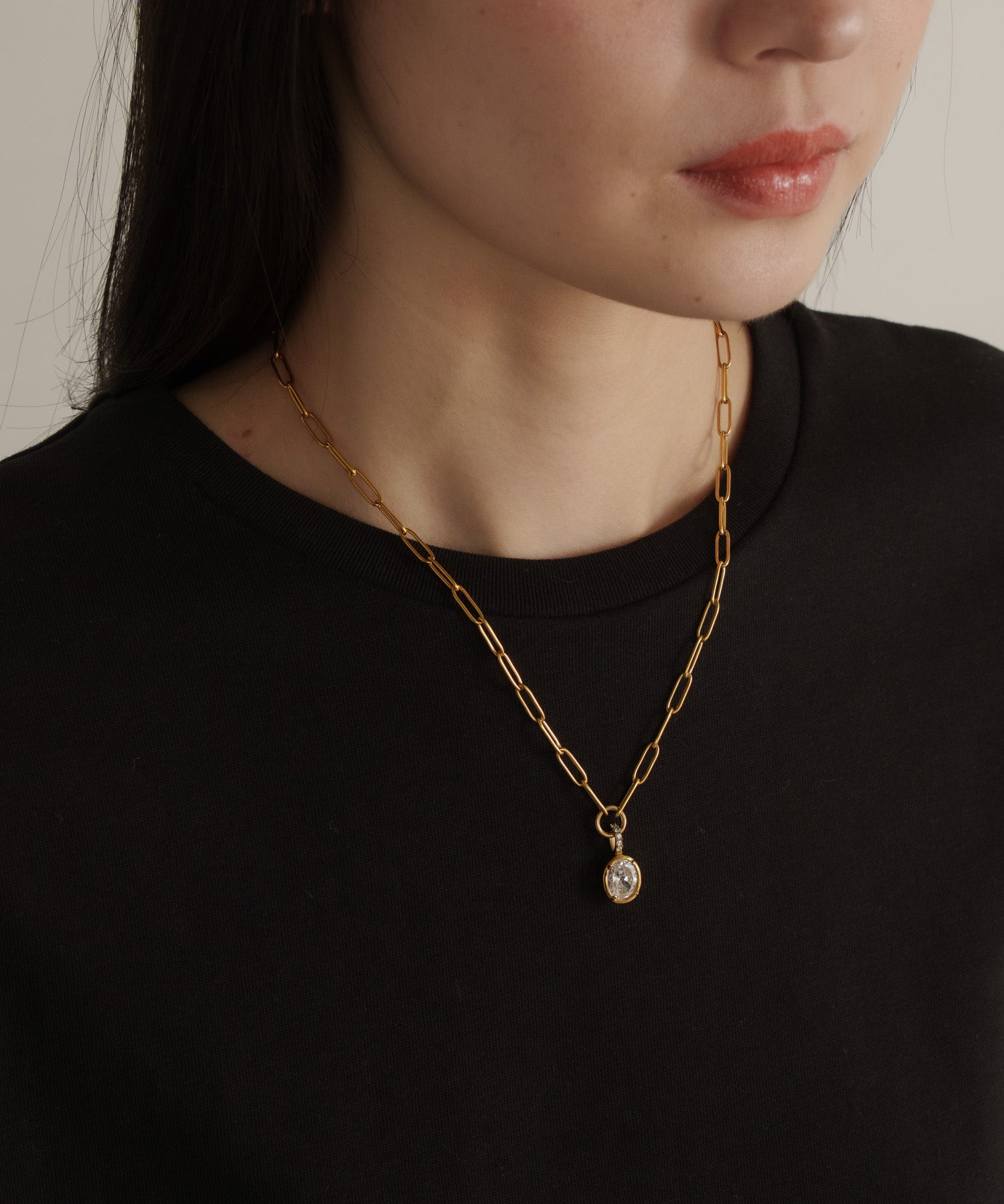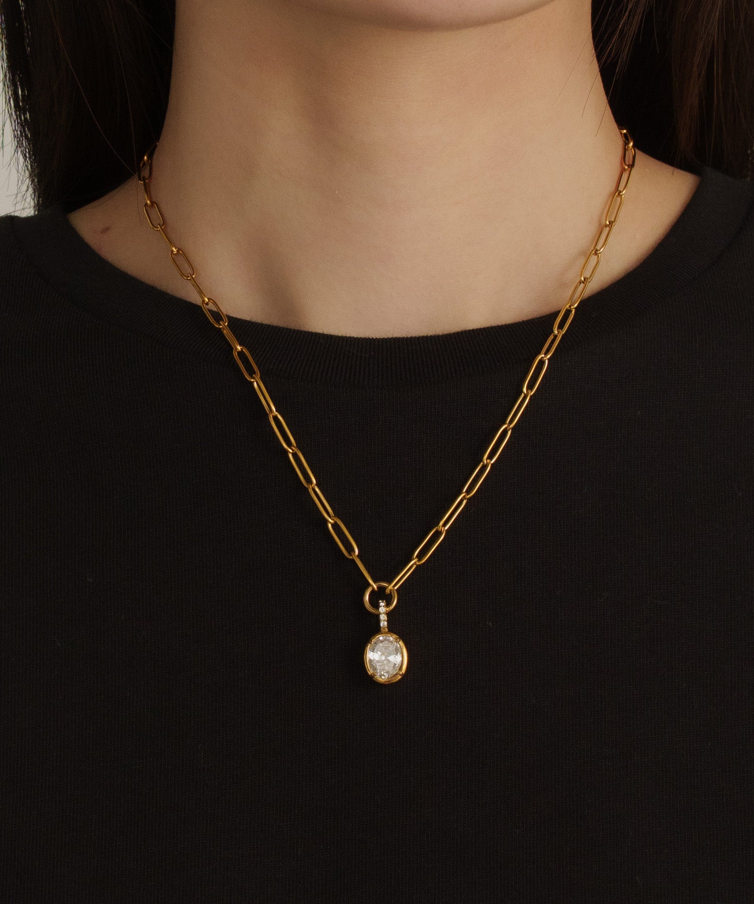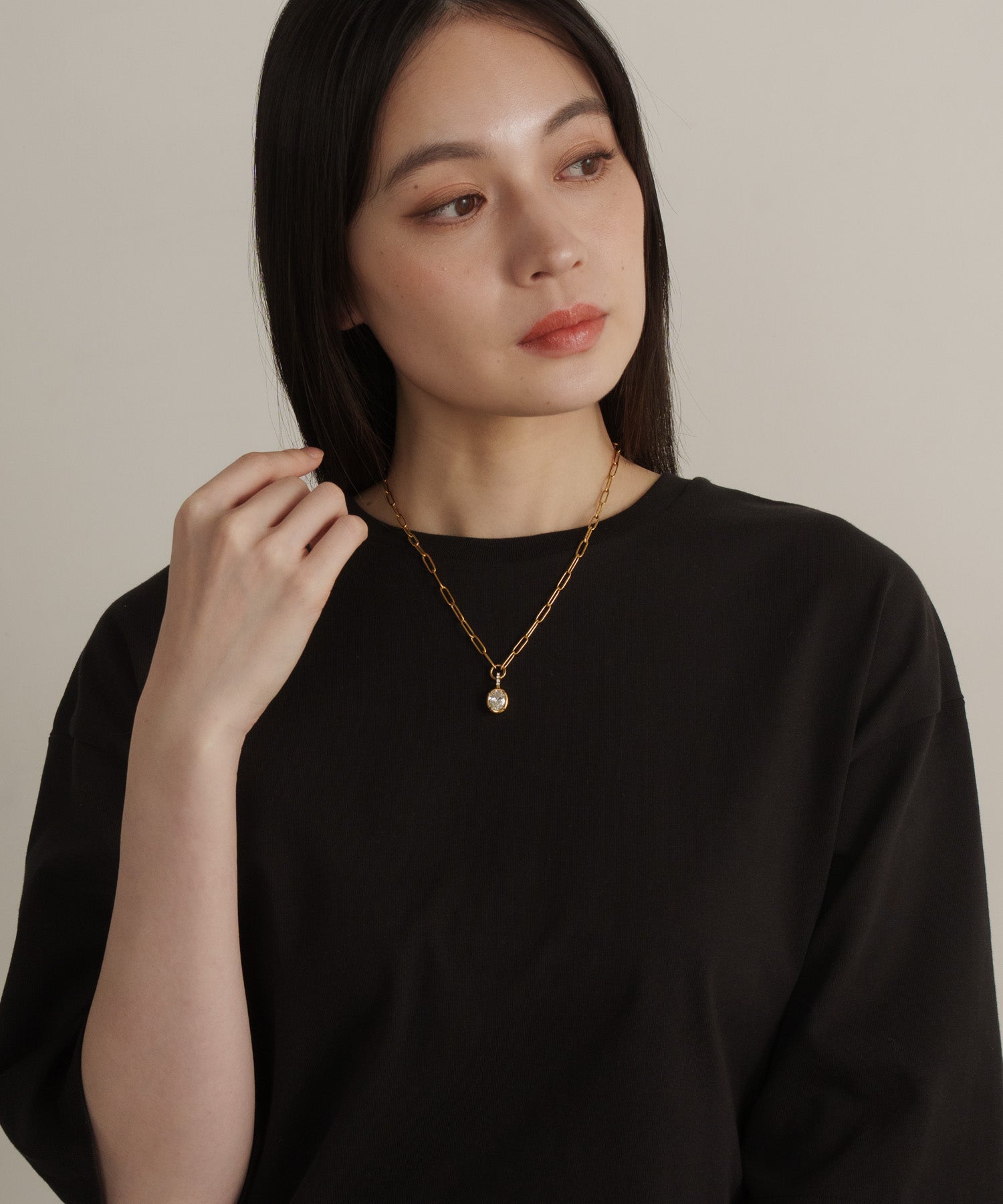 ヴィンテージ調のオーバルチェーンと、重厚感のある大ぶりなラウンドストーンが印象的なネックレス。綺麗め過ぎず、ストーンネックレスをカジュアルに取り入れたい方におすすめのデザインです。