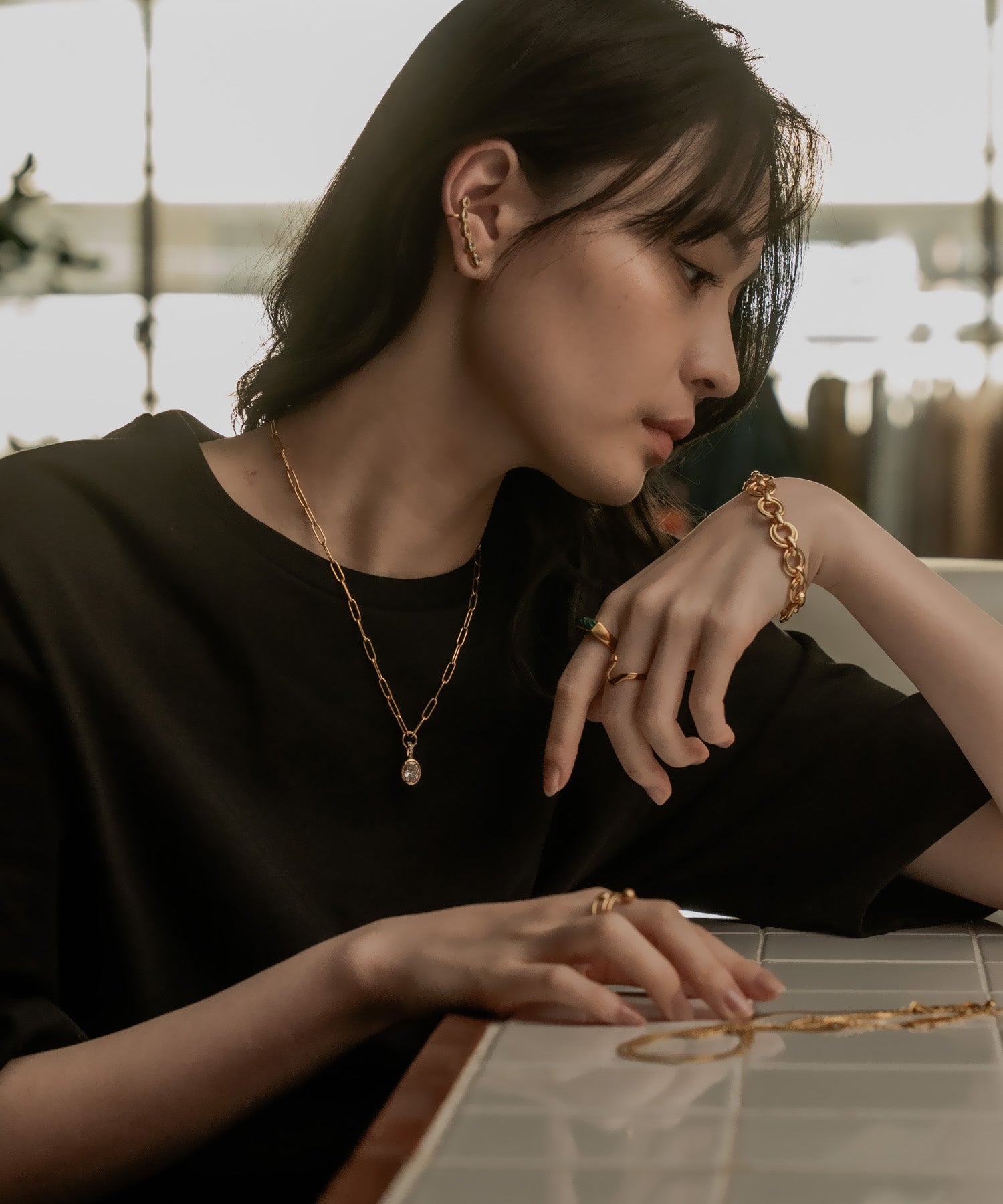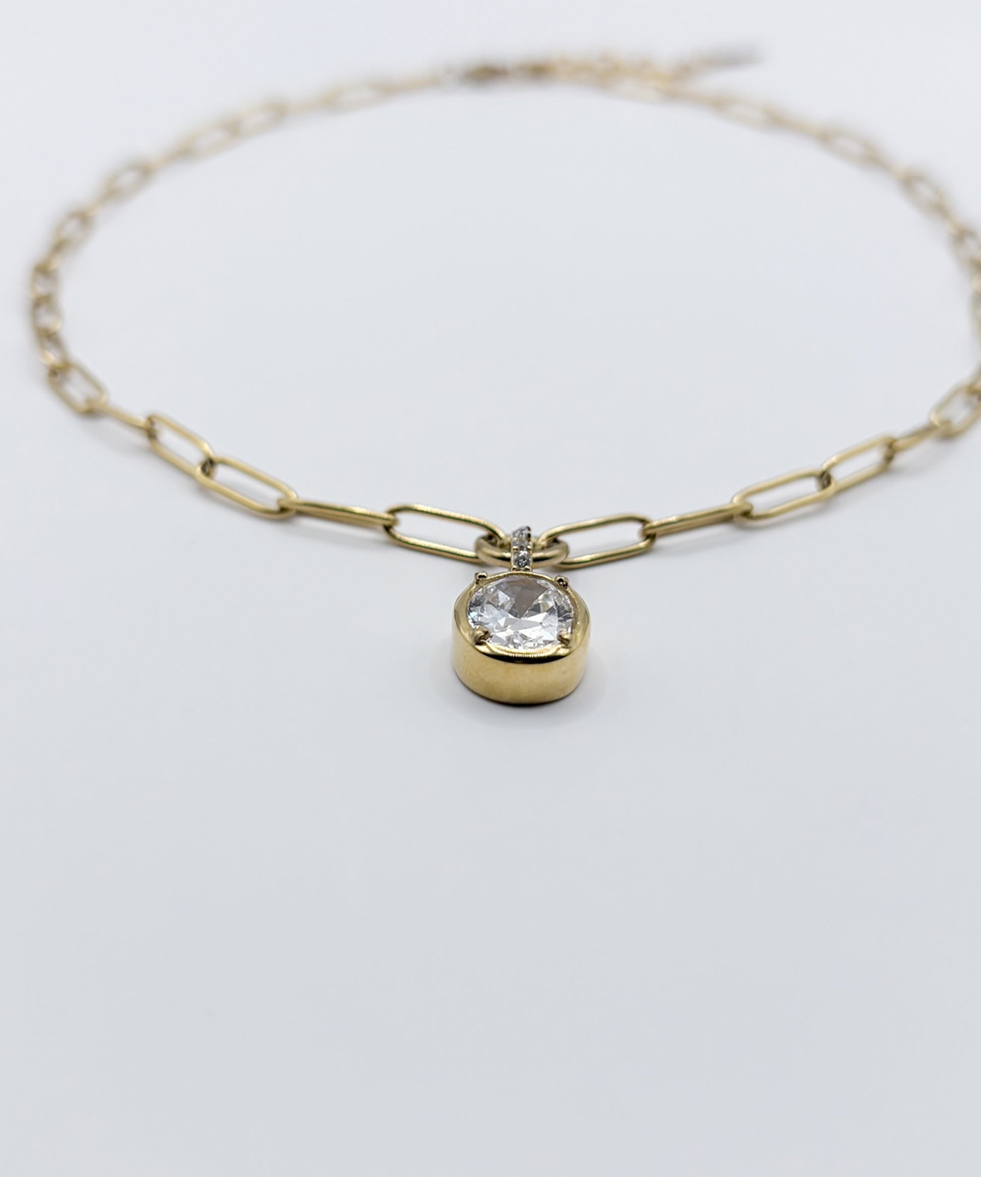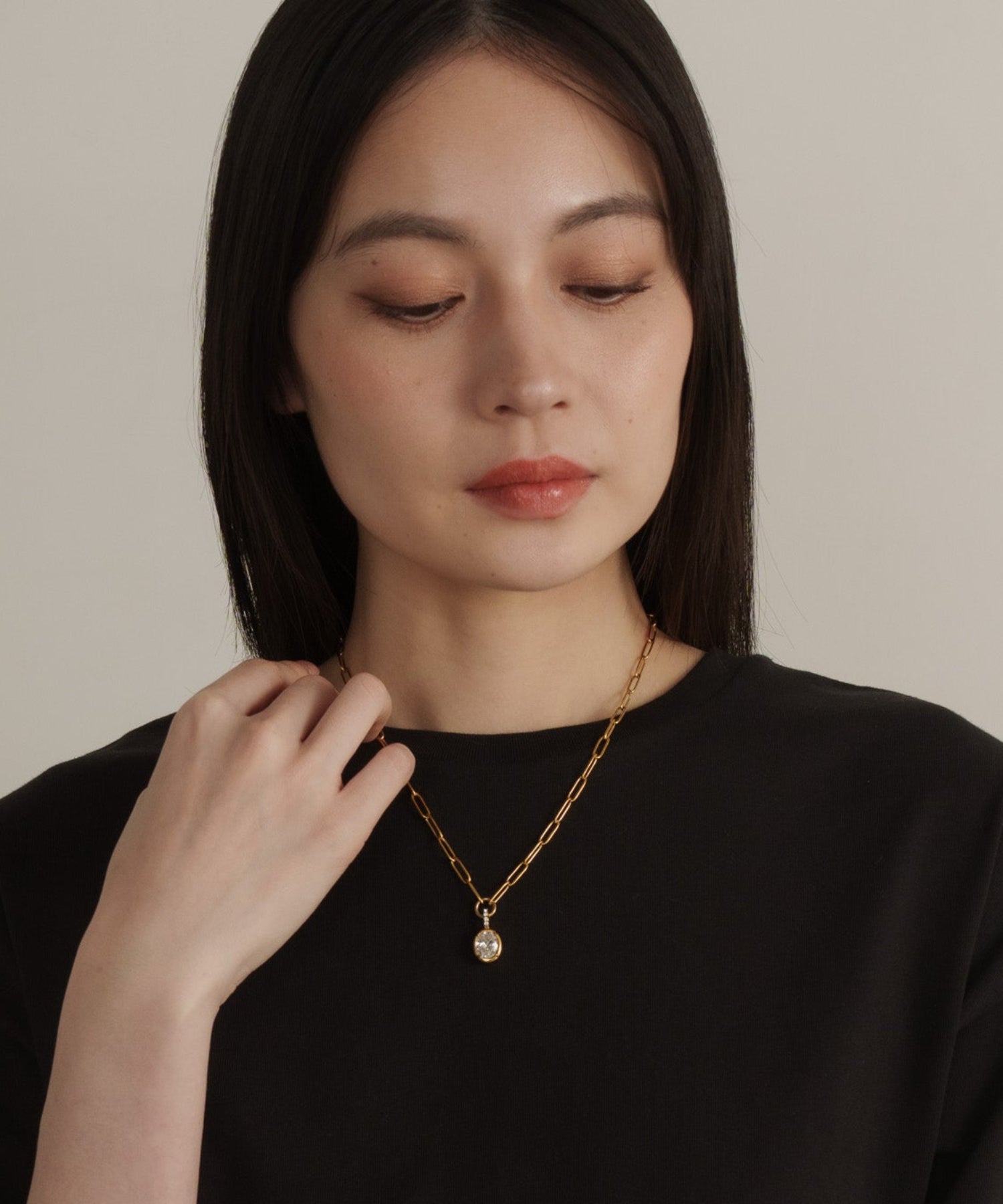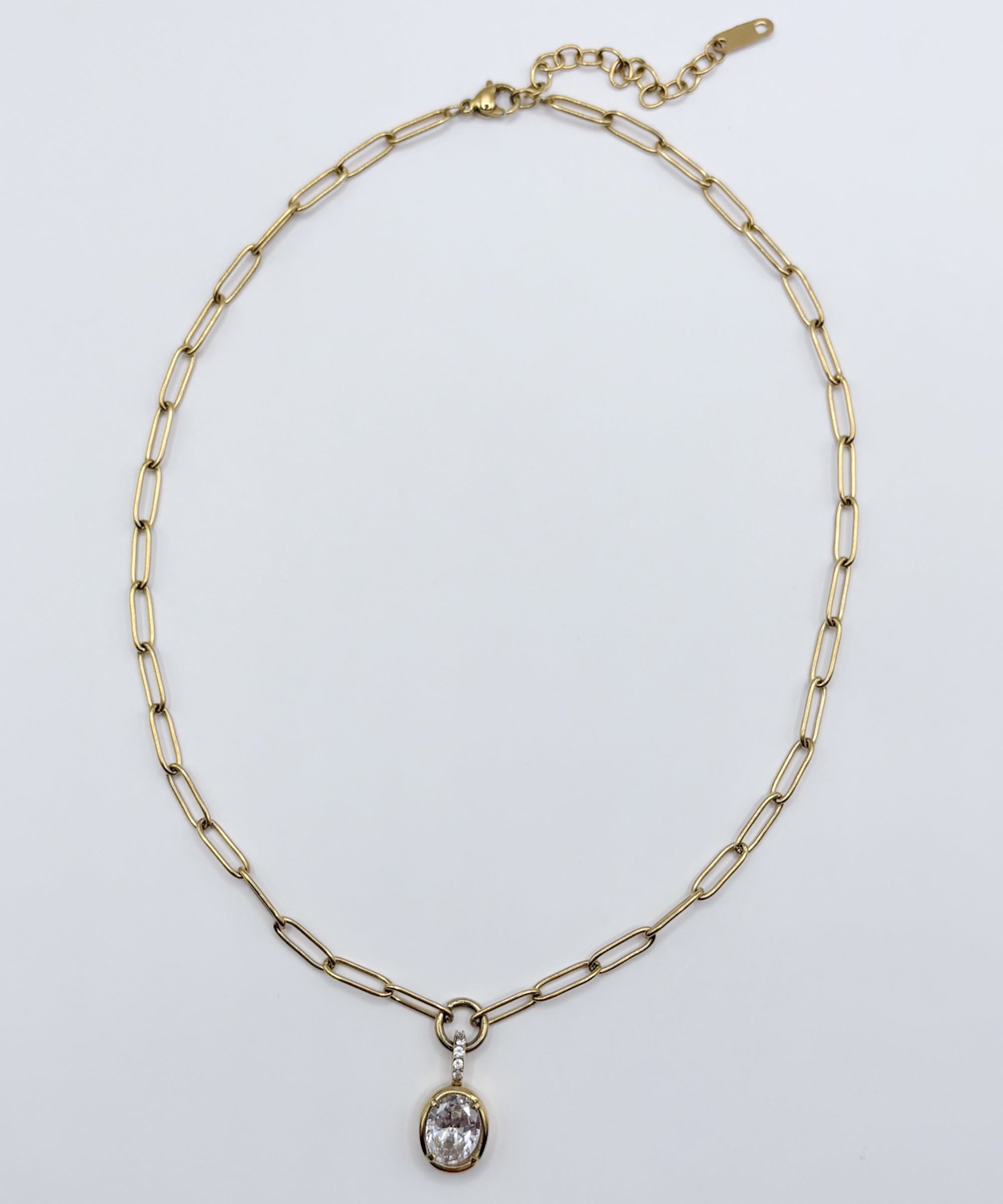 ヴィンテージ調のオーバルチェーンと、重厚感のある大ぶりなラウンドストーンが印象的なネックレス。綺麗め過ぎず、ストーンネックレスをカジュアルに取り入れたい方におすすめのデザインです。
