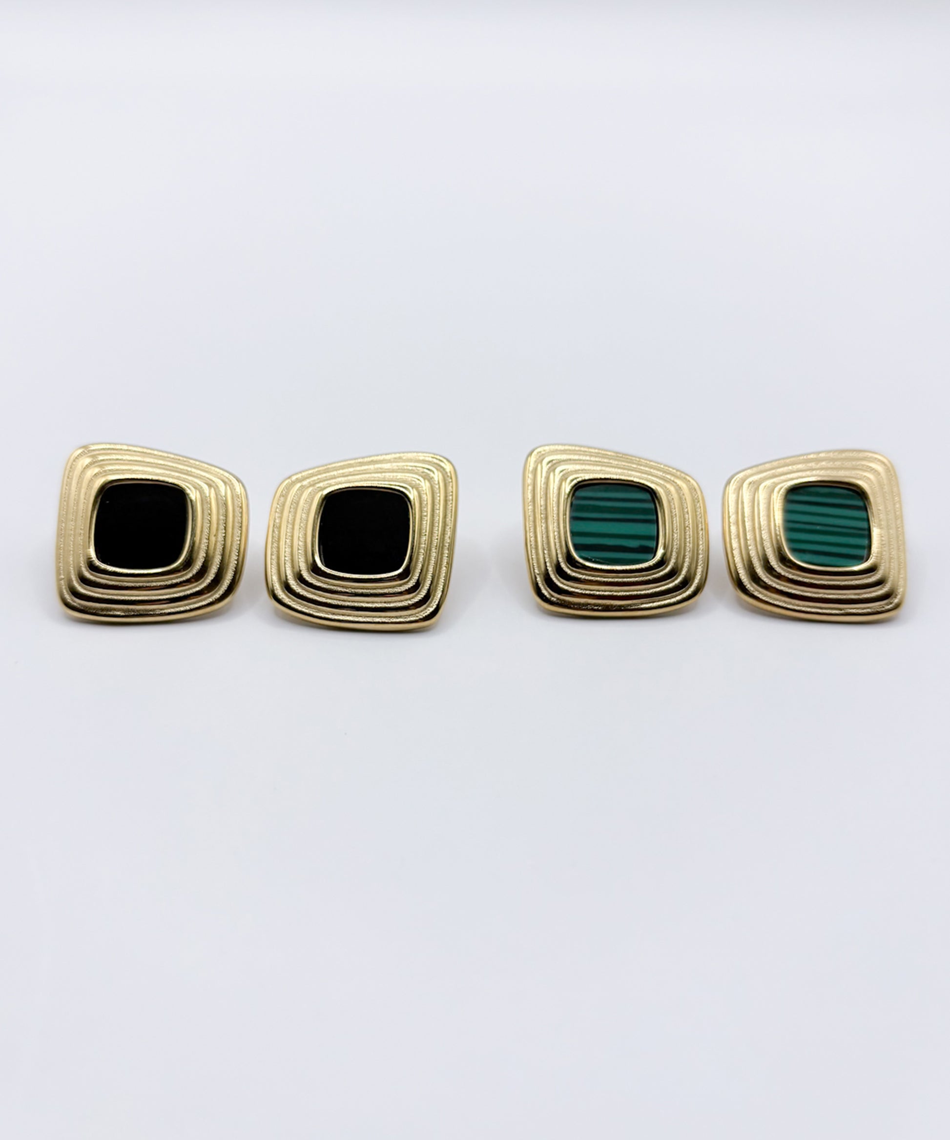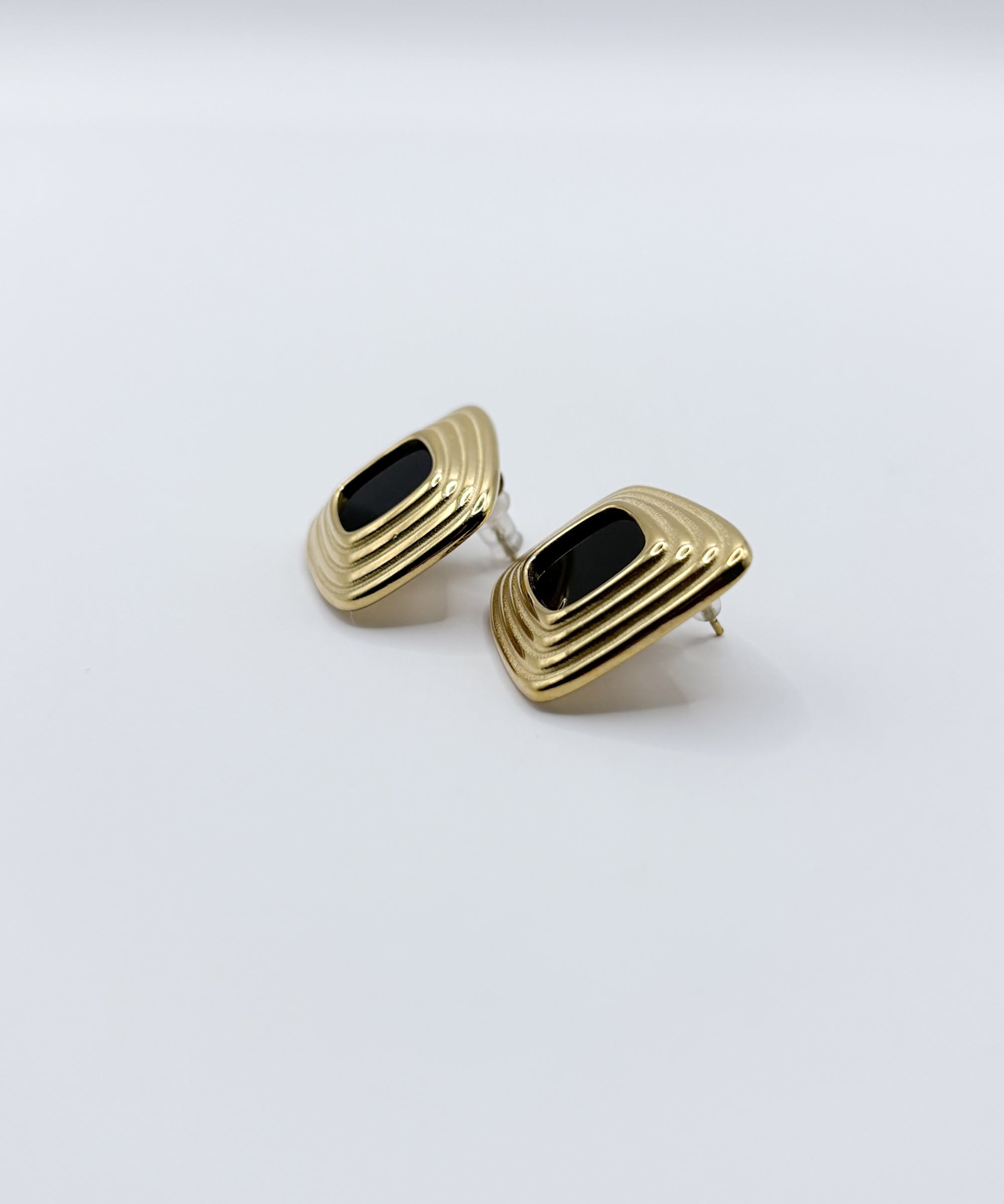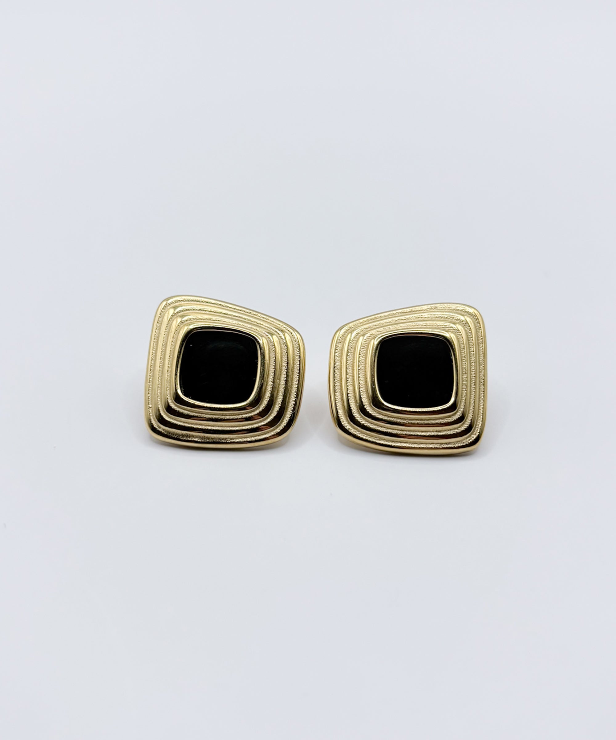 歪みのあるスクエアフォルムが印象的な、ヴィンテージライクなピアス。立体感のあるゴールドフレームに、ストーン風パーツを組み合わせ、耳元に程よいアクセントを。横顔を上品に引き立たせてくれます。