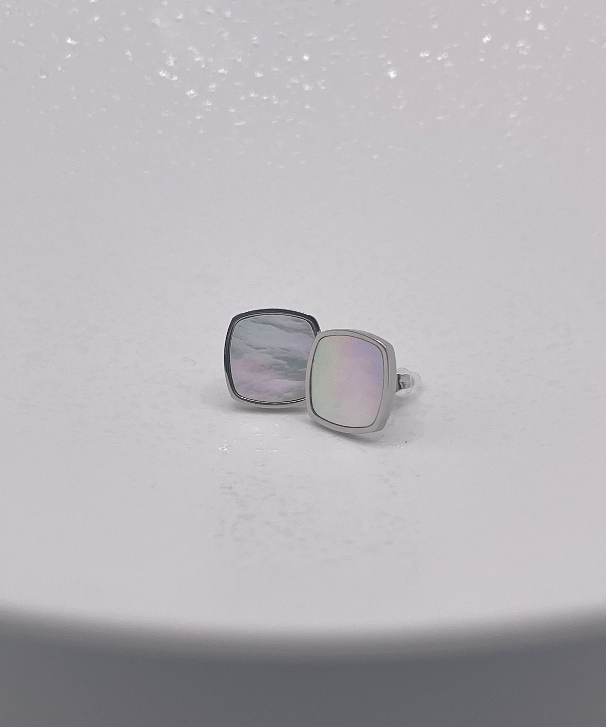 シェルの七色の光が幻想的なスクエアピアス。同型ブラックストーンも取り揃えています。