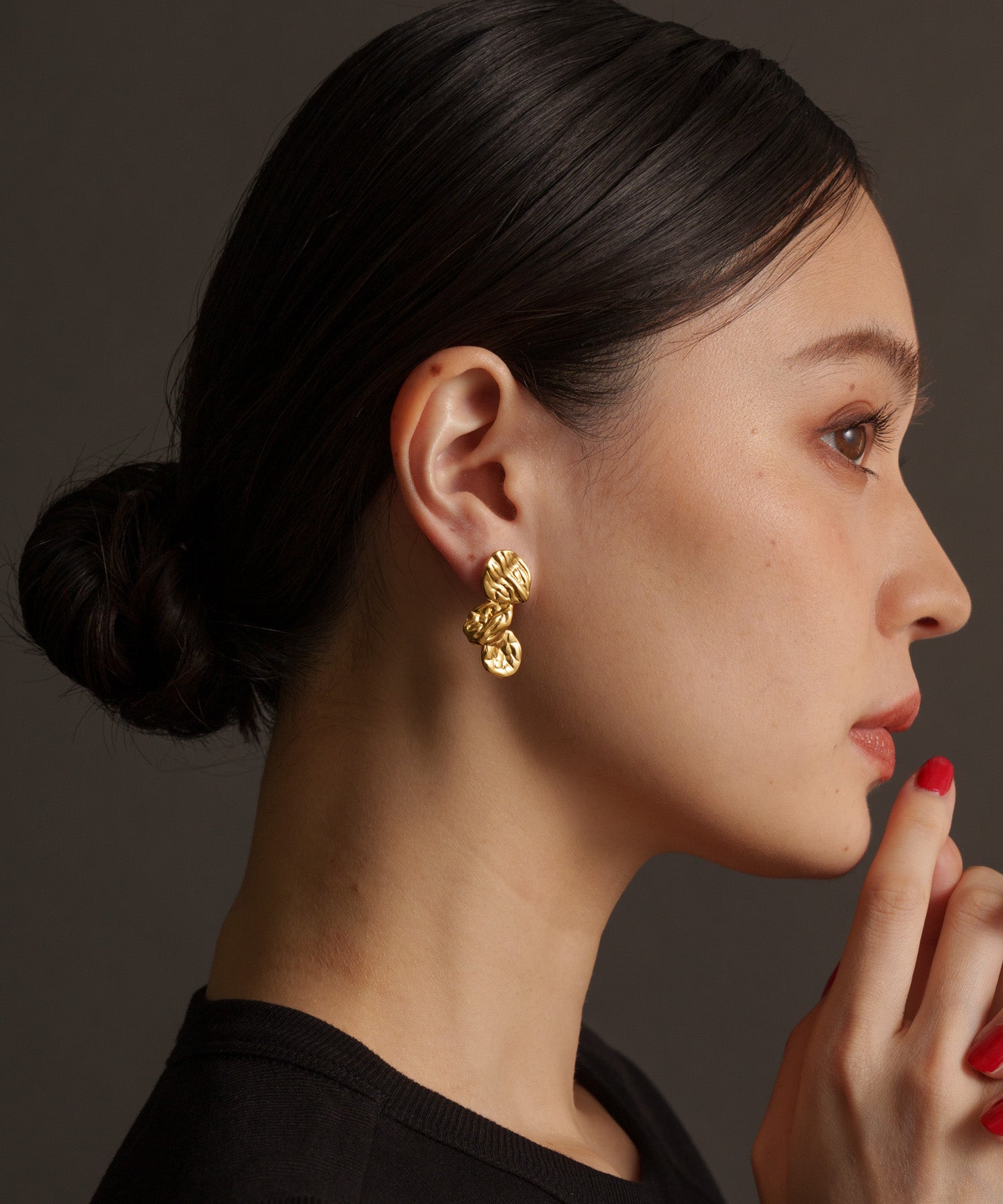 ウェーブの型押しプレートが連結されたピアス。特に横顔を美しく彩ります。