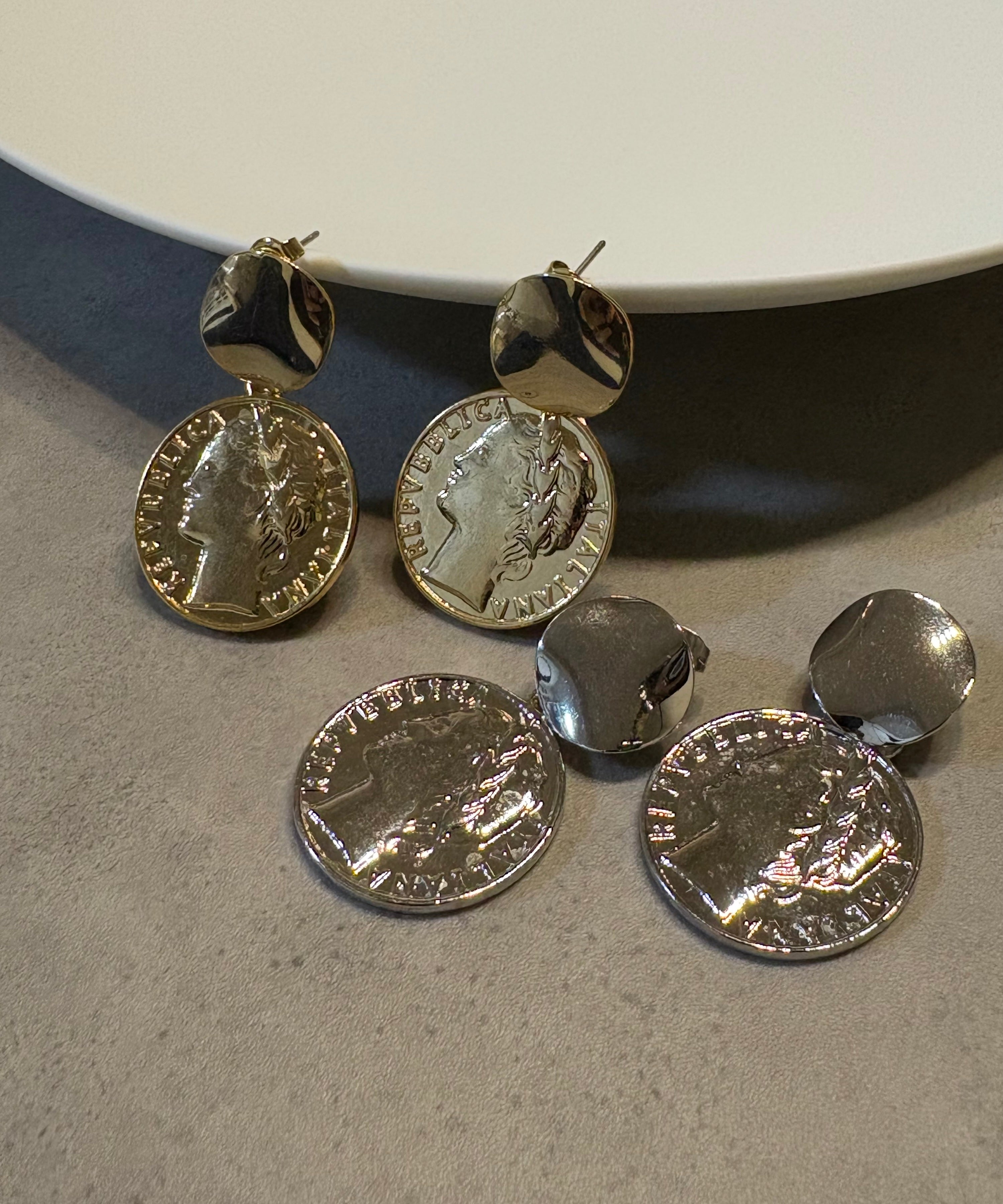 海外のコインをモチーフにしたピアス。上部のプレートが少し折れ曲がり年季が入った雰囲気を演出しています。