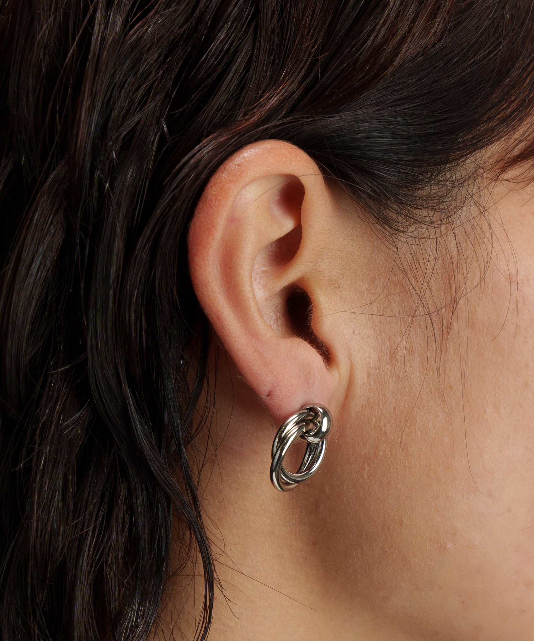 2つの輪が絡み合うさりげないデザイン。耳元で揺れても煩わしさがなく、日常使いに最適なピアスです。