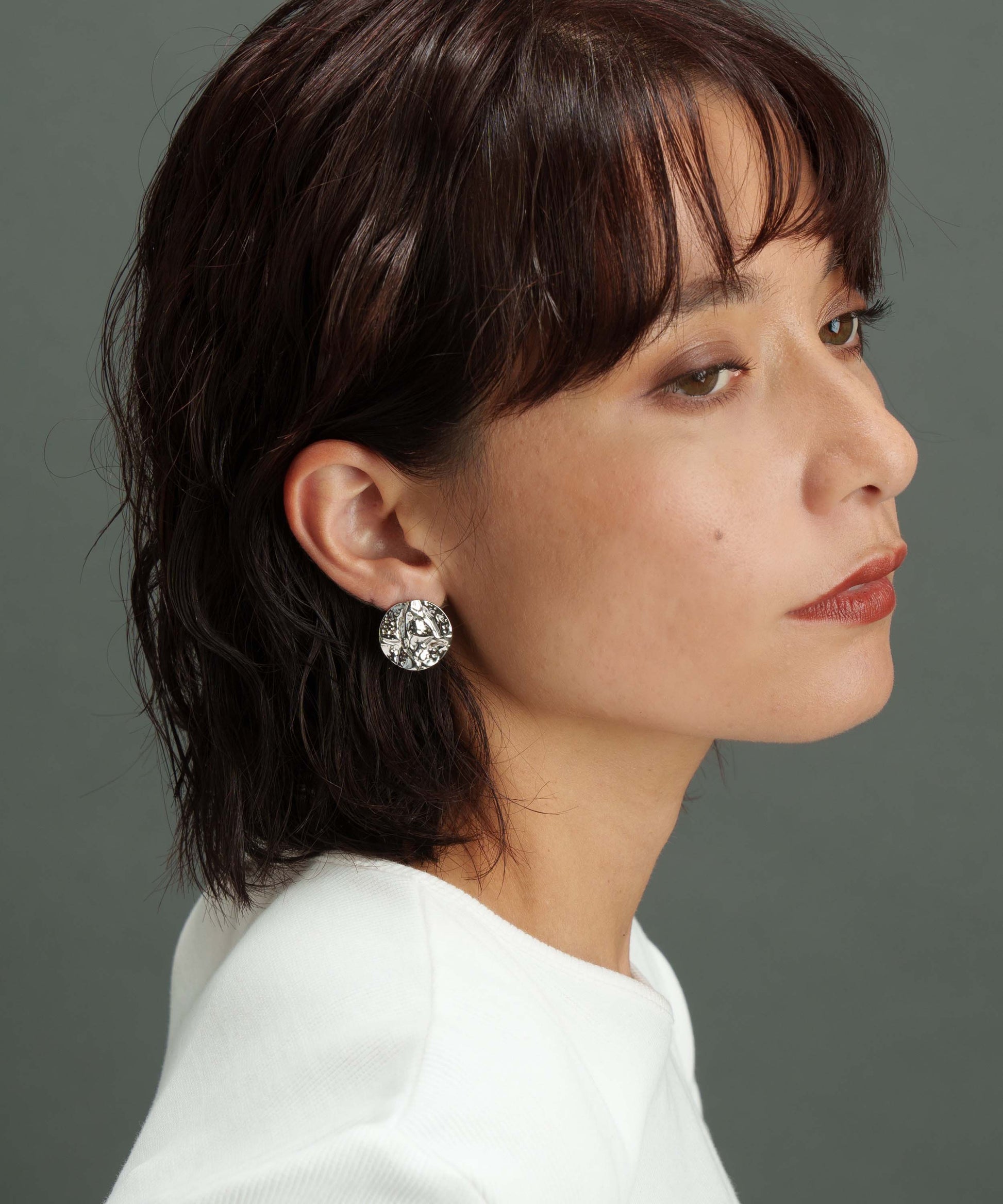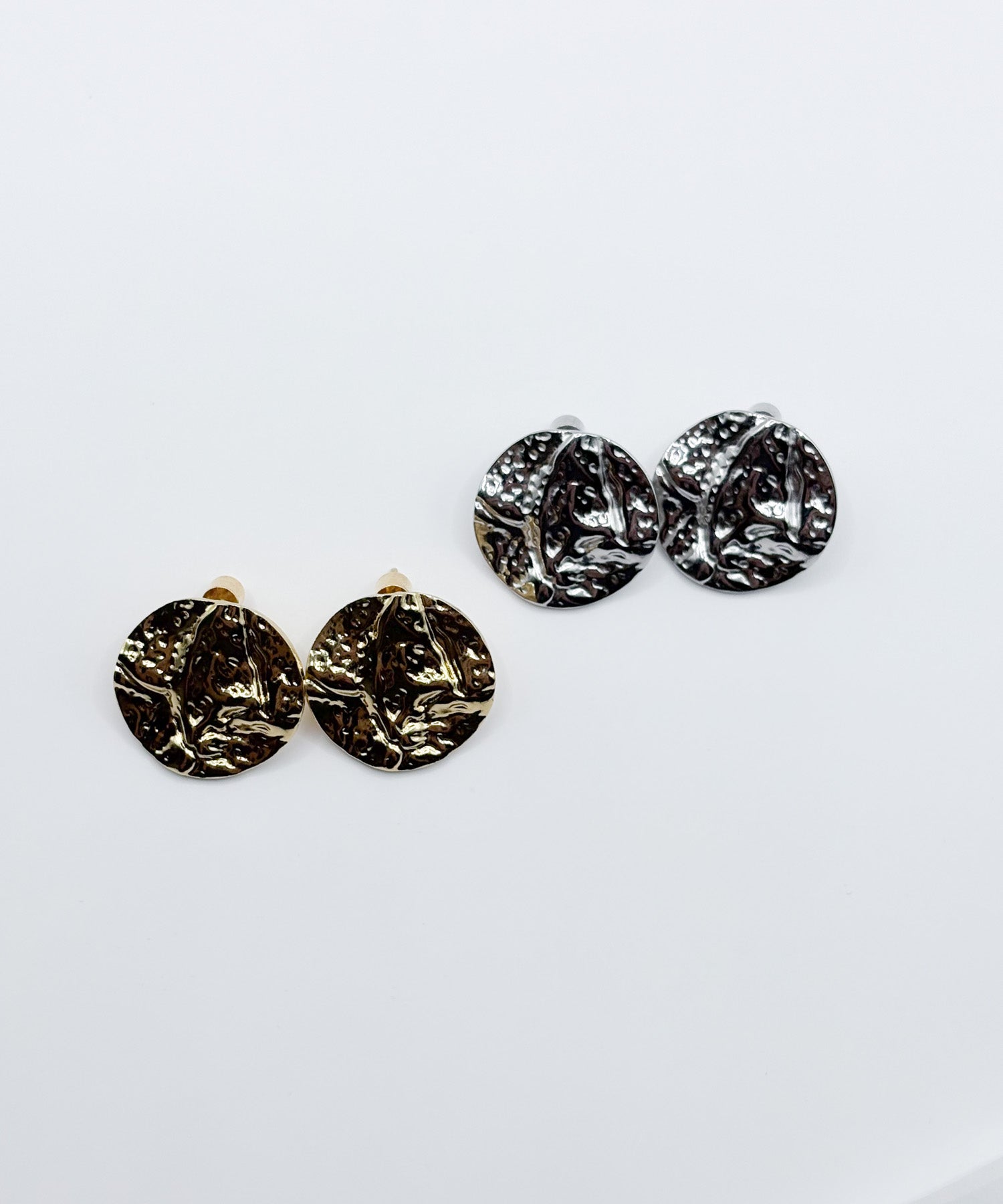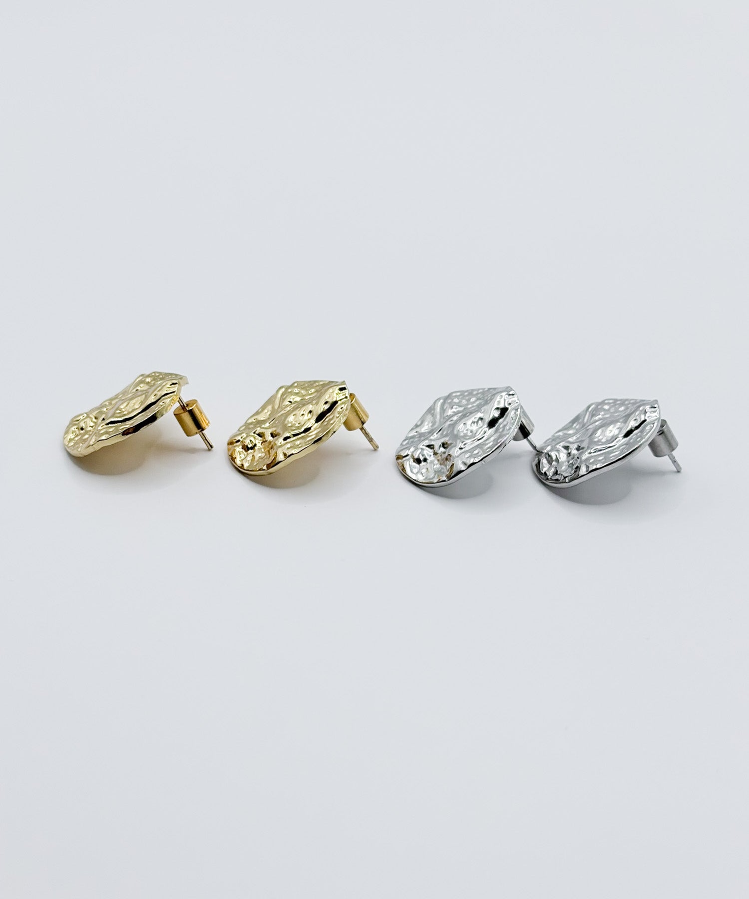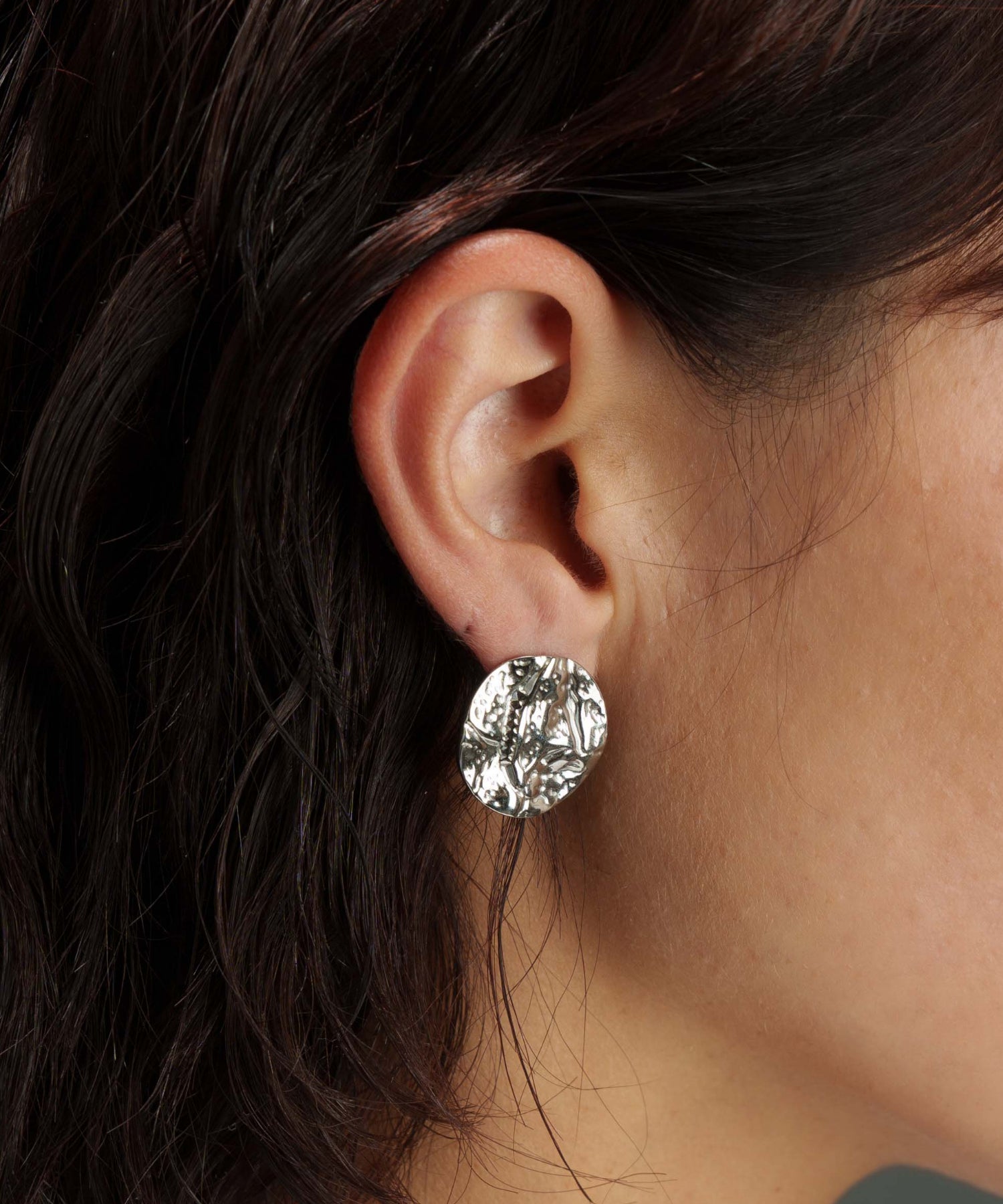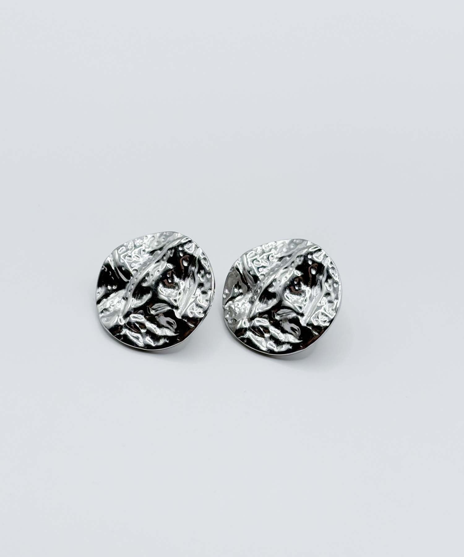 デコボコとした歪なサークルプレートにしわの型押しを施し、表情豊かに仕上げたピアス。シンプルながらおしゃれ見えするデザインです。